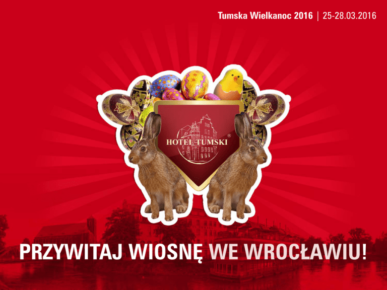Tumska Wielkanoc 2016 | 25-28.03.2016 PRZYWITAJ WIOSNĘ WE WROCŁAWIU! PAKIETY WIELKANOCNE ŚWIĄTECZNY ZAJĄCZEK KOLOROWE PISANKI 3 noclegi 3 noclegi Koszyczek z niespodziankami Koszyczek z niespodziankami Brunch wielkanocny Brunch wielkanocny 2 śniadania 2 śniadania CENA 699 PLN/ os 2 obiadokolacje CENA 869 PLN / os BRUNCH WIELKANOCNY Data: niedziela 27.03.2016 Godzina: 11:00-15:00 • Tradycyjny wielkanocny stół • Degustacja dań wielkanocnych z różnych regionów Polski • Wielkanocne atrakcje dla dzieci! CENA: 159 PLN / os Dzieci do lat 4 gratis! Dzieci do lat 12 rabat 30%! ATRAKCJE DLA DZIECI Zapraszamy do wspólnej zabawy wraz Barką Tumską i Hotelem Tumskim oraz Porą na Animatora. W ramach brunchu wielkanocnego przygotowaliśmy dla najmłodszych poszukiwanie prezentów od zająca, wielkanocne zdobienie jaj, tworzenie kartek wielkanocnych dla najbliższych, malowanie twarzy, balonowy warsztat. Tyle atrakcji, a to wciąż nie wszystko! Nie zabraknie uśmiechu, radości a przede wszystkim zabawy. ZAPRASZAMY! A wśród wielkanocnych atrakcji: Gdzie się schował Wielkanocny Zając? Polowanie na jajka Malowanie pisanek Wielkanocne eko-kartki Malowanie twarzy Balonowy warsztat BRUNCH WIELKANOCNY P R Z Y S TA W K I Wybór regionalnych wędlin i kiełbas Jajka faszerowane musem koperkowym Pasztet z dziczyzny Szynka w cieście – tradycyjne danie z Pomorza Sałatka jarzynowa Fizoły z oscypkiem – tradycyjne danie Podhala Pomidory z rzeżuchą Pieczywo, masło D E S E R Y Babka wrocławska Mazurek Sernik Drożdżowe buchty – tradycyjne danie ze Śląska Sękacz – tradycyjne danie Podlasia Młodzowy kuch z kruszonką – tradycyjne danie z Kujaw N A P O J E Kawa, wybór herbat, gorąca czekolada, soki owocowe Wino domowej selekcji Z U PA Żurek na białej kiełbasie z wędzonką Chrzanówka lanckorońska – tradycyjne danie Małopolski D A N I A G Ł Ó W N E Rolada ze schabu na kapuście kiszonej Pieczona szynka w sosie pieczeniowym Prażnica na wędzonym węgorzu – tradycyjne danie Kaszub Dorsz w cieście ziołowym Ziemniaki gotowane z masłem i koperkiem Złociste kopytka Warzywa blanszowane SMACZNEGO! MENU: PAKIET KOLOROWE PISANKI MENU Wielkanocne delicje MENU Świąteczne przysmaki P R Z Y S T A W K I Terrine drobiowe z sosem miodowo-musztardowym Pieczywo, masło P R Z Y S T A W K I Pasztet z dziczyzny z podgrzybkiem Pieczywo, masło Z U P A Barszcz biały z jajkiem na zakwasie żytnim Z U P A Krem chrzanowy z grzankami D A N I A G Ł Ó W N E Pieczona kaczka z jabłkami Kluski śląskie Kapusta modra z żurawiną D A N I A G Ł Ó W N E Rolada wołowa z jajkiem i ogórkiem na kapuście zasmażanej, pieczone ziemniaki D E S E R Mazurek D E S E R Babka piaskowa z gorącym sosem malinowym Spędź z nami rodzinne Święta! Przywitaj wiosnę we Wrocławiu! Poczuj klimat TUMSKIEJ WIELKANOCY!