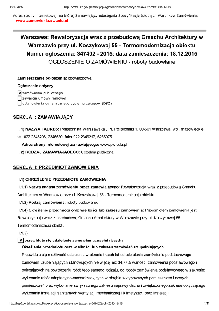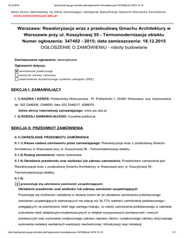 18.12.2015 bzp0.portal.uzp.gov.pl/index.php?ogloszenie=show&pozycja=347402&rok=20151218 Adres strony internetowej, na której Zamawiający udostępnia Specyfikację Istotnych Warunków Zamówienia: www.zamowienia.pw.edu.pl Warszawa: Rewaloryzacja wraz z przebudową Gmachu Architektury w Warszawie przy ul. Koszykowej 55 Termomodernizacja obiektu Numer ogłoszenia: 347402 2015; data zamieszczenia: 18.12.2015 OGŁOSZENIE O ZAMÓWIENIU roboty budowlane Zamieszczanie ogłoszenia: obowiązkowe. Ogłoszenie dotyczy: V zamówienia publicznego zawarcia umowy ramowej ustanowienia dynamicznego systemu zakupów (DSZ) SEKCJA I: ZAMAWIAJĄCY I. 1) NAZWA I ADRES: Politechnika Warszawska , Pl. Politechniki 1, 00661 Warszawa, woj. mazowieckie, tel. 022 2346206, 2346630, faks 022 2346217, 6286075. Adres strony internetowej zamawiającego: www.pw.edu.pl I. 2) RODZAJ ZAMAWIAJĄCEGO: Uczelnia publiczna. SEKCJA II: PRZEDMIOT ZAMÓWIENIA II.1) OKREŚLENIE PRZEDMIOTU ZAMÓWIENIA II.1.1) Nazwa nadana zamówieniu przez zamawiającego: Rewaloryzacja wraz z przebudową Gmachu Architektury w Warszawie przy ul. Koszykowej 55 Termomodernizacja obiektu. II.1.2) Rodzaj zamówienia: roboty budowlane. II.1.4) Określenie przedmiotu oraz wielkości lub zakresu zamówienia: Przedmiotem zamówienia jest Rewaloryzacja wraz z przebudową Gmachu Architektury w Warszawie przy ul. Koszykowej 55 Termomodernizacja obiektu. II.1.5) V przewiduje się udzielenie zamówień uzupełniających: Określenie przedmiotu oraz wielkości lub zakresu zamówień uzupełniających Przewiduje się możliwość udzielenia w okresie trzech lat od udzielenia zamówienia podstawowego zamówień uzupełniających stanowiących nie więcej niż 34,77% wartości zamówienia podstawowego i polegających na powtórzeniu robót tego samego rodzaju, co roboty zamówienia podstawowego w zakresie: wykonanie robót adaptacyjnomodernizacyjnych w obrębie wytypowanych pomieszczeń i nowych pomieszczeń oraz wykonanie zwiększonego zakresu naprawy dachu i zwiększonego zakresu dotyczącego wykonania instalacji sanitarnych wentylacji mechanicznej i klimatyzacji oraz instalacji http://bzp0.portal.uzp.gov.pl/index.php?ogloszenie=show&pozycja=347402&rok=20151218 1/11 18.12.2015 bzp0.portal.uzp.gov.pl/index.php?ogloszenie=show&pozycja=347402&rok=20151218 elektroenergetycznych. Wykonanie robót instalacyjnych wraz z wykonaniem robót poinstalacyjnych związanych z włączeniem instalacji dla pomieszczeń adaptowanych w infrastrukturę całego obiektu. Zamówienia uzupełniające będą realizowane po zaistnieniu następujących okoliczności: spełnienie przesłanek ustawowych. II.1.6) Wspólny Słownik Zamówień (CPV): 45.45.30.007, 45.43.00.000, 45.44.00.000, 44.23.00.001, 43.41.00.004, 45.26.00.007, 45.26.24.005, 45.62.63.004, 45.42.20.001, 45.30.00.000, 45.31.10.003, 45.31.23.110. II.1.7) Czy dopuszcza się złożenie oferty częściowej: nie. II.1.8) Czy dopuszcza się złożenie oferty wariantowej: nie. II.2) CZAS TRWANIA ZAMÓWIENIA LUB TERMIN WYKONANIA: Zakończenie: 31.07.2016. SEKCJA III: INFORMACJE O CHARAKTERZE PRAWNYM, EKONOMICZNYM, FINANSOWYM I TECHNICZNYM III.1) WADIUM Informacja na temat wadium: Wykonawca jest zobowiązany do wniesienia wadium w wysokości: 80 000,00 zł Wadium musi być wniesione przed upływem terminu składania ofert. III.2) ZALICZKI III.3) WARUNKI UDZIAŁU W POSTĘPOWANIU ORAZ OPIS SPOSOBU DOKONYWANIA OCENY SPEŁNIANIA TYCH WARUNKÓW III. 3.1) Uprawnienia do wykonywania określonej działalności lub czynności, jeżeli przepisy prawa nakładają obowiązek ich posiadania Opis sposobu dokonywania oceny spełniania tego warunku Ocena spełnienia powyższego warunku zostanie dokonana wg formuły spełnia/nie spełnia na podstawie złożonych przez Wykonawców oświadczenia wymienionego w pkt. 7.1.1. SIWZ. III.3.2) Wiedza i doświadczenie Opis sposobu dokonywania oceny spełniania tego warunku Warunek ten zostanie spełniony, jeżeli Wykonawca wykaże, że zrealizował (rozpoczął i zakończył) w okresie ostatnich 5 lat, przed upływem terminu składania ofert, a jeżeli okres prowadzenia działalności jest krótszy w tym okresie, zamówienia rodzajowo porównywalne z przedmiotem niniejszego przetargu, tj.: wykonanie co najmniej 3 robót budowlanych polegających na budowie obiektu, przebudowie lub remoncie budynku użyteczności publicznej, w tym co najmniej jednego zadania wykonanego w obiekcie wpisanym do rejestru zabytków; każde z zadań o wartości co najmniej 3 000 000,00 zł brutto. Ocena spełnienia powyższego warunku zostanie dokonana wg formuły spełnia/nie spełnia na podstawie złożonych przez Wykonawców oświadczenia i dokumentów wymienionych w pkt. 7.1.1. i 7.1.2. SIWZ. III.3.3) Potencjał techniczny http://bzp0.portal.uzp.gov.pl/index.php?ogloszenie=show&pozycja=347402&rok=20151218 2/11 18.12.2015 bzp0.portal.uzp.gov.pl/index.php?ogloszenie=show&pozycja=347402&rok=20151218 Opis sposobu dokonywania oceny spełniania tego warunku Ocena spełnienia powyższego warunku zostanie dokonana wg formuły spełnia/nie spełnia na podstawie złożonych przez Wykonawców oświadczenia wymienionego w pkt. 7.1.1. SIWZ. III.3.4) Osoby zdolne do wykonania zamówienia Opis sposobu dokonywania oceny spełniania tego warunku Warunek ten zostanie spełniony, jeżeli Wykonawca ma do dyspozycji odpowiednio wykwalifikowane osoby w celu obsadzenia stanowiska kierownika Budowy z 5letnim stażem pracy na stanowisku kierownika budowy, z uprawnieniami do kierowania robotami budowlanymi w zakresie wystarczającym do wykonania zadania zgodnie z Ustawą Prawo Budowlane, w tym zgodne z zapisami Rozporządzenia Ministra Kultury i Dziedzictwa Narodowego z dnia 27 lipca 2011 r. w sprawie prowadzenia prac konserwatorskich, prac restauratorskich, robót budowlanych, badań konserwatorskich, badań architektonicznych i innych działań przy zabytku wpisanym do rejestru zabytków oraz badań archeologicznych Ocena spełnienia powyższego warunku zos