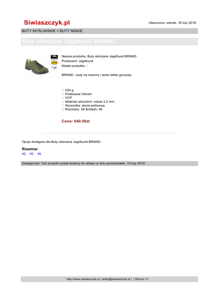 Siwiaszczyk.pl BUTY MYŚLIWSKIE > BUTY NISKIE Buty skórzane Jagdhund BRAND Nazwa produktu: Buty skórzane Jagdhund BRAND Producent: Jagdhund Model produktu: BRAND - buty na rowniny i teren lekko gorzysty. 520 g Podeszwa Vibram VCP Material wierzchni: nubuk 2,2 mm Wysciolka: skora anilinowa Rozmiary: 38 – 46 Cena: 640.00zł Opcje dostępne dla Buty skórzane Jagdhund BRAND : Rozmiar 43, 45, 46. Dostępność: Ten produkt został dodany do sklepu w dniu poniedziałek, 15 luty 2016 http://www.siwiaszczyk.pl | [email protected] | | Strona 1/1 Utworzono: wtorek, 16 luty 2016