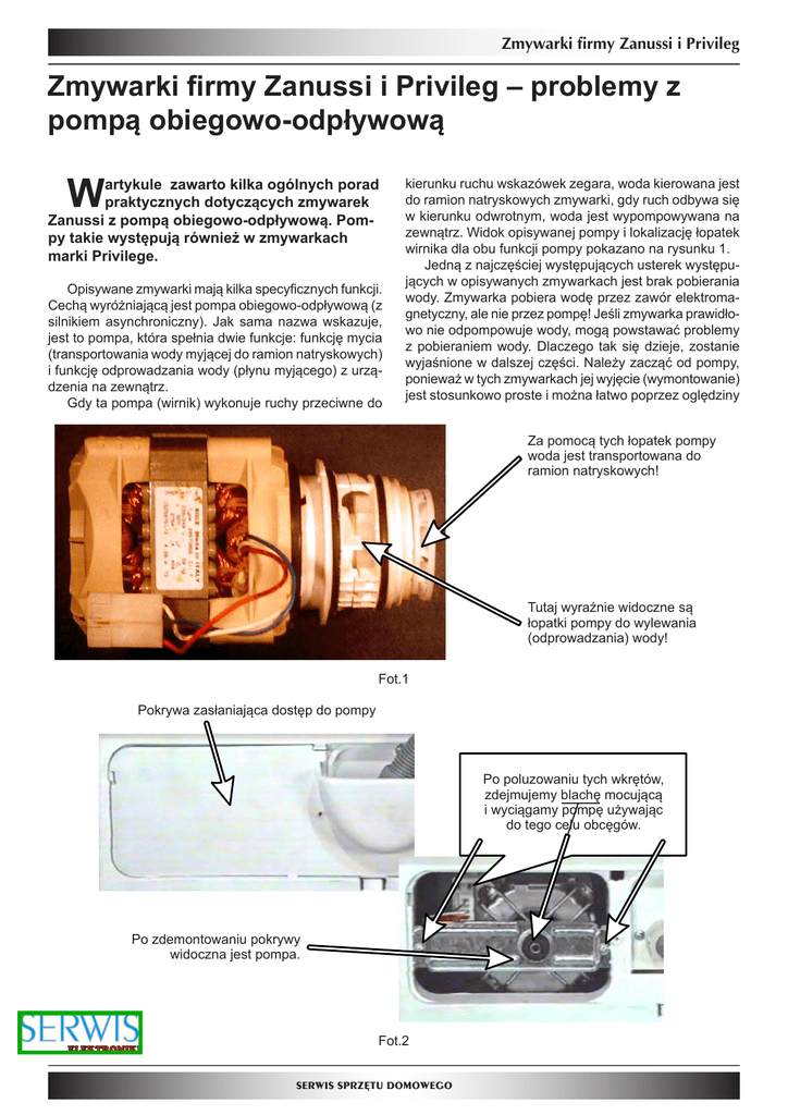 Zmywarki firmy Zanussi i Privileg Zmywarki firmy Zanussi i Privileg – problemy z pompą obiegowo-odpływową W artykule zawarto kilka ogólnych porad praktycznych dotyczących zmywarek Zanussi z pompą obiegowo-odpływową. Pompy takie występują również w zmywarkach marki Privilege. Opisywane zmywarki mają kilka specyficznych funkcji. Cechą wyróżniającą jest pompa obiegowo-odpływową (z silnikiem asynchroniczny). Jak sama nazwa wskazuje, jest to pompa, która spełnia dwie funkcje: funkcję mycia (transportowania wody myjącej do ramion natryskowych) i funkcję odprowadzania wody (płynu myjącego) z urządzenia na zewnątrz. Gdy ta pompa (wirnik) wykonuje ruchy przeciwne do kierunku ruchu wskazówek zegara, woda kierowana jest do ramion natryskowych zmywarki, gdy ruch odbywa się w kierunku odwrotnym, woda jest wypompowywana na zewnątrz. Widok opisywanej pompy i lokalizację łopatek wirnika dla obu funkcji pompy pokazano na rysunku 1. Jedną z najczęściej występujących usterek występujących w opisywanych zmywarkach jest brak pobierania wody. Zmywarka pobiera wodę przez zawór elektromagnetyczny, ale nie przez pompę! Jeśli zmywarka prawidłowo nie odpompowuje wody, mogą powstawać problemy z pobieraniem wody. Dlaczego tak się dzieje, zostanie wyjaśnione w dalszej części. Należy zacząć od pompy, ponieważ w tych zmywarkach jej wyjęcie (wymontowanie) jest stosunkowo proste i można łatwo poprzez oględziny Za pomoc¹ tych ³opatek pompy woda jest transportowana do ramion natryskowych! Tutaj wyraŸnie widoczne s¹ ³opatki pompy do wylewania (odprowadzania) wody! Fot.1 Pokrywa zas³aniaj¹ca dostêp do pompy Po poluzowaniu tych wkrêtów, zdejmujemy blachê mocuj¹c¹ i wyci¹gamy pompê u¿ywaj¹c do tego celu obcêgów. Po zdemontowaniu pokrywy widoczna jest pompa. Fot.2 SERWIS SPRZĘTU DOMOWEGO Zmywarki firmy Zanussi i Privileg £opatki wirnika pompy spustowej, w prawid³owym stanie Przyk³ad uszkodzenia ³opatek wirnika pompy odp³ywowej – widoczne œciêcia Fot.4 określonego poziomu wody w zbiorniku podłogowym. Gdyby chciał to zrobić, taki błąd nie ma szans. Taka sytuacja mogłaby mieć miejsce, gdyby określona ilość wody jeszcze została pobrana, aż żądany poziom wody zostałby osiągnięty. Fot.3 dokonać ekspertyzy jej funkcjonowania. W tym celu musimy naszą uwagę skierować na ściankę tylną zmywarki. Tutaj mamy do zdjęcia pokrywę pokazaną na fotografii 2 po lewej stronie. Po jej zdemontowaniu uzyskujemy dostęp do pompy. Po poluzowaniu wkrętów (pokazanych na fotografii 2 po prawej stronie, zdejmujemy blachę mocującą i wyciągamy pompę za pomocą obcęgów. Teraz można przyjrzeć się łopatkom wirnika pompy. Na fotografii 3 widać łopatki pompy spustowej, które są w prawidłowym (nieuszkodzonym) stanie. Jeśli jednakże filtry nie są prawidłowo założone (ewentualnie uszkodzone – „dziurawe”), ciała obce przedostają się do pompy powodując uszkodzenia łopatek pompy odpływowej. Niestety, to jest sytuacja dość często spotykana. Fotografia 4 pokazuje bardzo nieprzyjemną sytuację – łopatki wirnika pompy są ścięte! Często zdarza się, że wszystkie łopatki wirnika pompy zostały ścięte, co czyni niemożliwym wypompowywanie wody! Czasami jednak „tylko” kilka łopatek zostało ściętych. Wydajność odpompowywania wody staje się wówczas ograniczona, proporcjonalnie do stopnia uszkodzenia. Gdy woda nie jest wypompowywana prawidłowo, podczas kolejnego pobierania wody (przez elektrozawór) określona (wynikająca ze specyfikacji zmywarki) ilość wody powinna zostać pobrana. Ale ponieważ w dalszym ciągu w zmywarce znajdują się jeszcze resztki wody, może zatem dojść do aktywowania urządzenia bezpieczeństwa na zaworze elektromagnetycznym. Na skutek tego następuje „odmowa” (blokada) dalszego pobierania wody. To nie musi zawsze być z powodu zaworu elektromagnetycznego, gdy zmywarka nie pobiera wody. Przełącznik poziomu (niestety) nie może obejść się bez Teraz należy ponownie zamontować pompę w zmywarce. Jest niezbędnie konieczne, natłuszczenie 3 uszczelek pierścieniowych typu „O” (Ring-O) pokazanych na fotografii 5 i krawędzi otworu, w który jest wprowadzana pompa, gdyż uszczelki te są stosunkowo grube (a dzięki temu skutecznie szczelne) i nie można tych gumowych pierścieni łatwo przesuwać (stawiają opór). Wszystko musi pójść gładko i czysto, a nade wszystko skutecznie, aby zapewnić prawidłową szczelność. SERWIS SPRZĘTU DOMOWEGO Uszczelki pierœcieniowe typu „O” Fot.5 }