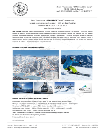 Biuro Turystyczne „DROMADER Travel” zaprasza na wyjazd narciarsko snowboardowy – Zell am See (Austria) w dniach 18.01.2014 – 26.01.2014 www.dromader-travel.pl Zell am See atrakcyjne jne miejsce wypoczynku dla turystów zwłaszcza w okresie zimowym. To sportowe i kulturalne miejsce spotkań w regionie. Wyciągi narciarskie schodzą niemalże do centrum miejscowości. Zell am See położone jest nad wielkim jeziorem, z pięknym deptakiem, sklepami, restauracjami, barami i dyskotekami. Z licznych wyciągów można tu podziwiać zapierające dech w piersiach wspaniale widoki. W centrum znajdują się kryte i odkryte lodowisko, korty tenisowe, basen z centrum fitness, sauna i gabinet masażu. Miasto położone jest w niewielkiej n odległości do Kaprun. Zell am See jest idealnym miejscem do zabawy , miejscem em na piękne i aktywne wakacje. Ośrodek narciarski do dyspozycji grupy: grupy Ośrodek narciarski Schmitten Zell am See - Kaprun Oznakowane trasy narciarskie (77 km) w tym: łatwe 25 km, średnie 27 km, trudne 25 km. Wyciągi: 5 wyciągów orczykowych, 7 krzesełkowych, 5 linowe (gondole), 2 linowe - duże wagony. wagony Wysokości ysokości od 758 do 1949 m n.p.m. (70% stoków powyżej 1000 m n.p.m.) Najdłuższaa trasa "Schutt" - 6,2 km Różnica óżnica poziomów 1190 m, średni stopień trudności. trudności Najtrudniejsza trasa "Trass" - 4,2 km, różnica poziomów 900 m. Trasa zawodów Pucharu Świata - świetne świet warunki do dozwolonej jazdy poza trasami. Ok. 50 km tras dośnieżanych za pomocą armatek. Duża część tras otoczona lasami. www.schmitten.at Zakwaterowanie: Oferta obejmuje 6 noclegów w Hostelu położonym nad malowniczym jeziorem Zeller see w miejscowości Zell am See. Pokoje 3,4. osobowe z łazienkami. Do dyspozycji gości: sala telewizyjna, sala rekreacyjna (tenis stołowy), pomieszczenie do przechowywania i suszenia sprzętu narciarskiego, Internet Wi-Fi. Wyżywienie: Śniadania w formie szwedzkiego bufetu. Obiadokolacje składające się z dwóch dań oraz deseru. W cenę oferty wkalkulowana jest także obiadokolacja w dniu wyjazdu z Villach. Opieka: Wykwalifikowana kadra pedagogiczna. pedagogiczna Opieka instruktora narciarskiego. narciarskiego Świadczenia: Ubezpieczenie NNW (uszczerbek na zdrowiu). zdrowiu) KL Koszty leczenia. Istnieje możliwość wykupienia poszerzonego pakietu ubezpieczenia (np.: ubezpieczenie sprzętu narciarskiego). W tym celu prosimy o kontakt z Biurem Turystycznym ”DROMADER travel”. t Fakultatywne atrakcje wyjazdu: Możliwość ożliwość skorzystania z parku wodnego Możliwość korzystania z ośrodka sportowego – lodowisko. Transport: Przejazd autokarem (autokar pozostaje do dyspozycji grupy na miejscu). miejscu) Koszt uczestnictwa: 1580 zł Cena nie obejmuje kosztu karnetów. Karnety w cenie grupowej (6 dni): 112 EUR /osoba + 2 EUR kaucja zwrotna za karnet UWAGA!! Warunkiem uczestnictwa jest wpłata zaliczki na konto BT ”DROMADER travel” w wysokości 200 zł do 15.10.2013r. oraz wypełnienie karty uczestnika pobranej ze strony biura www.dromader-travel.pl Wszelkich niezbędnych informacji udzielimy Państwu pod numerem tel. 604 209 215; 42 659 75 77, lub ub pod adresem email: [email protected] www.dromader-travel.pl Dziękujemy za zainteresowanie ofertą Biura Turystycznego „DROMADER travel” ravel”