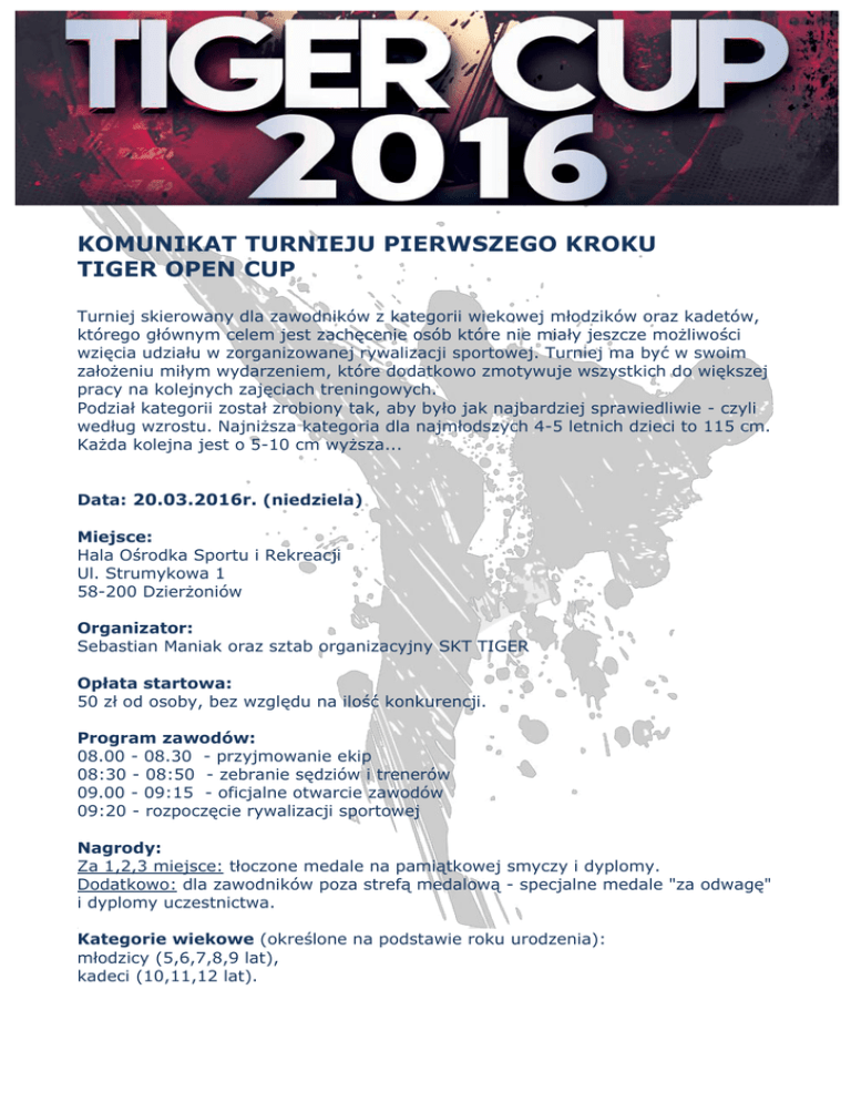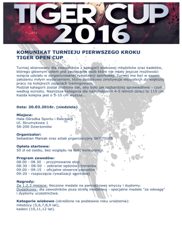 KOMUNIKAT TURNIEJU PIERWSZEGO KROKU TIGER OPEN CUP Turniej skierowany dla zawodników z kategorii wiekowej młodzików oraz kadetów, którego głównym celem jest zachęcenie osób które nie miały jeszcze możliwości wzięcia udziału w zorganizowanej rywalizacji sportowej. Turniej ma być w swoim założeniu miłym wydarzeniem, które dodatkowo zmotywuje wszystkich do większej pracy na kolejnych zajęciach treningowych. Podział kategorii został zrobiony tak, aby było jak najbardziej sprawiedliwie - czyli według wzrostu. Najniższa kategoria dla najmłodszych 4-5 letnich dzieci to 115 cm. Każda kolejna jest o 5-10 cm wyższa... Data: 20.03.2016r. (niedziela) Miejsce: Hala Ośrodka Sportu i Rekreacji Ul. Strumykowa 1 58-200 Dzierżoniów Organizator: Sebastian Maniak oraz sztab organizacyjny SKT TIGER Opłata startowa: 50 zł od osoby, bez względu na ilość konkurencji. Program zawodów: 08.00 - 08.30 - przyjmowanie ekip 08:30 - 08:50 - zebranie sędziów i trenerów 09.00 - 09:15 - oficjalne otwarcie zawodów 09:20 - rozpoczęcie rywalizacji sportowej Nagrody: Za 1,2,3 miejsce: tłoczone medale na pamiątkowej smyczy i dyplomy. Dodatkowo: dla zawodników poza strefą medalową - specjalne medale "za odwagę" i dyplomy uczestnictwa. Kategorie wiekowe (określone na podstawie roku urodzenia): młodzicy (5,6,7,8,9 lat), kadeci (10,11,12 lat). KONKURENCJE: - techniki szybkościowe (kopnięcie stopą w tarczę - 15s prawa i 15s lewa noga), - techniki specjalne (technika dosiężna - Twimyo Nopi Apcha Busigi), - walki soft (kalaki) - dopuszczone dźgnięcia w przód, ręce blokują, głowa 2 p., KATEGORIE: młodzicy (dziewczęta i chłopcy): -115cm, -120cm, -125cm,, -130cm, -135cm, -140cm, +140cm. kadeci (dziewczęta i chłopcy): -135cm, -140cm, -145cm, -150cm, -155cm, +155cm WARUNKI UDZIAŁU: Zawodnicy: W zawodach mogą wziąć udział wyłącznie zawodnicy spełniający poniższe warunki: - opłata startowa, - zrzeszeni w klubach, - posiadanie białego doboku lub długich spodni od dresu i białej koszulki - polisa NNW dla zawodników (zapewnia klub macierzysty). Organizator nie ponosi odpowiedzialności w przypadku wypadków i ich następstw. - zgoda rodziców na udział w zawodach, - zgłoszenie zawodnika w terminie i na obowiązującej karcie zgłoszenia, Trenerzy: Trenerów obowiązuje zmienne obuwie sportowe, imienny identyfikator oraz czerwona koszulka trenerska ITF. Sędziowie: Sędziów obowiązuje regulaminowy strój sędziowski - czarne spodnie, biała koszula, krawat ITF, imienny identyfikator ZGŁOSZENIA: 1. Zgłoszenie z podaniem sekcji (miasta) 2. Logo klubowe: Do zgłoszenia na adres mailowy prosimy dołączyć logo (w jak najlepszej rozdzielczości). Będzie ono widoczne na ekranach tv obok nazwiska zawodnika z danego klubu. 3. Faktyczne dane: Z uwagi na zastosowanie nowego sytemu informatycznego do obsługi zawodów, prosimy o dokładne sprawdzenie danych zawodników na wysyłanych kartach zgłoszeń. Do każdego zawodnika podajemy dokładny wzrost. 4. Termin zgłoszeń: Kartę zgłoszeń ekipy wraz z logo, wysyłamy do 14.03.2016r.(poniedziałek) na adres e-mail: [email protected]. Przypominamy też, iż liczba zawodników zgłoszonych w karcie jest wiążąca. POZOSTAŁE INFORMACJE: Porządek: Podczas trwania zawodów nad bezpieczeństwem uczestników będzie czuwała służba ochrony. Na część hali, gdzie będzie toczyła się rywalizacja będą wpuszczani tylko zawodnicy, których aktualnie rozgrywają się konkurencje oraz osoby z identyfikatorami. Pozostałe osoby będą musiały się zadowolić miejscem na trybunach. Sprzęt ochronny: Organizator zapewnia sprzęt ochronny. Opieka medyczna: Organizator zapewnia profesjonalną ekipę medyczną. Catering: Podczas trwania zawodów obok hali będzie możliwość zakupienia ciepłych posiłków. Jeżeli dany klub chce dokonać wcześniejszej grupowej rezerwacji prosimy o taką informację pod numerem telefonu 501 073 411. Uwagi: O sprawach nie ujętych w niniejszym komunikacie decyduje Dyrektor Zawodów. Organizator ma prawo do łączenia kategorii w przypadku niewystarczającej liczby zawodników. Wszelkie protesty i zażalenia zgłasza - TYLKO - kierownik drużyny do Dyrektora Zawodów. SERDECZNIE ZAPRASZAMY !!! SZTAB ORGANIZACYJNY SKTTIGER