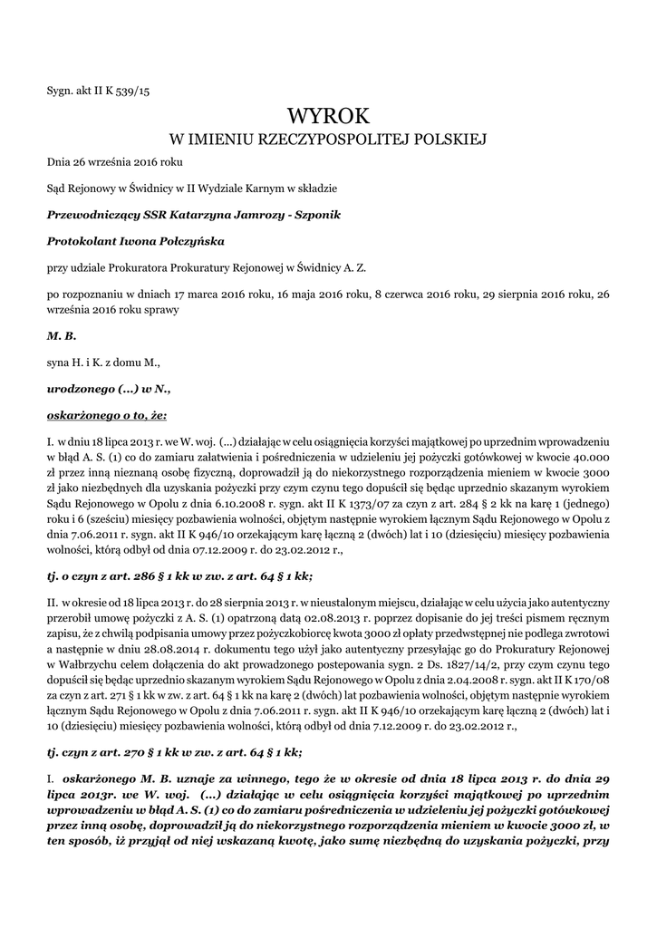 Sygn. akt II K 539/15 WYROK W IMIENIU RZECZYPOSPOLITEJ POLSKIEJ Dnia 26 września 2016 roku Sąd Rejonowy w Świdnicy w II Wydziale Karnym w składzie Przewodniczący SSR Katarzyna Jamrozy - Szponik Protokolant Iwona Połczyńska przy udziale Prokuratora Prokuratury Rejonowej w Świdnicy A. Z. po rozpoznaniu w dniach 17 marca 2016 roku, 16 maja 2016 roku, 8 czerwca 2016 roku, 29 sierpnia 2016 roku, 26 września 2016 roku sprawy M. B. syna H. i K. z domu M., urodzonego (...) w N., oskarżonego o to, że: I. w dniu 18 lipca 2013 r. we W. woj. (...) działając w celu osiągnięcia korzyści majątkowej po uprzednim wprowadzeniu w błąd A. S. (1) co do zamiaru załatwienia i pośredniczenia w udzieleniu jej pożyczki gotówkowej w kwocie 40.000 zł przez inną nieznaną osobę fizyczną, doprowadził ją do niekorzystnego rozporządzenia mieniem w kwocie 3000 zł jako niezbędnych dla uzyskania pożyczki przy czym czynu tego dopuścił się będąc uprzednio skazanym wyrokiem Sądu Rejonowego w Opolu z dnia 6.10.2008 r. sygn. akt II K 1373/07 za czyn z art. 284 § 2 kk na karę 1 (jednego) roku i 6 (sześciu) miesięcy pozbawienia wolności, objętym następnie wyrokiem łącznym Sądu Rejonowego w Opolu z dnia 7.06.2011 r. sygn. akt II K 946/10 orzekającym karę łączną 2 (dwóch) lat i 10 (dziesięciu) miesięcy pozbawienia wolności, którą odbył od dnia 07.12.2009 r. do 23.02.2012 r., tj. o czyn z art. 286 § 1 kk w zw. z art. 64 § 1 kk; II. w okresie od 18 lipca 2013 r. do 28 sierpnia 2013 r. w nieustalonym miejscu, działając w celu użycia jako autentyczny przerobił umowę pożyczki z A. S. (1) opatrzoną datą 02.08.2013 r. poprzez dopisanie do jej treści pismem ręcznym zapisu, że z chwilą podpisania umowy przez pożyczkobiorcę kwota 3000 zł opłaty przedwstępnej nie podlega zwrotowi a następnie w dniu 28.08.2014 r. dokumentu tego użył jako autentyczny przesyłając go do Prokuratury Rejonowej w Wałbrzychu celem dołączenia do akt prowadzonego postepowania sygn. 2 Ds. 1827/14/2, przy czym czynu tego dopuścił się będąc uprzednio skazanym wyrokiem Sądu Rejonowego w Opolu z dnia 2.04.2008 r. sygn. akt II K 170/08 za czyn z art. 271 § 1 kk w zw. z art. 64 § 1 kk na karę 2 (dwóch) lat pozbawienia wolności, objętym następnie wyrokiem łącznym Sądu Rejonowego w Opolu z dnia 7.06.2011 r. sygn. akt II K 946/10 orzekającym karę łączną 2 (dwóch) lat i 10 (dziesięciu) miesięcy pozbawienia wolności, którą odbył od dnia 7.12.2009 r. do 23.02.2012 r., tj. czyn z art. 270 § 1 kk w zw. z art. 64 § 1 kk; I. oskarżonego M. B. uznaje za winnego, tego że w okresie od dnia 18 lipca 2013 r. do dnia 29 lipca 2013r. we W. woj. (...) działając w celu osiągnięcia korzyści majątkowej po uprzednim wprowadzeniu w błąd A. S. (1) co do zamiaru pośredniczenia w udzieleniu jej pożyczki gotówkowej przez inną osobę, doprowadził ją do niekorzystnego rozporządzenia mieniem w kwocie 3000 zł, w ten sposób, iż przyjął od niej wskazaną kwotę, jako sumę niezbędną do uzyskania pożyczki, przy czym do zawarcia umowy pożyczki nie doszło, a czynu tego dopuścił się będąc uprzednio skazanym wyrokiem Sądu Rejonowego w Opolu z dnia 6.10.2008 r. sygn. akt II K 1373/07 za czyn z art. 284 § 2 kk w zw. z art. 12 kk w zw. z art. 64 § 1 kk na karę 1 (jednego) roku i 6 (sześciu) miesięcy pozbawienia wolności, objętym następnie wyrokiem łącznym Sądu Rejonowego w Opolu z dnia 7.06.2011 r. sygn. akt II K 946/10, na mocy którego orzeczono karę łączną 2 (dwóch) lat i 10 (dziesięciu) miesięcy pozbawienia wolności, którą oskarżony odbywał w okresie od dnia 07.12.2009 r. do 23.02.2012 r., tj. występku z art. 286 § 1 kk w zw. z art. 64 § 1 kk i za to na podstawie art. 286 §1 kk wymierza mu karę 10 (dziesięciu ) miesięcy pozbawienia wolności; II. oskarżonego M. B. uznaje za winnego, tego że w okresie od dnia 22 lipca 2013 r. do dnia 28 sierpnia 2013 r. w nieustalonym miejscu, działając w celu użycia jako autentyczny wypełnił blankiet „umowy pożyczki” podpisany przez A. S. (1) niezgodnie z jej wolą i działając na jej szkodę poprzez dopisanie do jej treści pismem ręcznym zapisu, że z chwilą podpisania umowy przez pożyczkobiorcę ustalono, iż kwota wpłaty 3000 zł tzw. przedwstępnej przez pożyczkobiorcę nie podlega zwrotowi, a następnie w dniu 28.08.2014 r. dokumentu tego użył jako autentyczny przesyłając go do Prokuratury Rejonowej w Wałbrzychu celem dołączenia do akt prowadzonego postepowania sygn. 2 Ds. 1827/14/2, przy czym czynu tego dopuścił się będąc uprzednio skazanym wyrokiem Sądu Rejonowego w Opolu z dnia 2.04.2008 r. sygn. akt II K 170/08 za czyn z art. 271 § 1 kk w zw. z art. 64 § 1 kk na karę 2 (dwóch) lat pozbawienia wolności, objętym następnie wyrokiem łącznym Sądu Rejonowego w Opolu z dnia 7.06.2011 r. sygn. akt II K 946/10, na mocy którego orzeczono karę łączną 2 (dwóch) lat i 10 (dziesięciu) miesięcy pozbawienia wolności, którą oskarżony odbywał w okresie od dnia 07.12.2009 r. do 23.02.2012 r., tj. występku z art. 270 § 2 kk w zw. z art. 64 § 1kk i za to na podstawie art. 270 § 1 kk wymierza mu karę 8 (ośmiu) miesięcy pozbawienia wolności; III. na podstawie art. 85 § 1 kk i art. 86 § 1 kk łączy wymierzone oskarżonemu w pkt od I do II wyroku kary pozbawienia wolności i orzeka wobec niego karę łączną roku i 2 (dwóch) miesięcy pozbawienia wolności; IV. na podstawie art. 46 § 1 kk zobowiązuje oskarżonego do naprawienia szkody wyrządzonej przestępstwem poprzez zapłatę na rzecz pokrzywdzonej A. S. (1) kwoty 2800 zł (dwóch tysięcy ośmiuset złotych); V. zasądza od oskarżonego na rzecz oskarżycielki posiłkowej kwotę 1047,96 zł (tysiąc czterdzieści siedem złotych dziewięćdziesiąt sześć groszy) tytułem poniesionych przez nią kosztów zastępstwa procesowego; VI. zasądza od Skarbu Państwa na rzecz adw. A. M. kwotę 1151