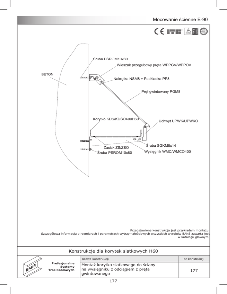 177 Mocowanie ścienne E-90 Montaż koryta siatkowego do ściany na wysięgniku z odci Śruba PSROM10x80 Wieszak przegubowy pręta WPPGV/WPPOV BETON Nakrętka NSM8 + Podkładka PP8 Pręt gwintowany PGM8 Korytko KDS/KDSO400H60 Zacisk ZS/ZSO Śruba PSROM10x80 178 Uchwyt UPWK/UPWKO Śruba SGKM8x14 Wysięgnik WMC/WMCO400 Montaż koryta siatkowego do ściany na wysięgniku bez p Przedstawiona konstrukcja jest przykładem montażu. Szczegółowa informacja o rozmiarach i parametrach wytrzymałościowych wszystkich wyrobów BAKS zawarta jest w katalogu głównym. BETON Konstrukcje dla korytek siatkowych H60 Profesjonalne Systemy Tras Kablowych Korytko KDS/KDSO400H60 nazwa konstrukcji nr konstrukcji Montaż korytka siatkowego do ściany na wysięgniku z odciągiem z pręta gwintowanego 177 Zacisk ZS/ZSO 177 Mocowanie ścienne E-90 kcja 178 Montaż koryta siatkowego do ściany na wysięgniku b Korytko KDS/KDSO400H60 BETON Zacisk ZS/ZSO Wysięgnik WWCT/WWCTO400 Śruba PSROM10x80 kcja 179 Montaż koryta siatkowego do ściany na wysięgniku (dla sz BETON Korytko KDS/KDSO400H60 Zacisk ZS/ZSO+Podkładka PW6 Przedstawiona konstrukcja jest przykładem montażu. Szczegółowa informacja o rozmiarach i parametrach wytrzymałościowych wszystkich wyrobów BAKS zawarta jest w katalogu głównym. Wysięgnik WPT/WPTO100 Śruba PSROM10x80 Konstrukcje dla korytek siatkowych H60 nazwa konstrukcji Profesjonalne Systemy Tras Kablowych nr konstrukcji Montaż korytka siatkowego do ściany na wysięgniku bez pręta odciągowego 178 178 Mocowanie ścienne E-90 Konstrukcja 179 Montaż koryta siatkowego do ściany na wysięgnik BETON Korytko KDS/KDSO400H60 Zacisk ZS/ZSO+Podkładka PW6 Wysięgnik WPT/WPTO100 Śruba PSROM10x80 Konstrukcja 180 Montaż koryta siatkowego do ściany na wysięgniku WP Przedstawiona konstrukcja jest przykładem montażu. Szczegółowa informacja o rozmiarach i parametrach Korytko wytrzymałościowych wszystkich wyrobów BAKS zawarta jest KDS/KDSO400H60 w katalogu głównym. Zacisk ZS/ZSO+Podkładka PW6 BETON Konstrukcje dla korytek siatkowych H60 nazwa konstrukcji Profesjonalne Systemy Tras Kablowych nr konstrukcji Montaż korytka siatkowego do ściany Wysięgnik WPTKO400 na wysięgniku (dla szerokości 100mm) 179 179 rukcja 180 Mocowanie ścienne E-90 Montaż koryta siatkowego do ściany na wysięgniku WPTKO... Korytko KDS/KDSO400H60 Zacisk ZS/ZSO+Podkładka PW6 BETON Wysięgnik WPTKO400 Śruba PSROM10x80 rukcja 181 Montaż korytek siatkowych do ściany na ceowniku i Śruba PSROM12x100 Wieszak kątowy pręta WKPO Przedstawiona konstrukcja jest przykładem montażu. Szczegółowa informacja o rozmiarach i parametrach wytrzymałościowych wszystkich wyrobów BAKS zawarta jest w katalogu głównym. Nakrętka NSM10 + Podkładka PP10 BETON Konstrukcje dla korytek siatkowych H60 nazwa konstrukcji Profesjonalne Systemy Tras Kablowych nr konstrukcji Pręt gwintowany PGM10 Montaż korytka siatkowego do ściany na wysięgniku WPTKO... (dla szerokości powyżej 100mm) 180 180 Korytko KDS/KDSO400H60 Uchwyt UPWK/UPWKO Mocowanie ścienne E-90 181 Montaż korytek siatkowych do ściany na ceowniku i wysię Śruba PSROM12x100 Wieszak kątowy pręta WKPO Nakrętka NSM10 + Podkładka PP10 BETON Pręt gwintowany PGM10 Korytko KDS/KDSO400H60 Uchwyt UPWK/UPWKO Uchwyt UPW/UPWO Śruba SGKM8x14 Śruba PSROM10x80 Wysięgnik WMC/WMCO400 Pręt gwintowany PGM10 Zacisk ZS/ZSO Uchwyt UPW/UPWO Ceownik CWP/CWOP40H40 Przedstawiona konstrukcja jest przykładem montażu. Szczegółowa informacja o rozmiarach i parametrach wytrzymałościowych wszystkich wyrobów BAKS zawarta jest w katalogu głównym. Konstrukcje dla korytek siatkowych H60 nazwa konstrukcji Profesjonalne Systemy Tras Kablowych nr konstrukcji Montaż korytek siatkowych do ściany na ceowniku i wysięgnikach z odciągiem z pręta gwintowanego 181 181 2 3 Mocowanie ścienno-sufitowe E-90 Montaż koryta siatkowego do stropu i ściany na wysięgniku z BETON Tuleja rozporowa TRSOM8 Pręt gwintowany PGM8 Korytko KDS/KDSO400H60 Nakrętka NSM8 + Podkładka PP8 Zacisk ZS/ZSO Uchwyt UPW/UPWO Śruba SGKM8x14 Wysięgnik WMC/WMCO400 Śruba PSROM10x80 Montaż koryt siatkowych do stropu i ściany na wysięgniku z o BETON Tuleja rozporowa TRSOM10 Korytko KDS/KDSO400H60 Przedstawiona konstrukcja jest przykładem montażu. Pręt gwintowany PGM10 Szczegółowa informacja o rozmiarach i parametrach wytrzymałościowych wszystkich wyrobów BAKS zawarta jest w katalogu głównym. Konstrukcje dla korytek siatkowych H60 nazwa konstrukcji Profesjonalne Systemy Tras Kablowych nr konstrukcji Montaż korytka siatkowego do stropu Nakrętka NSM10 + Podkładka PP10 i ściany na wysięgniku z odciągiem z pręta 182 gwintowanego Uchwyt UPW/UPWO 182 Zacisk ZS/ZSO Śruba SGKM8x14 Wysięgnik WMC/WMCO400 Mocowanie ścienno-sufitowe E-90 Montaż koryt siatkowych do stropu i ściany na wysięgniku z od BETON Tuleja rozporowa TRSOM10 Korytko KDS/KDSO400H60 Pręt gwintowany PGM10 Nakrętka NSM10 + Podkładka PP10 Zacisk ZS/ZSO Uchwyt UPW/UPWO Śruba SGKM8x14 Wysięgnik WMC/WMCO400 Śruba PSROM10x80 Montaż koryta siatkowego do ściany na wsporniku fajkowym z Tuleja rozporowa TRSOM8 Przedstawiona konstrukcja jest przykładem montażu. Szczegółowa informacja o rozmiarach i parametrach wytrzymałościowych wszystkich wyrobów BAKS zawarta jest w katalogu głównym. Pręt gwintowany PGM8 Konstrukcje dla korytek siatkowych H60 nazwa konstrukcji Profesjonalne Systemy Tras Kablowych nr konstrukcji Montaż korytek siatkowych do stropu i ściany na wysięgnikach z odciągiem z pręta gwintowanego Korytko KDS/KDSO400H60 183 183 84 85 Mocowanie ścienno-sufitowe E-90 Montaż koryta siatkowego do ściany na wsporniku fajkowym Tuleja rozporowa TRSOM8 Pręt gwintowany PGM8 Korytko KDS/KDSO400H60 Nakrętka NSM8 + Podkładka PP8 Śruba PSROM10x80 Wspornik fajkowy WFL/WFLO400 Podkładka dystansowa PD11 Zacisk ZS/ZSO Montaż koryt siatkowych do ściany na wspornikach fajkowych z o Tuleja rozporowa TRSOM10 Przedstawion