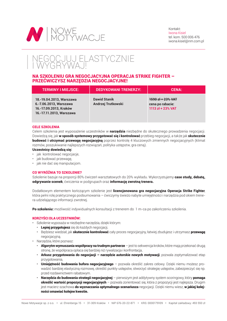Kontakt: Iwona Kisiel tel. kom. 500 006 476 [email protected] Negocjuj elastycznie i wygrywaj! Na szkoleniu gra negocjacyjna Operacja Strike Fighter – przećwiczysz narzędzia negocjacyjne! Terminy i miejsce: 18.-19.04.2013, Warszawa 6.-7.06.2013, Warszawa 16.-17.09.2013, Kraków 16.-17.11.2013, Warszawa Dedykowani trenerzy: Dawid Stanik Andrzej Trutkowski Cena: 1590 zł + 23% VAT cena po rabacie: 1113 zł + 23% VAT Cele szkolenia Celem szkolenia jest wyposażenie uczestników w narzędzia niezbędne do skutecznego prowadzenia negocjacji. Dowiedzą się, jak w sposób systemowy przygotować się i kontrolować przebieg negocjacji, a także jak skutecznie budować i utrzymać przewagę negocjacyjną poprzez kontrolę 4 kluczowych zmiennych negocjacyjnych (klimat rozmów, poszukiwanie najlepszych rozwiązań, polityka ustępstw, gra ceną). Uczestnicy dowiedzą się: • jak kontrolować negocjacje, • jak budować przewagę, • jak nie dać się manipulacjom. Co wyróżnia to szkolenie? Szkolenie bazuje na proporcji 80% ćwiczeń warsztatowych do 20% wykładu. Wykorzystujemy case study, debatę, odgrywanie scenek, ćwiczenia w podgrupach oraz informację zwrotną trenera. Dodatkowym elementem kończącym szkolenie jest licencjonowana gra negocjacyjna Operacja Strike Fighter, która pełni rolę praktycznego podsumowania – ćwiczymy świeżo nabyte umiejętności i narzędzia pod okiem trenera udzielającego informacji zwrotnej. Po szkoleniu: możliwość indywidualnych konsultacji z trenerem do 1 m-ca po zakończeniu szkolenia. Korzyści dla uczestników: • Szkolenie wyposaża w niezbędne narzędzia, dzięki którym: • Lepiej przygotujesz się do każdych negocjacji, • Będziesz wiedział, jak skutecznie kontrolować cały proces negocjacyjny, łatwiej zbudujesz i utrzymasz przewagę negocjacyjną. • Narzędzia, które poznasz: • Algorytm wymuszania współpracy na trudnym partnerze – jest to sekwencja kroków, które mają przekonać drugą stronę, że współpraca opłaca się bardziej niż rywalizacja i konfrontacja, • Arkusz przygotowania do negocjacji – narzędzie autorskie nowych motywacji, pozwala zoptymalizować etap przygotowania, • Umiejętność budowania bufora negocjacyjnego – pozwala określić zakres celowy. Dzięki niemu możesz prowadzić bardziej elastyczną rozmowę, określić punkty ustępstw, stworzyć strategię ustępstw, zabezpieczyć się np. przed rozdawnictwem rabatowym. • Narzędzia do budowania strategii negocjacyjnej – pierwszym jest addytywny system scoringowy, który pomaga określić wartość propozycji negocjacyjnych – pozwala zorientować się, która z propozycji jest najlepsza. Drugim jest macierz szachowa do wyznaczania optymalnego scenariusza negocjacji. Dzięki niemu wiesz, w jakiej kolejności omawiać kolejne kwestie. Nowe Motywacje sp. z o.o. • ul. Ehrenberga 15 • 31-309 Kraków • NIP 676-20-22-871 • KRS: 0000179109 • Kapitał zakładowy: 493 550 zł • Stosowanie narzędzi i umiejętności z tego szkolenia pozwoli Ci być skuteczniejszym, bardziej świadomym negocjatorem. Pomoże unikać typowych pułapek negocjacyjnych i wychodzić zwycięsko z manipulacji. • Zdobyte umiejętności pozwolą Ci lepiej funkcjonować w procesach biznesowych, w których negocjacje mają istotny wpływ na rezultat (sprzedaż, zakupy, obsługa klienta, rekrutacja, zarządzanie ludźmi). Program Postawa i nastawienia w negocjacjach. • Negocjacje: walka czy współpraca? Paradoks współpracy w negocjacjach. • Budowanie współpracy w negocjacjach – jak „wymuszać” współpracę na trudnych partnerach negocjacyjnych. Wymiary negocjacji – techniki zwiększające skuteczność. • Dbanie o interesy – dążenie do osiągania ambitnych celów. • Budowanie siły – między dominacją a uległością – przeżywanie swojej siły, a strategia negocjacji. • Budowanie odpowiedniego klimatu do negocjacji. • Radzenie sobie z impasami - elastyczność w negocjacjach. Negocjacje integracyjne (wiele zmiennych). • Łączenie kwestii negocjacyjnych – „coś za coś”, „nie ma nic za darmo”. • Negocjowanie całości porozumienia - „nic nie jest wynegocjowane dopóki wszystko nie jest ustalone”. Negocjacje krok po kroku - negocjacje integracyjne jako proces. • Przygotowanie – „sukces w negocjacjach to 80% potu i 20% polotu”. • Debata – zasady „obwąchiwania się”. • Składanie propozycji – „a gdyby tak …”. • Zawieranie porozumienia. • Formalizowanie umowy. Macierz szachowa w negocjacjach integracyjnych – macierz negocjacyjna. • Konstrukcja macierzy – jak porządkować kwestie negocjacyjne? • Powiązania pomiędzy zmiennymi/kwestiami. • Różne drogi osiągnięcia celu. • Od czego zaczynać i jak prowadzić dalej proces negocjacji? Strategiczna Gra Negocjacyjna – Operacja Strike Fighter, czyli przećwiczenie w praktyce świeżo zdobytej wiedzy i umiejętności. Nowe Motywacje sp. z o.o. • ul. Ehrenberga 15 • 31-309 Kraków • NIP 676-20-22-871 • KRS: 0000179109 • Kapitał zakładowy: 493 550 zł