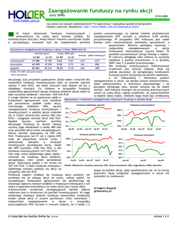 Zaangażowanie funduszy na rynku akcji (luty 2008) 27-03-2008 www.holder.com.pl Czy jesteś już naszym subskrybentem? To najprostszy i najszybszy sposób otrzymywania naszych raportów. Bezpłatnie. http://www.holder.com.pl/subskrypcja.shtml W lutym aktywność funduszy inwestycyjnych i emerytalnych na rynku akcji istotnie osłabła. Po dramatycznym styczniu, kiedy klienci masowo wycofywali środki a zarządzający zmuszani byli do redukowania portfela punktu procentowego, to jednak średnie arytmetyczne zaangażowanie OFE wzrosło o zaledwie 0,05 punktu procentowego. W przypadku OFE widoczne jest nadal bardzo silne rozwarstwienie pomiędzy optymistami a pesymistami. Różnica pomiędzy najmniej i najbardziej zaangażowanymi w akcje Szacunkowe zaangażowanie funduszy w akcje w lutym 2008 (mln zł) funduszami emerytalnymi wynosi blisko 10 wartość akcji* % kap. GPW (pl) punktów procentowych (drugi miesiąc z rzędu). zmiana saldo inwestycji* lut 08 sty 08 lut 08 sty 08 W czerwcu ubiegłego roku różnica ta wynosiła zaledwie 4 punkty procentowe, a w grudniu inwestycyjne* 41 586 42 405 9,6% 9,6% -819 -617 2007 roku 7,3 punktu procentowego. emerytalne 42 995 42 839 9,9% 9,7% 156 358 Dla funduszy inwestycyjnych zróżnicowanie Łącznie 84 581 85 244 19,5% 19,4% -662 -259 oczekiwań jest jeszcze większe. Daje się Źródło: TFI, KNF, obliczenia własne jednak zauważyć, że zarządzający funduszami * dane szacunkowe inwestycyjnymi zaczynają się powoli uspokajać, a ich maksymalny i minimalny poziom akcyjnego, luty przyniósł uspokojenie. Saldo wpłat i umorzeń dla zaangażowania w akcje, po bardzo silnym rozwarstwieniu, wszystkich funduszy inwestycyjnych było co prawda ujemne jakie odnotowaliśmy w końcówce poprzedniego i na (minus 1 mld PLN), ale skala umorzeń była daleka od tej z początku bieżącego roku, powoli zaczyna się do siebie ubiegłego miesiąca. Co ciekawe w przypadku funduszy zbliżać. Jeśli kolejne miesiące nie przyniosą dramatycznych najbardziej agresywnych (grupa funduszy polskich akcji) saldo to zmian na rynku akcji, należy oczekiwać, że rozwarstwienie było wyraźnie dodatnie i wyniosło +525 mln PLN. to będzie dalej maleć. Efektem tego może być zwiększony Z uwagi właśnie na to pozytywne saldo w funduszach agresywnych oraz zaledwie Maksymalne i minimalne zaangażowanie wybranych funduszy w polskie akcje pół procentowy spadek rynku akcji, fundusze stabilnego wzrostu fundusze zrównoważone mierzonego indeksem WIG, łączne 38% zaangażowanie funduszy emerytalnych i 65% inwestycyjnych w polskie akcje zmieniło 33% 55% się w lutym nieznacznie (minus 662 mln PLN) i osiągnęło wartość 84,6 mld PLN. 28% 45% Spadek łącznej wartości portfela 23% akcyjnego funduszy to skutek niższej 18% 35% wyceny jego składników o około 400 mln lip 06 lis 06 mar 07 lip 07 lis 07 lip 06 lis 06 mar 07 lip 07 lis 07 oraz sprzedaż akcji przez zarządzających, której wartość szacujemy na 259 mln fundusze polskich akcji fundusze emerytalne PLN. Tradycyjnie już (7 raz z rzędu) OFE 100% 40% stały po popytowej stronie rynku i dokonywały zakupów a fundusze 37% 85% inwestycyjne sprzedawały akcje. Saldo 34% dla OFE wyniosło +358 mln PLN, a dla 31% funduszy inwestycyjnych -617 mln PLN. 70% 28% Tak więc mimo dodatniego salda wpłat i umorzeń do funduszy akcji polskich, 55% 25% zarządzający nimi woleli sprzedawać lip-06 lis-06 mar-07 lip-07 lis-07 mar-07 sie-07 sty-08 akcje. Szacujemy podaż z ich strony na 367 mln PLN. Z kolei fundusze mieszane i Źródło: Miesięczne struktury aktywów OFE, Union Investment, ING, Legg Mason, DWS, Skarbiec stabilnego wzrostu pozbyły się akcji za popyt na polskie akcje, gdyż spodziewamy się, że to raczej niespełna 320 mln PLN. pesymiści będą zwiększać zaangażowanie w akcje niż Ponieważ napływ środków do funduszy akcji polskich nie optymiści je redukować. przełożył się na zakupy akcji na rynku, należy sądzić, że zarządzający funduszami agresywnymi nie spodziewają się istotnego napływu nowych środków w kolejnych miesiącach a ich wiara w poprawę koniunktury na rynku akcji jest raczej nikła. Grzegorz Raupuk Zróżnicowanie oczekiwań zarządzających bardzo dobrze [email protected] widoczne jest w strukturze ich portfeli inwestycyjnych. W ciągu ostatniego miesiąca jedynie fundusze emerytalne zwiększyły średni udział akcji w swoich portfelach. Choć minimalne i maksymalne zaangażowanie w akcje w przypadku poszczególnych OFE wzrosło w równym stopniu, bo o około 1,2 © Copyright by Analizy Online Sp. z o.o. strona 1 z 2 Zaangażowanie funduszy na rynku akcji (luty 2008) 27-03-2008 www.holder.com.pl Czy jesteś już naszym subskrybentem? To najprostszy i najszybszy sposób otrzymywania naszych raportów. Bezpłatnie. http://www.holder.com.pl/subskrypcja.shtml HOLDER jest serwisem prowadzonym przez firmę Analizy Online. Jest dedykowany inwestorom finansowym oraz podmiotom pośredniczącym w transakcjach na rynku kapitałowym. Podstawową funkcjonalnością HOLDERA jest analiza stanu oraz zmian zachodzących w akcjonariacie polskich spółek publicznych, w szczególności zmian zachodzących w portfelach funduszy inwestycyjnych, emerytalnych i zagranicznych funduszach inwestycyjnych lokujących na „emerging markets”. Niniejsze opracowanie zostało sporządzone wyłącznie w celu informacyjnym zgodnie z najlepszą wiedzą i starannością autorów. Dane wykorzystane przy tworzeniu opracowania pochodzą ze źródeł uważanych przez firmę Analizy Online Sp. z o.o. za wiarygodne i dokładne, lecz nie istnieje gwarancja, iż są one kompletne i odzwierciedlają stan faktyczny. Opinie zawarte w niniejszym opracowaniu częściowo bazują na wartościach szacunkowych, wyznaczanych zgodnie z metodologią stosowaną przez Analizy Online Sp. z o.o., które mogą odbiegać od danych rzeczywistych. Spółka Analizy Online Sp. z o.o. nie ponosi odpowiedzialności za ewentualne szkody 