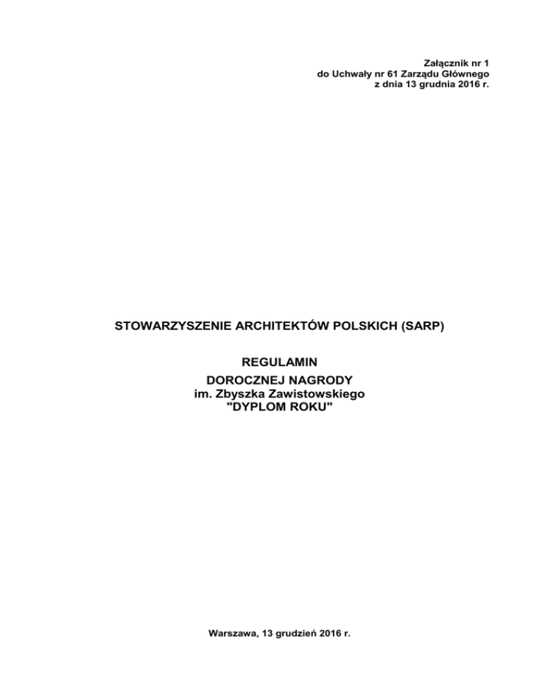 Załącznik nr 1 do Uchwały nr 61 Zarządu Głównego z dnia 13 grudnia 2016 r. STOWARZYSZENIE ARCHITEKTÓW POLSKICH (SARP) REGULAMIN DOROCZNEJ NAGRODY im. Zbyszka Zawistowskiego "DYPLOM ROKU" Warszawa, 13 grudzień 2016 r. 2 § 1. POSTANOWIENIA WSTĘPNE 1. Doroczna Nagroda im. Zbyszka Zawistowskiego „DYPLOM ROKU” przyznawana jest przez Stowarzyszenie Architektów Polskich SARP, zwane w dalszej części Regulaminu „SARP”. 2. Nagroda jest wyłaniania w drodze konkursu, na warunkach i w trybie określonym niniejszym Regulaminem. § 2. PATRONATY 1. Konkurs odbywa się pod patronatem medialnym czasopisma ARCH. 2. Dopuszcza się możliwość ustanowienia innych patronatów (patronów), niezależnie od zapisów niniejszego Regulaminu. Każdorazowo, w przypadku ustanawiania patronatu, decyzję o podjęciu takiej inicjatywy podejmuje Zarząd Główny razem z Radą Prezesów, a informacja o przyjęciu będzie podawana do publicznej wiadomości. § 3. ZASADY KONKURSU I WARUNKI UCZESTNICTWA 1. Konkurs Dyplom Roku jest konkursem, składającym się z 3 etapów: - Etap 1 - Komisja Kwalifikacyjna powołana w oddziałach SARP sporządza listy prac Nominowanych w oddziałach spośród prac zgłoszonych do KK na podstawie skrótowych opracowań - prezentacji autorskiej prac zgłoszonych do Konkursu zawierającej wyselekcjonowany materiał pracy dyplomowej, obejmujący najistotniejsze jej aspekty (maksymalnie 2 plansze oraz opis w pliku o pojemności nie większym niż 1MB). Po prezentacji prac Nominowanych (z udziałem autorów) KK podejmuje decyzję o skierowaniu wybranych prac do Etapu 2. - Etap 2 - Sąd Konkursowy powołany przez ZG wybiera 25 prac spośród prac zakwalifikowanych przez KK w oddziałach na podstawie przesłanych skrótowych opracowań. W uzasadnionych przypadkach Sąd Konkursowy może poprosić o dodatkowe informacje dotyczące pracy dyplomowej. - Etap 3 - Sąd Konkursowy, po prezentacjach autorskich, dokonuje wyboru Nagrody oraz Wyróżnień regulaminowych 2. Do konkursu mogą być zgłaszane prace dyplomowe, magisterskie, wykonane na uczelni w ramach kształcenia skutkującego nadaniem dyplomu architekta, w roku akademickim poprzedzającym rok przeprowadzenia konkursu, które uzyskały pozytywną opinię Komisji Dyplomowej danego Wydziału Architektury. 3. Tematem zgłoszonej pracy winno być zadanie projektowe opracowane przez jednego dyplomanta. Zgłaszanie prac wykonanych przez zespół autorski dyplomantów dopuszcza się warunkowo w uzasadnionych przypadkach. 4. O Nagrodę mogą ubiegać się prace nominowane przez Komisje Kwalifikacyjne. 5. Warunkiem udziału w Etapie 2 i 3 Konkursu jest złożenie oświadczenia przez dyplomanta, na Karcie Zgłoszenia Uczestnictwa, potwierdzające jego udział w dalszej części procedury konkursowej. §4. ZGŁASZANIE PRAC 1. Zgłaszanie prac do Konkursu jest możliwe tylko na Etapie 1 - bezpośrednio do Komisji Kwalifikacyjnej odpowiedniej dla danego oddziału SARP. 2. Uprawnionymi do zgłaszania prac dyplomowych do Konkursu na Etapie 1 są: - Promotor - Recenzent - Dziekan w oparciu o opinie wydziałowych Komisji Dyplomowych STOWARZYSZENIE ARCHITEKTÓW POLSKICH REGULAMIN DOROCZNEJ NAGRODY IM. ZBYSZKA ZAWISTOWSKIEGO „DYPLOM ROKU” 3 3. 4. - Komisja Dyplomowa lub inne powołane przez Dziekana ciała kolegialne biorące udział w procesie oceny prac dyplomowych skutkujące nadaniem stopnia architekta - Dyplomant samodzielnie Warunkiem przystąpienia do Etapu 2 jest przesłanie na ręce Sekretarza Sądu Konkursowego Karty kwalifikacyjnej. Każda Komisja Kwalifikacyjna ma prawo do zgłoszenia dowolnej liczby prac gwarantujących właściwy poziom opracowania prac dyplomowych. § 5. PYTANIA 1. Dyplomanci, promotorzy oraz uczelnie mogą składać pytania dotyczące konkursu w terminie przewidzianym w harmonogramie. 2. Pytania dotyczące konkursu można składać drogą elektroniczną na adres: [email protected] w terminie nie przekraczającym 10 dni przed datą zgłaszania prac do Konkursu. W temacie pytania należy wpisać: „Dyplom Roku - pytania”. 3. Na pytania Organizator udzieli odpowiedzi w terminie do 7 dni roboczych, powiadamiając o treści pytania i udzielonej odpowiedzi na stronie internetowej. 4. Pytania złożone po terminie wskazanym w pkt.2 nie będą rozpatrywane. § 6. SKŁADANIE PRAC KONKURSOWYCH 1. Składanie prac konkursowych w formie skrótowych opracowań w Etapie 1 przez dyplomantów wskazanych przez uprawnionych do udzielania rekomendacji lub samodzielnie następuje na ręce sekretarza Komisji Kwalifikacyjnej na adres mailowy wskazany przez dany oddział. Prace należy złożyć w nieprzekraczalnym terminie określonym w harmonogramie konkursu. Prace przesłane po terminie nie będą rozpatrywane. 2. Prace zakwalifikowane przez Komisje Kwalifikacyjne do Etapu 2 przyjmowane są przez Sekretarza Konkursu drogą elektroniczną na podstawie protokołu sporządzonego przez Komisję Kwalifikacyjną. Osobą odpowiedzialną za przesłanie skrótowych opracowań zakwalifikowanych do Etapu 2 jest sekretarz Komisji Kwalifikacyjnej oddziału. 3. Sąd konkursowy po wyłonieniu 25 prac zakwalifikowanych do Etapu 3 niezwłocznie zawiadamia o podjętej decyzji macierzyste uczelnie, odpowiedzialne za dostarczenie oryginalnych prac zakwalifikowanych do Etapu 3. 4. Wydziały Architektury, których studenci zostali zakwalifikowani do prezentowania prac przed Sądem Konkursowym, są odpowiedzialne za przygotowanie i wysyłkę prac dyplomowych wraz z listem przewodnim stanowiącym oficjalne zgłoszenie prac do Konkursu o Nagrodę Dyplom Roku. 3. Prace należy dostarczyć, na koszt zgłaszającego, na adres: Stowarzyszenie Architektów Polskich Oddział we Wrocławiu, ul. Rynek-Ratusz 25, III p., 50-101 Wrocław, z dopiskiem „DYPLOM ROKU”. 4. Każda z prac zgłaszanych do konkursu musi być oddzielnie zapakowana. 5. Prace zgłoszone do Nagrody przyjmuje Sekretarz Organizacyjny, potwierdzając odbiór pracy. Dopuszcza się możli