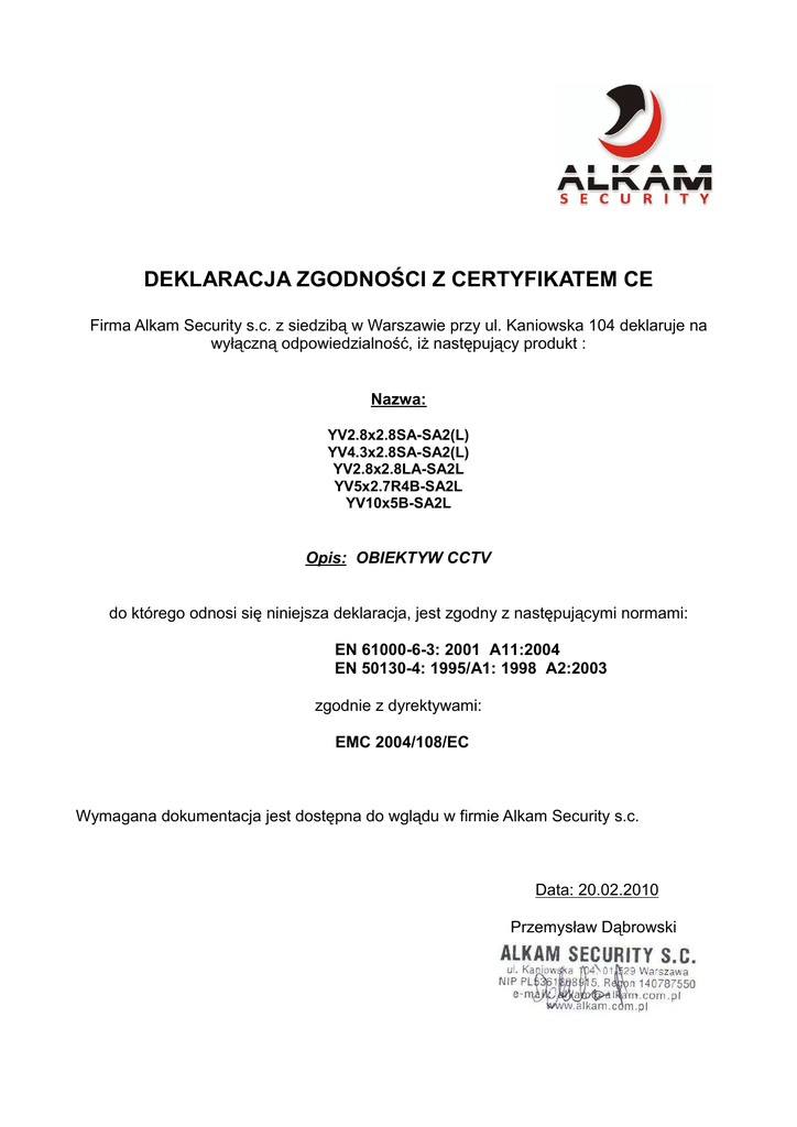 DEKLARACJA ZGODNOŚCI Z CERTYFIKATEM CE Firma Alkam Security s.c. z siedzibą w Warszawie przy ul. Kaniowska 104 deklaruje na wyłączną odpowiedzialność, iż następujący produkt : Nazwa: YV2.8x2.8SA-SA2(L) YV4.3x2.8SA-SA2(L) YV2.8x2.8LA-SA2L YV5x2.7R4B-SA2L YV10x5B-SA2L Opis: OBIEKTYW CCTV do którego odnosi się niniejsza deklaracja, jest zgodny z następującymi normami: EN 61000-6-3: 2001 A11:2004 EN 50130-4: 1995/A1: 1998 A2:2003 zgodnie z dyrektywami: EMC 2004/108/EC Wymagana dokumentacja jest dostępna do wglądu w firmie Alkam Security s.c. Data: 20.02.2010 Przemysław Dąbrowski