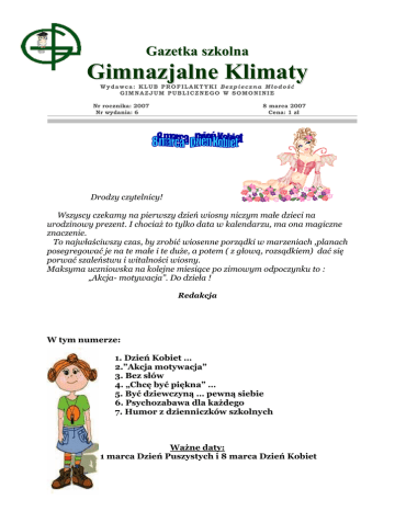 Gazetka szkolna Gimnazjalne Klimaty Wy d a wc a : K L U B P R O F I L A K T Y K I B e z p i e c z n a M ł o d o ś ć GIMNAZJUM PUBLICZNEGO W SOMONINIE Nr rocznika: 2007 Nr wydania: 6 8 marca 2007 Cena: 1 zł Drodzy czytelnicy! Wszyscy czekamy na pierwszy dzień wiosny niczym małe dzieci na urodzinowy prezent. I chociaż to tylko data w kalendarzu, ma ona magiczne znaczenie. To najwłaściwszy czas, by zrobić wiosenne porządki w marzeniach ,planach posegregować je na te małe i te duże, a potem ( z głową, rozsądkiem) dać się porwać szaleństwu i witalności wiosny. Maksyma uczniowska na kolejne miesiące po zimowym odpoczynku to : „Akcja- motywacja”. Do dzieła ! Redakcja W tym numerze: 1. Dzień Kobiet … 2.”Akcja motywacja” 3. Bez słów 4. „Chcę być piękna” … 5. Być dziewczyną … pewną siebie 6. Psychozabawa dla każdego 7. Humor z dzienniczków szkolnych Ważne daty: 1 marca Dzień Puszystych i 8 marca Dzień Kobiet 8 marca Dzień Kobiet Dzień Kobiet to święto obchodzone corocznie 8 marca jako wyraz szacunku wobec kobiet. Święto to powstało dla upamiętnienia pewnego wydarzenia, które miało miejsce 8 marca 1908 roku w Nowym Jorku. Tamtego dnia 15 tysięcy kobiet wyszło na demonstrację, Ŝeby zaprotestować przeciwko nierównemu traktowaniu kobiet. Domagały się pełnych praw dla siebie (takich samych, jakie mieli męŜczyźni). Chodziło o to, Ŝeby kobiety, podobnie jak męŜczyźni, mogły głosować w wyborach i aby doceniono ich cięŜką pracę jaką wykonują w domu oraz przy wychowywaniu dzieci. Manifestujące Panie chciały równieŜ, aby dziewczęta miały takie same moŜliwości kształcenia się i kariery zawodowej jak chłopcy. Dziś moŜe nam się to wydawać nieprawdopodobne, ale jeszcze sto lat temu te sprawy nie były oczywiste i kobiety musiały się ich domagać podczas demonstracji. Dzisiaj 8 marca jest dniem, w którym męŜczyźni wyraŜają swój szacunek dla najbliŜszych im kobiet. Ojcowie składają Ŝyczenia swoim Ŝonom i córkom, zakochani chłopcy swoim wybrankom serca, koledzy - koleŜankom, synowie - mamom i babciom, bracia - siostrom a to wszystko po to, Ŝeby podkreślić, Ŝe świat bez płci pięknej byłby smutny i nieładny. Z pewnością i Wy w przeszłości obchodziliście juŜ to święto. Wiecie więc, Ŝe w zwyczaju jest obdarowywanie kobiet kwiatami, Ŝyczeniami a czasem i drobnymi prezentami. Proponujemy Wam (chłopcom, bo poniŜsze rady przede wszystkim do nich się odnoszą) skorzystanie z paru pomysłów: Marzec wyjął grosik srebrny, Teraz będzie mu potrzebny. Do kwiaciarni marzec pobiegł, Kupić bukiet na święto kobiet. Bądź bardzo mądra, Bądź bardzo miła, Bądź zawsze szczera, Miej wszystkie miłe zalety, Niech z Ciebie wyrośnie Ideał kobiety. W dniu Twojego święta chciałem Ci powiedzieć, Ŝe Ty jesteś dla mnie najdroŜsza pod niebem! Raz do roku jest taki dzień, Który przemija jak piękny sen. Wszystkie kobiety panie i matki, W dniu tym dostają pachnące kwiatki. Wierszyki ( Ŝyczonka) Drodzy Panowie naszego gimnazjum … 1. Pamiętajcie, Ŝe dla Waszych mam, wychowawczyń, nauczycielek, sióstr i koleŜanek najwaŜniejsze są przede wszystkim szczere Ŝyczenia. Kwiatki to dodatek, który wcale nie musi być najwaŜniejszy. 2. Miło jest, gdy Wasze Ŝyczenia będą niebanalne - prosto z serca. JeŜeli jednak macie problemy z wymyśleniem takich słów - spróbujcie skorzystać z powyŜszych wierszyków i Ŝyczeń: 3. Pamiętajcie - 8 marca to tylko jeden z 365 dni w roku - postarajcie się nie tylko tego dnia, ale przez cały rok być miłymi dla Waszych mam, wychowawczyń, nauczycielek, sióstr i koleŜanek. Po tym poznaje się chłopców i męŜczyzn dojrzałych i odpowiedzialnych. 4. I najwaŜniejsze - zapomnijcie o wstydzie i nieśmiałości - tego dnia po prostu nie wypada się wstydzić z okazywaniem uczuć. Mamie pokaŜcie swoim zachowaniem, Ŝe dziękujecie jej za kaŜdy dzień Waszego wychowania, siostrze podziękujcie za wspólne dorastanie a koleŜankom ze szkoły lub podwórka, za kaŜde miłe słowo! śyczymy Wam mile spędzonego Dnia Kobiet, a wszystkim kobietom naszego somonińskiego gimnazjum składam Ŝyczenia wszystkiego co najlepsze i słodkiego Ŝycia! Pozdrawiamy redakcja Bardzo poważnie o motywacji do nauki. WaŜnym elementem w zapobieganiu niepowodzeń szkolnych odgrywa motywacja do nauki. Motywacja – to stan o charakterze psychicznym lub społecznym, słuŜącym nakierowaniu działań jednostki na określony cel. Jak to określają psychologowie motywacja jest zjawiskiem złoŜonym i charakteryzuje się kilkoma podstawowymi cechami: wzbudzanie energii, ukierunkowanie wysiłku na cel, koncentracja uwagi i selekcja bodźców, wypracowanie odpowiednich działań, konsekwencja i wytrwałość w podejmowanych czynnościach. Jak powszechnie wiadomo motywacja odgrywa waŜną rolę w zdobywaniu wiedzy a tym samym “karierze” dziecka w szkole. Problem motywacji jest nierozerwalnie związane z działalnością człowieka. Gdy mamy motywację do czegoś, to ona nas pociąga do działania, a w innym przypadku nie mamy motywacji więc nic nie robimy. Podobnie jest z naszymi dziećmi. Dlaczego więc jedne dziecko posiada motywację do nauki a inne nie? Psychologia mówi, Ŝe motywacja jest w duŜej mierze nabywana w trakcie rozwoju osobniczego. To z kolei oznacza, Ŝe podlega ona wychowaniu i jest wyuczalna. Podobnie jak przy niepowodzenia tak i na motywację mają wpływ róŜne czynniki (wewnętrzne i zewnętrzne) Dlatego juŜ od najmłodszych lat najpierw rodzice a później nauczyciele powinni podejmować działania na rzecz rozwijania motywacji do nauki. Tak więc motywowanie do nauki jest waŜnym zadaniem przede wszystkim dla rodziców i od ich wysiłku będzie zaleŜało prędzej lub później, to Ŝe dziecko przestanie się uczyć dla “mamy i taty” i zacznie się uczyć dla siebie. Innym elementem waŜnym dla uczniów jest umiejętność sa