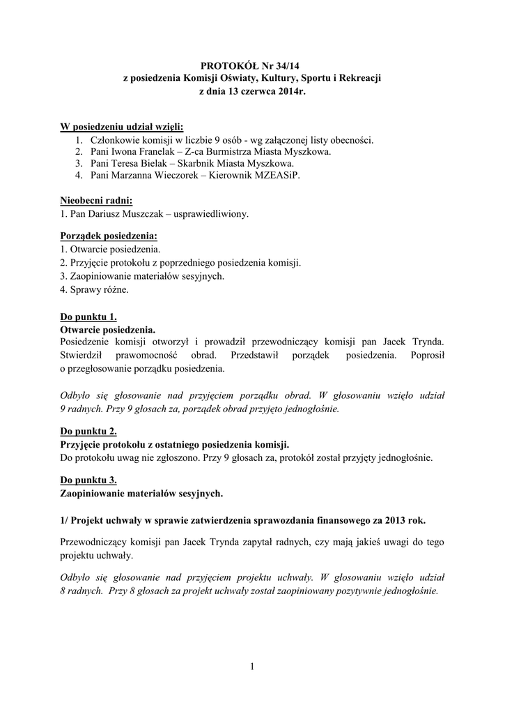PROTOKÓŁ Nr 34/14 z posiedzenia Komisji Oświaty, Kultury, Sportu i Rekreacji z dnia 13 czerwca 2014r. W posiedzeniu udział wzięli: 1. Członkowie komisji w liczbie 9 osób - wg załączonej listy obecności. 2. Pani Iwona Franelak – Z-ca Burmistrza Miasta Myszkowa. 3. Pani Teresa Bielak – Skarbnik Miasta Myszkowa. 4. Pani Marzanna Wieczorek – Kierownik MZEASiP. Nieobecni radni: 1. Pan Dariusz Muszczak – usprawiedliwiony. Porządek posiedzenia: 1. Otwarcie posiedzenia. 2. Przyjęcie protokołu z poprzedniego posiedzenia komisji. 3. Zaopiniowanie materiałów sesyjnych. 4. Sprawy różne. Do punktu 1. Otwarcie posiedzenia. Posiedzenie komisji otworzył i prowadził przewodniczący komisji pan Jacek Trynda. Stwierdził prawomocność obrad. Przedstawił porządek posiedzenia. Poprosił o przegłosowanie porządku posiedzenia. Odbyło się głosowanie nad przyjęciem porządku obrad. W głosowaniu wzięło udział 9 radnych. Przy 9 głosach za, porządek obrad przyjęto jednogłośnie. Do punktu 2. Przyjęcie protokołu z ostatniego posiedzenia komisji. Do protokołu uwag nie zgłoszono. Przy 9 głosach za, protokół został przyjęty jednogłośnie. Do punktu 3. Zaopiniowanie materiałów sesyjnych. 1/ Projekt uchwały w sprawie zatwierdzenia sprawozdania finansowego za 2013 rok. Przewodniczący komisji pan Jacek Trynda zapytał radnych, czy mają jakieś uwagi do tego projektu uchwały. Odbyło się głosowanie nad przyjęciem projektu uchwały. W głosowaniu wzięło udział 8 radnych. Przy 8 głosach za projekt uchwały został zaopiniowany pozytywnie jednogłośnie. 1 2/ Projekt uchwały w sprawie udzielenia Burmistrzowi Miasta Myszkowa absolutorium z tytułu wykonania budżetu za 2013 rok. Przewodniczący komisji pan Jacek Trynda zapytał radnych, czy mają jakieś uwagi do tego projektu uchwały. Odbyło się głosowanie nad przyjęciem projektu uchwały. W głosowaniu wzięło udział 8 radnych. Przy 5 głosach za, 3 wstrzymujących się, projekt uchwały został zaopiniowany pozytywnie. 3/ Projekt uchwały w sprawie utworzenia Szkoły Muzycznej I stopnia w Myszkowie i nadania jej statutu. Przewodniczący komisji pan Jacek Trynda poprosił aby pani kierownik przybliżyła sytuację. Pani Marzanna Wieczorek kierownik MZEASiP powiedziała, że radni pytali o ten temat na poprzedniej komisji i wspomniała o opiniowaniu tego projektu uchwały. Do końca czerwca trwają jeszcze przesłuchania. Co wtorek zgłasza się jeszcze pewna grupa rodziców. 1 lipca zostaną wywieszone listy przyjętych. Na pewno będzie na dzień dzisiejszy 50 osób, tyle zakładaliśmy przyjętych, jeszcze 40 osób jest na liście rezerwowej. Zainteresowanie jest rzeczywiście bardzo duże, chyba nawet przerosło oczekiwania przesłuchujących, stąd wydłużenie terminu. W okresie czerwcowym pojawiły się dzieci, które otrzymały większą liczbę punktów niż te przyjęte wcześniej, więc to się jeszcze ostatecznie do końca czerwca zmieni. Będzie komisja rekrutacyjna składająca się z nauczycieli z kwalifikacjami muzycznymi. Będzie ta weryfikacja trwała. Nawet jeśli ktoś zrezygnuje na początku, czy w trakcie roku to ta lista rezerwowa wskazuje na to, że funkcjonowanie będzie zabezpieczone. Potem dalsze będzie zależało od nauczycieli tej szkoły. Zgodnie z ustawą o systemie oświaty szkołę tworzy Rada Miasta i nadaje jej pierwszy statut, stąd przygotowany projekt uchwały. Potem wszelkie uchwały dokonywane są uchwałą Rady Pedagogicznej, czyli po powstaniu szkoły będą sobie jakieś korekty wprowadzać. Tym niemniej pierwszy wzorcowy statut nadaje rada, który został do te uchwały załączony. Przez miesiące wakacyjne będą trwały przygotowania remontowe w budynku SP nr 7. Trzeba dostosować kilka klas do technicznego funkcjonowania nauki gry na instrumentach. Bardzo duże jest zainteresowanie perkusją, więc trzeba stosownie przygotować podłogę i wyciszenie. Niezbędne nakłady na funkcjonowanie pomieszczeń odpowiednio przygotowanych będą musiały być z budżetu gminy poniesione. Do końca sierpnia będzie to na pewno wszystko wykonane. Będą cztery pomieszczenia do nauki gry i jedno pomieszczenie na zajęcia teoretyczne, gdzie będą się odbywały wykłady dla całej grupy, pomieszczenie do gry na trąbce, na flecie, perkusja, gitara. Będą to zajęcia indywidualne dla każdego dziecko. Będziemy musieli się zastanowić tak jak padła sugestia ze strony rodziców na zebraniu w MDK jak będą przywozić dzieci trzeba będzie uruchomić kawiarenkę gdzie mogliby w tym czasie np. pić kawę, ale jest to sprawa przyszłościowa. Poprosiła o zadawanie pytań. Radny Jan Kotowicz zapytał, czy sale wykładowe będą na górze, czy na dole? 2 Pani Marzanna Wieczorek kierownik MZEASiP odpowiedziała, że na dole, bo praktycznie cały parter będzie Szkoły Muzycznej. Pozostanie oddział przedszkolny, który i tak w 2016r. zniknie, bo już wszystkie dzieci pójdą do klasy I. Będzie również klasa gimnastyczna, która pozostanie dalej klasą gimnastyczną dla uczniów SP nr 7 i salą koncertową dla Szkoły Muzycznej. Radna Mariola Tabaka zapytała, czy jest szansa wizytowania w ostatnim tygodniu sierpnia, bo chciała złożyć taki wniosek. Pani Marzanna Wieczorek kierownik MZEASiP odpowiedziała, że oczywiście, że tak. Przewodniczący komisji pan Jacek Trynda powiedział, że stara się co roku być w przedszkolach, nie wszystkich, ale w miarę możliwości bywa. Radna Mariola Tabaka powiedziała, że z racji tego, że ta szkoła miała być parę razy zamknięta bardzo chciałaby zobaczyć jak to będzie wyglądało. Z drugiej strony ogromnie się cieszy, że ta szkoła zostanie zachowana oraz że padł pomysł stworzenia klas muzycznych. Pani Marzanna Wieczorek kierownik MZEASiP powiedziała, że ma nadzieję, że na otwarcie Szkoły Muzycznej wszyscy radni przyjmą zaproszenie. Jeśli chodzi o wizytację radnych to zaproponowała koniec sierpnia, bo te