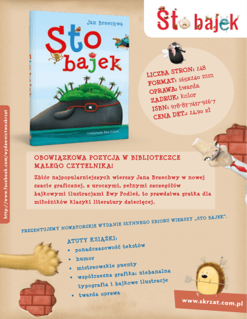 h t tp :/ /w w w.facebook .com/w ydawnic twosk rzat : 248 N O R T S LICZBA x240 mm 5 6 1 : T A FORM arda w t : A W OPRA kolor : K U R D ZA 926-7 7 3 4 7 3 8 8 ISBN: 97 90 zł , 4 2 : . T E CENA D OBOWIĄZKOWA POZYCJA W BIBLIOTECZCE MAŁEGO CZYTELNIKA! Zbiór najpopularniejszych wierszy Jana Brzechwy w nowej szacie graficznej, z uroczy mi, pełny mi szczegółów bajkowy mi ilustracjami Ewy Podleś, to prawdziwa gratka dla miłośników klasyki literatury dziecięcej. ”. Y „S T O BA JE K Z S R IE W U R E G O Z B IO DA N IE S ŁY N N Y W IE K S R O T Y N OWA P R E Z E N T U JE M K I: AT U T Y K S IĄ Ż w o ś ć te k s tó w • p o n a d c z a s o • h u m o r ie p u e n ty • m is tr z o w s k ie b a n a ln a n : a k fi a r g a n s • w s p ó łc z e c je a jk o w e il u s tr a b i a fi a r g o p ty wa • tw a r d a o p r a w w w.s k rz at .co m .p l h t tp :/ /w w w.facebook .com/w ydawnic twosk rzat JA N BRZECHWA – autor najsły nniejszych wierszy, które wciąż śmieszą, bawią i uczą dzieci. Najbardziej znane z nich to: „Kaczka Dziwaczka”, „Przygody Pchły Szachrajki”, „Ptasie plotki” oraz „Sto bajek”. Do jego największych dzieł zalicza się też trylogię o panu Kleksie. W humorystyczny sposób przedstawia prawdę o świecie , pokazuje ludzkie przy wary (ale nikogo nie ośmiesza!), podkreśla, co w życiu jest najważniejsze i uczy, jak dbać o przy jaźń . w w w.s k rz at .co m .p l h t tp :/ /w w w.facebook .com/w ydawnic twosk rzat E W O D A Ł K Y Z R P iLUSTRACjE w w w.s k rz at .co m .p l