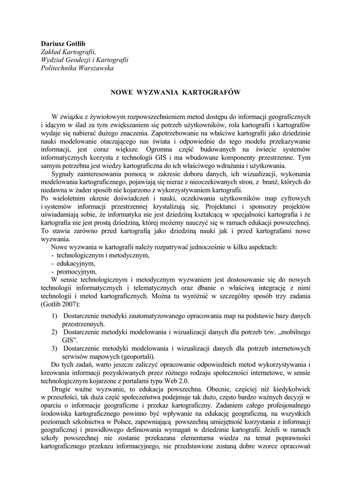 Dariusz Gotlib Zakład Kartografii, Wydział Geodezji i Kartografii Politechnika Warszawska NOWE WYZWANIA KARTOGRAFÓW W związku z żywiołowym rozpowszechnieniem metod dostępu do informacji geograficznych i idącym w ślad za tym zwiększaniem się potrzeb użytkowników, rola kartografii i kartografów wydaje się nabierać dużego znaczenia. Zapotrzebowanie na właściwe kartografii jako dziedzinie nauki modelowanie otaczającego nas świata i odpowiednie do tego modelu przekazywanie informacji, jest coraz większe. Ogromna część budowanych na świecie systemów informatycznych korzysta z technologii GIS i ma wbudowane komponenty przestrzenne. Tym samym potrzebna jest wiedzy kartograficzna do ich właściwego wdrażania i użytkowania. Sygnały zainteresowania pomocą w zakresie doboru danych, ich wizualizacji, wykonania modelowania kartograficznego, pojawiają się nieraz z nieoczekiwanych stron, z branż, których do niedawna w żaden sposób nie kojarzono z wykorzystywaniem kartografii. Po wieloletnim okresie doświadczeń i nauki, oczekiwania użytkowników map cyfrowych i systemów informacji przestrzennej krystalizują się. Projektanci i sponsorzy projektów uświadamiają sobie, że informatyka nie jest dziedziną kształcącą w specjalności kartografia i że kartografia nie jest prostą dziedziną, której możemy nauczyć się w ramach edukacji powszechnej. To stawia zarówno przed kartografią jako dziedziną nauki jak i przed kartografami nowe wyzwania. Nowe wyzwania w kartografii należy rozpatrywać jednocześnie w kilku aspektach: - technologicznym i metodycznym, - edukacyjnym, - promocyjnym. W sensie technologicznym i metodycznym wyzwaniem jest dostosowanie się do nowych technologii informatycznych i telematycznych oraz dbanie o właściwą integrację z nimi technologii i metod kartograficznych. Można tu wyróżnić w szczególny sposób trzy zadania (Gotlib 2007): 1) Dostarczenie metodyki zautomatyzowanego opracowania map na podstawie bazy danych przestrzennych. 2) Dostarczenie metodyki modelowania i wizualizacji danych dla potrzeb tzw. „mobilnego GIS”. 3) Dostarczenie metodyki modelowania i wizualizacji danych dla potrzeb internetowych serwisów mapowych (geoportali). Do tych zadań, warto jeszcze zaliczyć opracowanie odpowiednich metod wykorzystywania i kreowania informacji pozyskiwanych przez różnego rodzaju społeczności internetowe, w sensie technologicznym kojarzone z portalami typu Web 2.0. Drugie ważne wyzwanie, to edukacja powszechna. Obecnie, częściej niż kiedykolwiek w przeszłości, tak duża część społeczeństwa podejmuje tak dużo, często bardzo ważnych decyzji w oparciu o informacje geograficzne i przekaz kartograficzny. Zadaniem całego profesjonalnego środowiska kartograficznego powinno być wpływanie na edukację geograficzną, na wszystkich poziomach szkolnictwa w Polsce, zapewniającą powszechną umiejętność korzystania z informacji geograficznej i prawidłowego definiowania wymagań w dziedzinie kartografii. Jeżeli w ramach szkoły powszechnej nie zostanie przekazana elementarna wiedza na temat poprawności kartograficznego przekazu informacyjnego, nie przedstawione zostaną dobre wzorce opracowań kartograficznych, nie będzie możliwe poznanie skutków korzystania z niepoprawnej wykonanej mapy, to nie będziemy społeczeństwem wymagającym dobrych, profesjonalnych produktów a będziemy jedynie oczekiwać produktów ładnie opakowanych i atrakcyjnych, i będziemy popełniać nieświadomie błędy podczas ich wykorzystywania. Trzecim wyzwaniem, często całkowicie pomijanym, jest umiejętność właściwego dbania o wizerunek i tożsamość zawodu kartografa. Coraz częściej obserwujemy, że kartografia jest marginalizowana kosztem geodezji czy geoinformatyki. Widać to na wielu uczelniach, gdzie często utożsamia się kartografię ze sposobem rysowania mapy i z techniką służącą nadaniu jej formy graficznej. W wielu firmach i instytucjach tworzących produkty i systemy oparte o komponenty GIS, zleca się wiele prac kartograficznych, informatykom, nie zdając sobie sprawy, że nie jest to właściwe zaadresowanie zadania. Jakie są tego przyczyny? Jedną z ważniejszych jest brak właściwej, nowoczesnej polityki informacyjnej prowadzonej przez środowisko kartografów. Jak dotąd nie widać skoordynowanych działań PR (ang. public relation) prowadzonych przez kartografów na zewnątrz środowiska – w innych branżach i dziedzinach nauki. Praktycznie wszystkie seminaria, konferencje, szkolenia i warsztaty kierowane są wyłącznie do wąskiego grona profesjonalistów-kartografów. Kartografia, nie jest właściwie prezentowana nawet w środowisku geodetów czy geoinformatyków. Wydaje się, że pierwszym elementarnym działaniem powinno być więc promowanie nowoczesnych definicji kartografii będących odzwierciedleniem wizji kartografii przedstawianej przez Międzynarodową Asocjację Kartograficzną (ICA). Poniżej zacytowane zostały dwie, tego typu definicje: a) Kartografia obejmuje proces kompilowania, organizacji, wizualizacji oraz użytkowania informacji odniesionych geograficznie (Konečny 2001) b) Kartografia jest nauką metodyczną o modelowaniu i obrazowaniu czasoprzestrzennych struktur informacyjnych w postaci map opisujących wielowymiarową rzeczywistość (ziemską, kosmiczną), która stanowi domenę celowych działań człowieka: przedmiot ustawicznego poznania i zaspokajania potrzeb.” (Makowski 2005). W tym kontekście należy pamiętać, że pojęcie mapy nie jest ograniczone do obrazu graficznego na papierze czy monitorze, ale traktowane jest szerzej, jako każdy model przedstawiający rozmieszczenie i wzajemne relacje pomiędzy obiektami i zjawiskami odniesionymi przestrzennie. Opracowywanie nowych metod i technik modelowania przystających do nowoczesnych rozwiązań telematycznych i geoinformatycznych, zaawansowane przetwarzanie danych GIS w oparciu o metody kartograficzne i i