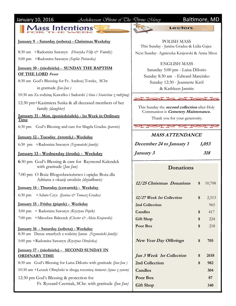 January 10, 2016 Archdiocesan Shrine of The Divine Mercy January 9 - Saturday (sobota) - Christmas Weekday 8:30 am +Radomira Sawaryn (Henryka Filip & Family) 5:00 pm +Radomira Sawaryn (Sophie Pniewska) January 10 - (niedziela) - SUNDAY THE BAPTISM OF THE LORD Feast 8:30 am God’s Blessing for Fr. Andrzej Totzke, SChr in gratitude (Jun-Jun ) Baltimore, MD POLISH MASS This Sunday - Janina Gradus & Lidia Gajec Next Sunday- Agnieszka Krajewski & Anna Mroz ENGLISH MASS Saturday 5:00 pm - Luisa DiIorio Sunday 8:30 am - Edward Marcinko Sunday 12:30 - Jeannette Król & Kathleen Jamitis 10:30 am Za rodzinę Kawałko i Sadorski (Ania i Stanisław z rodziną) 12:30 pm+Kazimiera Suska & all deceased members of her family (daughter) J January 11 - Mon. (poniedziałek) - 1st Week in Ordinary Time 6:30 pm This Sunday the second collection after Holy Communion is Cemetery Maintenance. Thank you for your generosity. God’s Blessing and care for Magda Gradus (parents) MASS ATTENDANCE January 12 - Tuesday (wtorek) - Weekday 6:30 pm +Radomira Sawaryn (Szymański family) December 24 to January 1 January 13 - Wednesday (środa) - Weekday January 3 6:30 pm God’s Blessing & care for Raymond Kalendek with gratitude (Jun Jun) 7:00 pm O Boże Błogosławieństwo i opięke Boża dla Adriana z okazji urodzin (dziadkowie) January 14 - Thursday (czwartek) - Weekday 6:30 pm +Adam Czyz (Janina & Tomasz Gradus) 1,053 318 Donations 12/25 Christmas Donations $ 10,708 12/27 Week 1st Collection $ 2,513 January 15 - Friday (piątek) - Weekday 2nd Collection 3:00 pm + Radomira Sawaryn (Krystyna Popik) Candles $ 417 7:00 pm +Mirosław Balcerek (Chester & Alicia Krajewski) Gift Shop $ 224 Poor Box $ 218 5:00 pm +Radomira Sawaryn (Krystyna Obrębska) New Year Day Offerings $ 705 January 17 - (niedziela) - SECOND SUNDAY IN ORDINARY TIME Jan 3 Week 1st Collection $ 2618 8:30 am God’s Blessing for Luisa DiIorio with gratitude (Jun-Jun ) 2nd Collection $ 982 10:30 am +Leszek Obrębski w drugą rocznicę śmierci (żona z synem) Candles 304 12:30 pm God’s Blessing & protection for Fr. Ryszard Czerniak, SChr. with gratitude (Jun Jun) Poor Box 87 Gift Shop 340 January 16 - Saturday (sobota) - Weekday 8:30 am Dusze zmarłych z rodziny Janus (Szymański family) 965 Archdiocesan Shrine of The Divine Mercy January 10, 2016 Baltimore, MD Milosierne Drzewko/Merciful Tree Apostolatu Przyjaciol Jezusa Miłosiernego LOSOWANIE NAGROD Wszystkim, którzy wzięli udział w naszej Adwentowej loterii fantowej-Miłosierne Drzewko, serdeczne Bóg zapłać. Wkrótce donację w wysokosci $2,505.00 przekazemy siostrom Urszulankom oraz ich podopiecznym w Poznaniu dokładajac dzięki Waszej hojności drodzy parafianie sporą ilość „cegiełek”do budowy ich nowej sali gimnastycznej. Siostry z wdzięcznością ogarniaja nas swoją modlitwą prosząc o Błogosławienstwo oraz łaski dla całej parafii. W niedzielę 27-go grudnia odbyło się losowanie nagród. 1-sza nagroda: 371333 2-ga: 238134 3-cia: 371386 i 4-ta: 0679302 Szczęśliwe numery prosimy zgłaszac do biura parafialnego. Friends of the Merciful Jesus Apostolate LOTTERY DRAWING Dear parishioners, thank you very much for participating in our Merciful Tree lottery. Thanks to your generosity the donation of $2,505.00 will be sent to the Ursulines sisters and their students to help in building the new gymnasium in their school in Poznan, Poland. The whole parish is wholeheartedly embraced by their prayers with gratitude. The lottery drawing took place on Sunday, December 27th Lucky winners please call the Rectory to claim the prizes. 1st prize: 371333 2nd prize: 238134 3rd prize: 371386 4th prize: 0679302 The large Votive Lamps on the Main Altar & in the Divine Mercy Shrine are lit for your special intentions on Friday night and continue to burn the following week until the candle burns itself out. The envelopes for lighting a Votive Lamp are in the pews and on the table in back of the church. Candles are burning for: 1. Katherine Butler for all her intentions 2. Sister Kay for her good health intentions 3. 4. 5. 6. Personal intention of Karina Kasztelnik God’s Blessing for Sandra Ricks successful surgery & recovery (Gerard Cegulski) God’s Blessing for Joanna Peizik successful surgery & recovery (sister and nieces) God’s Blessing for the safety & success of daughter Karen in China (Ben & Fran Karas) World Youth Days Młodzież z parafii Holy Rosary pragnie udać się na spotkanie z Ojcem Świętym Franciszkiem na Światowe Dni Młodzieży. Zbierając fundusze, w dniu 24 stycznia 2016, sprzedawać będą domowego wypieku ciasto. On Sunday, January 24th, there will be a bake sale after each Mass to raise funds for the young people of Holy Rosary to attend a meeting with Pope Francis on World Youth Day. January 10, 2016 Archdiocesan Shrine of The Divine Mercy Baltimore, MD NADCHODZĄCE WYDARZENIA Fridays Polska Msza Święta w piątki będzie sprawowana o godz. 7:00 pm Friday’s Polish Mass will be at 7:00 pm. January 15 Spotkanie Apostolatu Przyjaciół Jezusa Miłosiernego O godzinie 7:30 pm w każdy trzeci piątek miesiąca Friends of the Merciful Jesus Apostolate Meeting 7:30 pm & every 3rd Friday of the month January 17 POLISH SCHOOL NATIVITY PLAY / JASEŁKA in the Church immediately after 10:30 Mass OPŁATEK DINNER DANCE 1:00 pm Church Hall January 22 Uwielbienie Pana Jezusa Chrystusa w Najświętszym Sakramencie Adoration of Jesus Christ in the Blessed Sacrament 4th Friday of each month after Polish Mass January 23 Polska Szkoła Polish School January 24 Home Made Cake Sale for World Youth Day Fund Raising after each Mass Sprzedaż Ciasta Domowego Wypieku THE BAPTISM OF THE LORD With Jesus before the Father Luke’s account of the baptism of Jesus admits us to the secret depths of Jesus’ relationship with his Father. There, not only is he “reminded” of his identity as Beloved Son, but the Father’s “estimation” of his Son comes to his ears as well: “with you I am wel