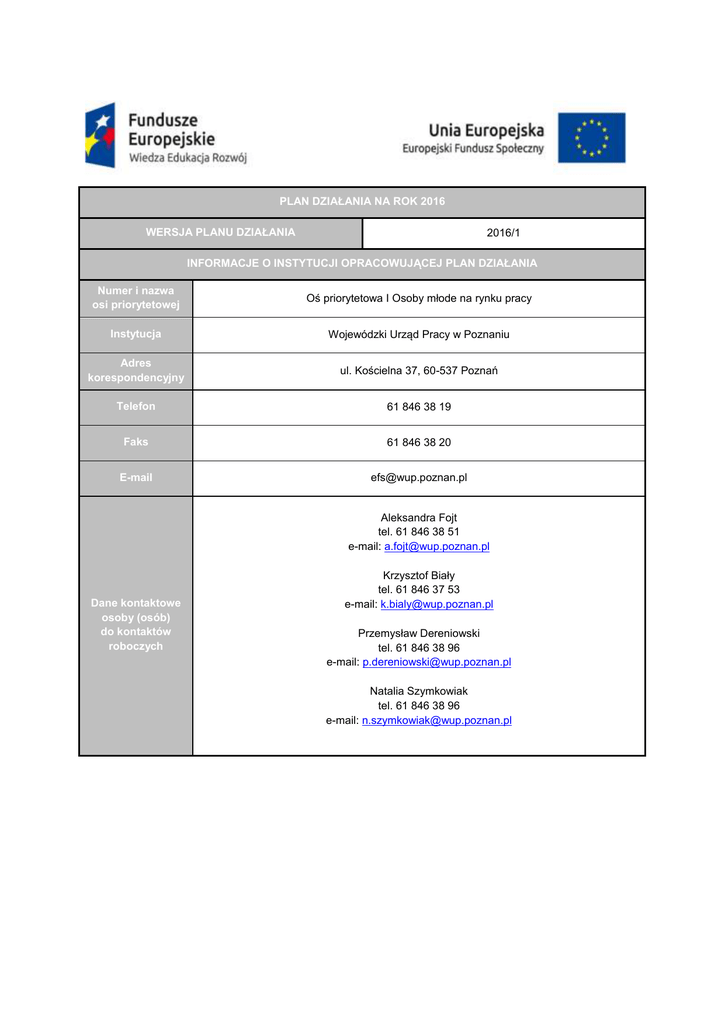 PLAN DZIAŁANIA NA ROK 2016 WERSJA PLANU DZIAŁANIA 2016/1 INFORMACJE O INSTYTUCJI OPRACOWUJĄCEJ PLAN DZIAŁANIA Numer i nazwa osi priorytetowej Oś priorytetowa I Osoby młode na rynku pracy Instytucja Wojewódzki Urząd Pracy w Poznaniu Adres korespondencyjny ul. Kościelna 37, 60-537 Poznań Telefon 61 846 38 19 Faks 61 846 38 20 E-mail [email protected] Aleksandra Fojt tel. 61 846 38 51 e-mail: [email protected] Dane kontaktowe osoby (osób) do kontaktów roboczych Krzysztof Biały tel. 61 846 37 53 e-mail: [email protected] Przemysław Dereniowski tel. 61 846 38 96 e-mail: [email protected] Natalia Szymkowiak tel. 61 846 38 96 e-mail: [email protected] DZIAŁANIE/PODDZIAŁANIE PO WER Działanie 1.1 Wsparcie osób młodych pozostających bez pracy na regionalnym rynku pracy – projekty pozakonkursowe/Poddziałanie 1.1.1 Wsparcie udzielane z Europejskiego Funduszu Społecznego FISZKA PROJEKTU POZAKONKURSOWEGO WDROŻENIOWEGO PODSTAWOWE INFORMACJE O PROJEKCIE Tytuł lub zakres projektu Uzasadnienie realizacji projektu w trybie pozakonkursowym Cel szczegółowy PO WER, w ramach którego projekt będzie realizowany Priorytet inwestycyjny Aktywizacja osób młodych pozostających bez pracy w województwie wielkopolskim. Uzasadnieniem jest charakter i cel projektów powiatowych urzędów pracy z terenu województwa. Możliwość zastosowania trybu pozakonkursowego wynika z zapisów art. 38 ust. 2 i 3 ustawy z dnia 11 lipca 2014 r. o zasadach realizacji programów w zakresie polityki spójności finansowanych w perspektywie finansowej 2014–2020 mówiących o wnioskodawcach oraz projektach, których wybór jest możliwy w trybie pozakonkursowym. Zgodnie z zapisami podrozdziału 5.2.1 Polityka spójności, rozdziału 5.2 Zasady wyboru projektów Umowy Partnerstwa z dnia 21 maja 2014 r. projektem pozakonkursowym EFS może być projekt o charakterze wdrożeniowym polegający na świadczeniu usług rynku pracy. Zwiększenie możliwości zatrudnienia osób młodych do 29 r.ż. bez pracy, w tym w szczególności osób, które nie uczestniczą w kształceniu i szkoleniu (tzw. młodzież NEET). Priorytet inwestycyjny 8ii trwała integracja na rynku pracy ludzi młodych, w szczególności tych, którzy nie pracują, nie kształcą się ani nie szkolą, w tym ludzi młodych zagrożonych wykluczeniem społecznym i ludzi młodych wywodzących się ze środowisk marginalizowanych, także poprzez wdrażanie gwarancji dla młodzieży. Instrumenty i usługi rynku pracy wynikające z Ustawy z dnia 20 kwietnia 2004 r. o promocji zatrudnienia i instytucjach rynku pracy (Dz.U. z 2013 r. poz. 674, z późn.zm.), z wyłączeniem robót publicznych, odnoszące się do następujących typów operacji: instrumenty i usługi rynku pracy służące indywidualizacji wsparcia oraz pomocy w zakresie określenia ścieżki zawodowej (obligatoryjne): 1. Typ/typy projektów przewidziane do realizacji w ramach projektu identyfikacja potrzeb osób młodych pozostających bez zatrudnienia oraz diagnozowanie możliwości w zakresie doskonalenia zawodowego, w tym identyfikacja stopnia oddalenia od rynku pracy osób młodych, kompleksowe i indywidualne pośrednictwo pracy w zakresie wyboru zawodu zgodnego z kwalifikacjami i kompetencjami wspieranej osoby lub poradnictwo zawodowe w zakresie planowania rozwoju kariery zawodowej, w tym podnoszenia lub uzupełniania kompetencji i kwalifikacji zawodowych, instrumenty i usługi rynku pracy skierowane do osób, które przedwcześnie opuszczają system edukacji lub osób, u których zidentyfikowano potrzebę uzupełnienia lub zdobycia nowych umiejętności i kompetencji: kontynuacja nauki dla osób młodych, u których zdiagnozowano potrzebę uzupełnienia edukacji formalnej lub potrzebę potwierdzenia kwalifikacji m.in. poprzez odpowiednie egzaminy, nabywanie, podwyższanie lub dostosowywanie kompetencji i kwalifikacji, niezbędnych na rynku pracy w kontekście zidentyfikowanych potrzeb osoby, której udzielane jest wsparcie, m.in. poprzez wysokiej jakości szkolenia, instrumenty i usługi rynku pracy służące zdobyciu doświadczenia zawodowego wymaganego przez pracodawców: nabywanie lub uzupełnianie doświadczenia zawodowego oraz praktycznych umiejętności w zakresie wykonywania danego zawodu, m.in. poprzez staże i praktyki, spełniające standardy wskazane w Europejskich Ramach Jakości Praktyk i Staży, 2. 3. 2 wsparcie zatrudnienia osoby młodej u przedsiębiorcy lub innego pracodawcy, stanowiące zachętę do zatrudnienia, m.in. poprzez pokrycie kosztów subsydiowania zatrudnienia dla osób, u których zidentyfikowano adekwatność tej formy wsparcia, refundację wyposażenia lub doposażenia stanowiska pracy (wyłącznie w połączeniu z subsydiowanym zatrudnieniem), instrumenty i usługi rynku pracy służące wsparciu mobilności międzysektorowej i geograficznej (uwzględniając mobilność zawodową na europejskim rynku pracy za pośrednictwem sieci EURES): wsparcie mobilności międzysektorowej dla osób, które mają trudności ze znalezieniem zatrudnienia w sektorze lub branży, m.in. poprzez zmianę lub uzupełnienie kompetencji lub kwalifikacji pozwalających na podjęcie zatrudnienia w innym sektorze, m.in. poprzez praktyki, staże i szkolenia, spełniające standardy wyznaczone dla tych usług (np. Europejskie i Polskie Ramy Jakości Praktyk i Staży), wsparcie mobilności geograficznej dla osób młodych, u których zidentyfikowano problem z zatrudnieniem w miejscu zamieszkania, m.in. poprzez pokrycie kosztów dojazdu do pracy lub wstępnego zagospodarowania w nowym miejscu zamieszkania, m.in. poprzez finansowanie kosztów dojazdu, zapewnienie środków na zasiedlenie, instrumenty i usługi rynku pracy skierowane do osób niepełnosprawnych: niwelowanie barier jakie napotykają osoby młode niepełnosprawne w zakresie zdobycia i utrzymania zatrudnienia, m.in. poprzez finansowanie pracy asystenta osoby niepełnosprawnej, którego praca spełnia standardy wyznacz