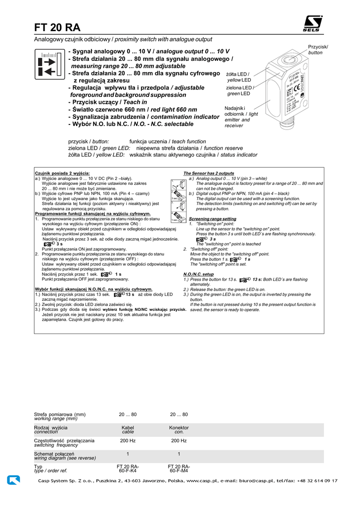 FT 20 RA Analogowy czujnik odbiciowy / proximity switch with analogue output - Sygna³ analogowy 0 ... 10 V / analogue output 0 ... 10 V - Strefa dzia³ania 20 ... 80 mm dla sygna³u analogowego / measuring range 20 ... 80 mm adjustable - Strefa dzia³ania 20 ... 80 mm dla sygna³u cyfrowego ¿ó³ta LED / yellow LED z regulacj¹ zakresu zielona LED / - Regulacja wp³ywu t³a i przedpola / adjustable green LED foreground and background suppression - Przycisk ucz¹cy / Teach in Nadajnik i - wiat³o czerwone 660 nm / red light 660 nm odbiornik / light - Sygnalizacja zabrudzenia / contamination indicator emitter and - Wybór N.O. lub N.C. / N.O. - N.C. selectable receiver Przycisk/ button przycisk / button: funkcja uczenia / teach function zielona LED / green LED: niepewna strefa dzia³ania / function reserve ¿ó³ta LED / yellow LED: wskanik stanu aktywnego czujnika / status indicator Czujnik posiada 2 wyjcia: a:) Wyjcie analogowe 0 ... 10 V DC (Pin 2 bia³y). Wyjcie analogowe jest fabrycznie ustawione na zakres 20 ... 80 mm i nie mo¿e byæ zmieniane. b:) Wyjcie cyfrowe PNP lub NPN, 100 mA (Pin 4 czarny) Wyjcie to jest u¿ywane jako funkcja skanuj¹ca. Strefa dzia³ania tej funkcji (poziom aktywny i nieaktywny) jest regulowana za pomoc¹ przycisku. Programowanie funkcji skanuj¹cej na wyjciu cyfrowym. 1. Programowanie punktu prze³¹czenia ze stanu niskiego do stanu wysokiego na wyjciu cyfrowym (prze³¹czenie ON) : Ustaw wykrywany obiekt przed czujnikiem w odleg³oci odpowiadaj¹cej ¿¹danemu punktowi prze³¹czania. Nacinij przycisk przez 3 sek. a¿ odie diody zaczn¹ migaæ jednoczenie. 3s Punkt prze³¹czenia ON jest zaprogramowany. 2. Programowanie punktu prze³¹czenia ze stanu wysokiego do stanu niskiego na wyjciu cyfrowym (prze³¹czenie OFF) : Ustaw wykrywany obiekt przed czujnikiem w odleg³oci odpowiadaj¹cej ¿¹danemu punktowi prze³¹czania. Nacinij przycisk przez 1 sek. 1s Punkt prze³¹czenia OFF jest zaprogramowany. The Sensor has 2 outputs a:) Analog output 0 ... 10 V (pin 3 – white) The analogue output is factory preset for a range of 20 ... 80 mm and can not be changed. b:) Digital output PNP or NPN, 100 mA (pin 4 – black) The digital output can be used with a screening function. The detection limits (switching on and switching off) can be set by pressing a button. Screening range setting 1. "Switching on" point: Line up the sensor to the "switching on" point. Press the button 3 s until both LED´s are flashing synchronously. 3s The "switching on" point is teached 2. "Switching off" point: Move the object to the "switching off" point. Press the button 1 s. 1s The "switching off" point is set. N.O./N.C. setup 1.) Press the button for 13 s. 13 s: Both LED´s are flashing alternately. Wybór funkcji skanuj¹cej N.O./N.C. na wyjciu cyfrowym. 2.) Release the button: the green LED is on. 1.) Nacinij przycisk przez czas 13 sek. 13 s a¿ obie diody LED 3.) During the green LED is on, the output is inverted by pressing the zaczn¹ migaæ naprzemiennie. button. 2.) Zwolnij przycisk: dioda LED zielona zawieci siê. If the button is not pressed during 10 s the present output function is 3.) Podczas gdy dioda siê wieci wybierz funkcjê NO/NC wciskaj¹c przycisk. saved, the sensor is ready to operate. Je¿eli przycisk nie jest naciskany przez 10 sek aktualna funkcja jest zapamiêtana. Czujnik jest gotowy do pracy. Strefa pomiarowa (mm) working range (mm) 20 ... 80 20 ... 80 Kabel cable Konektor con. Czêstotliwoæ prze³¹czania switching frequency 200 Hz 200 Hz Schemat po³¹czeñ wiring diagram (see reverse) 1 1 FT 20 RA60-F-K4 FT 20 RA60-F-M4 Rodzaj wyjcia connection Typ type / order ref. SELS S.J. ul. Malawskiego, 5a 02-641Warszawa, tel.: (022) 848 08 42, 848 52 81, fax: 848 16 48 e-mail: [email protected], http://www.sels.pl FT 20 RA Analogowy czujnik odbiciowy / proximity switch with analogue output Schemat po³¹czeñ / wiring br¹z PNP 1 czarny 4 bia³y 2 nieb 3 Uout 10 (V) +UB Wyj. cyfrowe 8 Wyj. analogowe 6 -UB Bild 1 / fig. 1 4 +UB: Wyj. cyfr: Wyj. analog: -UB: 2 15 ... 30 V DC PNP wyj. max. 100 mA 0 ... 10 VDC max. 3 mA 0 V DC 0 10 20 30 40 50 60 70 80 90 100 Strefa pomiarowa Abstand (mm)[mm] nadajnik nadajnik odbiornik odbiornik Parametry elektryczne / Electrical data (typ.) Parametry mechaniczne / Mechanical data Napiêcie zasilania:15 ... 30 V DC wew.zab. przed zmian¹ polar. operating voltage:15 ... 30 V DC internal polarity reversal prot. Materia³ obudowy: casing material: ABS ABS Pobór pr¹du bez obci¹¿enia: power consumption no load: < 30 mA przy 24 v DC < 30 mA at 24 v DC Stopieñ ochrony: protection standard: IP67 IP67 Wyjciowy sygna³ analogowy: analog output: 0 ... 10 V / max. 3 mA 0 ... 10 V / max. 3 mA Temperatura pracy: ambient temperature range: -20 ... +60 °C -20 ... +60 °C Temperatura przechowywania: storage temperature range: -20 ... +80 °C -20 ... +80 °C Obci¹¿. wyj. cyfrowego:100 mA z zabezp. krótkotrw. przeci¹¿. output current: 100 mA with short circuit protection Kabel: cable: 4 x 0,14 mm2 4 x 0,14 mm2 Czêstotliwoæ prze³¹czania wyj. cyfrowego (ti/tp 1:1):1000 Hz switching frequency (at ppp 1:1): 1000 Hz Standardowa d³ugoæ kabla: standard cable length: Klasa bezpieczeñstwa: protection class: Konektor: connection: Czêstotliwoæ prze³¹czania: switching frequency: 200 Hz 200 Hz 2m 2m M8x1 M8x1 Masa (wersja z konektorem): weight (plug): ca. 40 g app. 40 g Parametry optyczne / Optical data (typ.) Strefa pomiarowa: working range: Rodzaj regulacji: sensitivity adjustment: Materia³ odniesienia: reference material: Rodzaj wiat³a: used light: 20 ... 80 mm 20 ... 80 mm Teach in teach in Kodak bia³y, 90 %, 100x100 mm Kodak white, 90 %, 100x100 mm LED czerwone 660 nm LED red 660 nm Powy¿szy optyczny czujnik odbiciowy nie mo¿e byæ stosowany w aplikacjach bezpieczeñstwa lub podobnych. These Proximity Switches are not suited for safety related applications. SELS S.J. ul. Malawskiego, 5a 02-641Warszawa, tel.: (022) 848 08 42, 848 