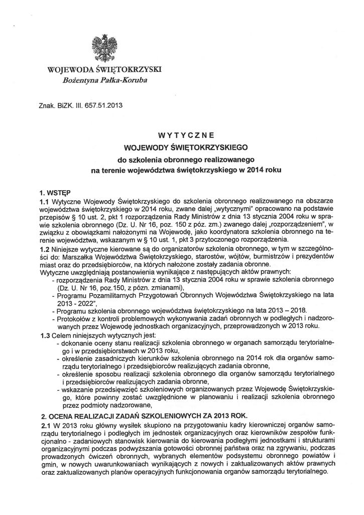 „P WOJEWODA ŚWIĘTOKRZYSKI Bożenlyna Pałka-Koruba Znak. B1ZK. III. 657.51.2013 WYTYCZ N E WOJEWODY ŚWIĘTOKRZYSKIEGO do szkolenia obronnego realizowanego na terenie województwa świętokrzyskiego w 2014 roku 1. WSTĘP 1.1 Wytyczne Wojewody Świętokrzyskiego do szkolenia obronnego realizowanego na obszarze województwa świętokrzyskiego w 2014 roku, zwane dalej „wytycznymi” opracowano na podstawie przepisów 10 ust. 2, pkt 1 rozporządzenia Rady Ministrów z dnia 13 stycznia 2004 roku w spra wie szkolenia obronnego (Dz. U. Nr 16, poz. 150 z póz. zm.) zwanego dalej „rozporządzeniem”, w związku z obowiązkami nałożonymi na Wojewodę, jako koordynatora szkolenia obronnego na te renie województwa, wskazanym w 10 ust. 1, pkt 3 przytoczonego rozporządzenia. 1.2 Niniejsze wytyczne kierowane są do organizatorów szkolenia obronnego, w tym w szczególno ści do: Marszałka Województwa Swiętokrzyskiego, starostów, wójtów, burmistrzów i prezydentów miast oraz do przedsiębiorców, na których nałożone zostały zadania obronne. Wytyczne uwzględniają postanowienia wynikające z następujących aktów prawnych: rozporządzenia Rady Ministrów z dnia 13 stycznia 2004 roku w sprawie szkolenia obronnego (Dz. U. Nr 16, poz.150, z pózn. zmianami), Programu Pozamilitarnych Przygotowań Obronnych Województwa Swiętokrzyskiego na lata 2013-2022”, Programu szkolenia obronnego województwa świętokrzyskiego na lata 2013 —2018. Protokołów z kontroli problemowych wykonywania zadań obronnych w podległych i nadzoro wanych przez Wojewodę jednostkach organizacyjnych, przeprowadzonych w 2013 roku. 1.3 Celem niniejszych wytycznych jest: dokonanie oceny stanu realizacji szkolenia obronnego w organach samorządu terytorialne go i w przedsiębiorstwach w 2013 roku, określenie zasadniczych kierunków szkolenia obronnego na 2014 rok dla organów samo rządu terytorialnego i przedsiębiorców realizujących zadania obronne, określenie sposobu realizacji szkolenia obronnego dla organów samorządu terytorialnego i przedsiębiorców realizujących zadania obronne, wskazanie przedsięwzięć szkoleniowych organizowanych przez Wojewodę Swiętokrzyskie go, które powinny zostać uwzględnione w planowaniu i realizacji szkolenia obronnego przez podmioty nadzorowane, - - - - - - - - 2. OCENA REALIZACJI ZADAŃ SZKOLENIOWYCH ZA 2013 ROK. 2.1 W 2013 roku główny wysiłek skupiono na przygotowaniu kadry kierowniczej organów samo rządu terytorialnego i podległych im jednostek organizacyjnych oraz kierowników zespołów funk cjonalno zadaniowych stanowisk kierowania do kierowania podległymi jednostkami i strukturami organizacyjnymi podczas podwyższania gotowości obronnej państwa oraz na zgrywaniu, podczas prowadzonych ćwiczeń obronnych, wybranych elementów podsystemu obronnego powiatów i gmin, w nowych uwarunkowaniach wynikających z nowych i zaktualizowanych aktów prawnych oraz zaktualizowanych planów operacyjnych funkcjonowania organów samorządu terytorialnego. - -22.2 Z analizy sprawozdań zawartych w Narodowym Kwestionariuszu Pozamilitarnych Przygotowań Obronnych i sprawozdań z realizacji szkolenia obronnego składanych przez organy samorządu terytorialnego do Wojewody Swiętokrzyskiego, jak również na podstawie prowadzonych kontroli oraz analizy dokumentów sprawozdawczych z przeprowadzonych ćwiczeń wynika, że: a) szkolenie obronne stało się dla dużej części jednostek samorządu terytorialnego ważnym, elementem wspierającym realizację zadań wykonywanych w ramach przygotowań obron nych państwa, w warunkach wystąpienia zagrożeń zarówno militarnych jak i pozamilitar nych na obszarze województwa świętokrzyskiego, b) w terenowych ćwiczeniach obronnych prowadzonych w powiatach i gminach doskonalono metodologię pracy komórek organizacyjnych i zespołów funkcjonalnych w czasie wypraco wywania decyzji do działania organu oraz umiejętności kierowniczej kadry i pracowników merytorycznych, przygotowując ich do wykonywania zadań na przewidywanych dla nich stanowiskach i funkcjach, a także zgrywano podległe i współdziałające jednostki organiza cyjne w praktycznej realizacji przewidzianych dla nich zadań. Do najlepiej przeprowadzo nych ćwiczeń obronnych należy zaliczyć ćwiczenia przeprowadzone przez UMiG Końskie, UM Sędziszów, UG Mirzec i UG Wilczyce. c) sukcesywnie doskonalony w województwie model prowadzenia pozamilitarnych przygoto wań obronnych, stwarza warunki i zapewnia doskonalenie umiejętności oraz podnoszenie kwalifikacji do wykonywania zadań w sytuacjach kryzysowych i wojennych wynikających z planów operacyjnych funkcjonowania organów przez wszystkich uczestników podsystemu obronnego województwa. 2.3 Do niedociągnięć występujących w procesie szkolenia obronnego należy zaliczyć: a) niepełną realizację zaplanowanych przedsięwzięć szkoleniowych w części powiatów oraz gmin województwa, jak również posiadanie niepełnej dokumentacji szkoleniowej, co jest skutkiem zbyt formalnie sprawowanego nadzoru nad szkoleniem, przez kierownictwa jed nostek samorządu terytorialnego, b) nieprzestrzeganie terminów opracowywania i uzgadniania planów szkolenia obronnego or ganów oraz terminów opracowywania i przedstawiania do uzgodnienia i akceptacji doku mentacji terenowych ćwiczeń obronnych, a także przypadki nieuzasadnionego przenosze nia ich na kolejne lata, c) nieobejmowanie szkoleniem obronnym jednostek podległych organom samorządu teryto rialnego, jak również jednostek współdziałających w wykonywaniu zadań obronnych, co powoduje, że ich kierownicy w dalszym ciągu w zbyt małym stopniu utożsamiają się z po wierzonymi im zadaniami obronnymi oraz ich miejscem i rolą w całokształcie przygotowań obronnych województwa, d) ukierunkowanie niektórych szkoleń na nierzeczywiste potrzeby, nie służące realizacji za sadniczych celów, ustalonych w programach i planach szkoleń obronnych, e) 