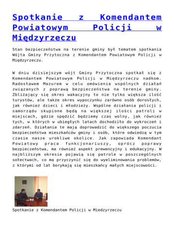 Spotkanie z Powiatowym Międzyrzeczu Komendantem Policji w Stan bezpieczeństwa na terenie gminy był tematem spotkania Wójta Gminy Przytoczna z Komendantem Powiatowym Policji w Międzyrzeczu. W dniu dzisiejszym wójt Gminy Przytoczna spotkał się z Komendantem Powiatowym Policji w Międzyrzeczu nadkom. Radosławem Mazurem w celu omówienia wspólnych działań związanych z poprawą bezpieczeństwa na terenie gminy. Zbliżający się okres wakacyjny to nie tylko większa ilość turystów, ale także okres wypoczynku zarówno osób dorosłych, jak również dzieci i młodzieży. Wspólne działania policji i samorządu skupione będą na większej ilości patroli w miejscach, gdzie spędzić będziemy czas wolny, jak również tych, w których w ubiegłych latach dochodziło do wykroczeń i zdarzeń. Działania te mają doprowadzić do większego poczucia bezpieczeństwa mieszkańców gminy i osób, które odwiedzą w tym czasie nasze urokliwe okolice. Jak zapowiada Komendant Powiatowy praca funkcjonariuszy, oprócz poprawy bezpieczeństwa, ma również aspekt prewencyjny i edukacyjny. W najbliższym okresie pojawią się patrole w poszczególnych sołectwach, co ma przyczynić się do wyeliminowania problemów, z którymi od lat borykają się mieszkańcy małych miejscowości. Spotkanie z Komendantem Policji w Miedzyrzeczu Spotkanie z Komendantem Policji w Miedzyrzeczu GDDKiA GDDKiA GDDKiA GDDKiA GDDKiA GDDKiA GDDKiA