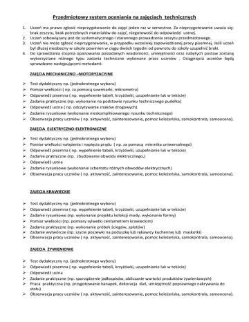 Przedmiotowy system oceniania na zajęciach technicznych 1. Uczeń ma prawo zgłosić nieprzygotowanie do zajęć jeden raz w semestrze. Za nieprzygotowanie uważa się: brak zeszytu, brak potrzebnych materiałów do zajęć, niegotowość do odpowiedzi ustnej. 2. Uczeń zobowiązany jest do systematycznego i starannego prowadzenia zeszytu przedmiotowego. 3. Uczeń nie może zgłosić nieprzygotowania, w przypadku wcześniej zapowiedzianej pracy pisemnej. Jeśli uczeń był dłużej nieobecny w szkole powinien w ciągu dwóch tygodni od powrotu do szkoły uzupełnić braki. 4. Do sprawdzania stopnia opanowania posiadanych wiadomości, umiejętności oraz nabytych postaw zostaną wykorzystane różnego typu zadania techniczne wykonane przez uczniów . Osiągnięcia uczniów będą sprawdzane następującymi metodami: ZAJĘCIA MECHANICZNO –MOTORYZACYJNE Test dydaktyczny np. (jednokrotnego wyboru) Pomiar wielkości ( np. za pomocą suwmiarki, mikrometru) Odpowiedź pisemna ( np. wypełnienie tabeli, krzyżówki, uzupełnianie luk w tekście) Zadanie praktyczne (np. wykonanie na podstawie rysunku technicznego pudełka) Odpowiedź ustna ( np. odczytywanie znaków drogowych) Zadanie rysunkowe (wykonanie nieskomplikowanego rysunku technicznego) Obserwacja pracy uczniów ( np. aktywność, zainteresowanie, pomoc koleżeńska, samokontrola, samoocena). ZAJĘCIA ELEKTRYCZNO-ELEKTRONICZNE Test dydaktyczny np. (jednokrotnego wyboru) Pomiar wielkości natężenia i napięcia prądu ( np. za pomocą miernika uniwersalnego) Odpowiedź pisemna ( np. wypełnienie tabeli, krzyżówki, uzupełnianie luk w tekście) Zadanie praktyczne (np. zbudowanie obwodu elektrycznego,) Odpowiedź ustna Zadanie rysunkowe (wykonanie schematu różnych obwodów elektrycznych) Obserwacja pracy uczniów ( np. aktywność, zainteresowanie, pomoc koleżeńska, samokontrola, samoocena). ZAJECIA KRAWIECKIE Test dydaktyczny np. (jednokrotnego wyboru) Odpowiedź pisemna ( np. wypełnienie tabeli, krzyżówki, uzupełnianie luk w tekście) Zadanie rysunkowe (np. wykonanie projektu kolekcji mody, wykonanie formy) Pomiar wielkości (np. pomiary sylwetki centymetrem krawieckim) Zadanie praktyczne (np. wykonanie próbek ściegów, splotów) Zadanie wytwórcze (np. szycie poszewki na poduszkę lub rękawicy kuchennej lub maskotki) Obserwacja pracy uczniów ( np. aktywność, zainteresowanie, pomoc koleżeńska, samokontrola, samoocena). ZAJECIA ŻYWIENIOWE Test dydaktyczny np. (jednokrotnego wyboru) Odpowiedź pisemna ( np. wypełnienie tabeli, krzyżówki, uzupełnianie luk w tekście) Odpowiedź ustna Zadanie praktyczne (np. sporządzenie jadłospisów, obliczanie wartości produktów żywieniowych) Praca praktyczna (np. przygotowanie kanapek, dekoracja dań, umiejętność poprawnego nakrywania do stołu) Obserwacja pracy uczniów ( np. aktywność, zainteresowanie, pomoc koleżeńska, samokontrola, samoocena). 5. Ocenę semestralną/ roczną wystawia nauczyciel w oparciu o pracę ucznia i uzyskiwane efekty. Ocena semestralna/ roczna nie jest średnią arytmetyczną ocen cząstkowych, gdyż te mają różną wagę. Lp Oceniana aktywność ucznia % udział w ocenie podsumowującej (waga oceny) 1. Prace praktyczne wykonane na lekcji 30 2. Kartkówki i inne prace pisemne 20 3. Odpowiedzi ustne 20 4. Aktywność, praca na lekcji 20 5. Pozostałe (prowadzenie zeszytu, przygotowanie materiałów do pracy na lekcji, prace dodatkowe itp.) 10 6. Uczeń może otrzymać ocenę z przedmiotu bardzo dobrą lub dobrą jeśli w zakresie swoich osiągnięć spełnia wymagania na poziomie ponadpodstawowym, natomiast ocenę dostateczną lub dopuszczającą jeśli jego osiągnięcia mieszczą się na w zakresie wymagań podstawowych. 7. Na ocenę celującą uczeń musi wykazywać się wiedzą i umiejętnościami wykraczającymi poza program nauczania, samodzielną i systematyczną pracą w wykonywaniu zadań o podwyższonym stopniu trudności oraz osiągnięciami w konkursach związanych z przedmiotem zajęcia techniczne. 8. Szczegółowe wymagania na poszczególne oceny zostały określone w rozkładach materiału i uczniowie są o nich informowani na bieżąco. Opracowała Barbara Olbromska