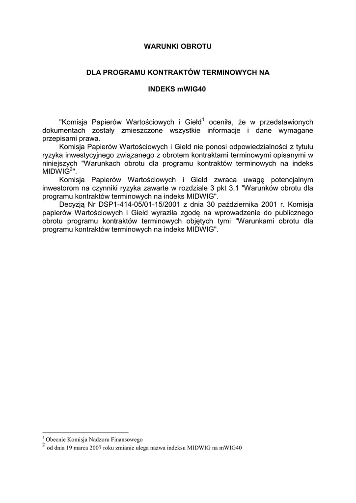 WARUNKI OBROTU DLA PROGRAMU KONTRAKTÓW TERMINOWYCH NA INDEKS mWIG40 "Komisja Papierów Wartościowych i Giełd1 oceniła, że w przedstawionych dokumentach zostały zmieszczone wszystkie informacje i dane wymagane przepisami prawa. Komisja Papierów Wartościowych i Giełd nie ponosi odpowiedzialności z tytułu ryzyka inwestycyjnego związanego z obrotem kontraktami terminowymi opisanymi w niniejszych "Warunkach obrotu dla programu kontraktów terminowych na indeks MIDWIG2". Komisja Papierów Wartościowych i Giełd zwraca uwagę potencjalnym inwestorom na czynniki ryzyka zawarte w rozdziale 3 pkt 3.1 "Warunków obrotu dla programu kontraktów terminowych na indeks MIDWIG". Decyzją Nr DSP1-414-05/01-15/2001 z dnia 30 października 2001 r. Komisja papierów Wartościowych i Giełd wyraziła zgodę na wprowadzenie do publicznego obrotu programu kontraktów terminowych objętych tymi "Warunkami obrotu dla programu kontraktów terminowych na indeks MIDWIG". 1 2 Obecnie Komisja Nadzoru Finansowego od dnia 19 marca 2007 roku zmianie ulega nazwa indeksu MIDWIG na mWIG40 Definicje i skróty instrument bazowy – Warszawski Indeks Giełdowy Średnich Spółek mWIG40 seria kontraktu – kontrakty terminowe odpowiadające określonemu przez giełdę standardowi charakteryzujące się w szczególności tym samym instrumentem bazowym i tą samą datą wygaśnięcia. klasa kontraktu – klasa obejmuje wszystkie serie kontraktów terminowych mające ten sam instrument bazowy i odpowiadające temu samemu standardowi. dzień wygaśnięcia – ostatni dzień obrotu, ostateczna cena rozliczeniowa w tym dniu stanowi podstawę wyliczenia ostatecznej kwoty rozliczeniowej mnożnik – jednostka pieniężna przez którą pomnożona zostaje wartość jednego punktu indeksu mWIG40. kurs kontraktu – przyjęta przez strony transakcji terminowej w dniu zawarcia transakcji wysokość indeksu mWIG40. wartość kontraktu – kurs kontraktu pomnożony przez mnożnik pozycja długa – nabycie kontraktu terminowego. pozycja krótka – zbycie (wystawienie) kontraktu terminowego. zamknięcie pozycji – ustanie praw i zobowiązań związanych z nabyciem lub zbyciem kontraktu terminowego. Zamknięcie pozycji następuje w wyniku zbycia kontraktu terminowego jeżeli został on wcześniej nabyty lub też nabycia kontraktu terminowego jeżeli został on wcześniej zbyty. Kontrakt zamykający musi być z tej samej serii co kontrakt zamykany. Wygaśnięcie kontraktu powoduje zamknięcie wszystkich otwartych pozycji w wygasającej serii. pozycja przeciwstawna – pozycją przeciwstawną do pozycji krótkiej jest pozycja długa dotycząca kontraktów tej samej serii; pozycją przeciwstawną do pozycji długiej jest pozycja krótka dotycząca kontraktów tej samej serii. pozycja skorelowana – pozycją skorelowaną do pozycji krótkiej jest pozycja długa dotycząca kontraktów innej serii w ramach tej samej klasy; pozycją skorelowaną do pozycji długiej jest pozycja krótka dotycząca kontraktów innej serii w ramach tej samej klasy. konto indywidualne– zbiór kont podmiotowych oznaczonych tym samym numerem klasyfikacyjnym klienta (NKK). konto podmiotowe – konto ewidencyjne, oznaczone co do kodu instrumentu (prawa) pochodnego, kodu uczestnika, typu własności w KDPW, rodzaju konta, numeru klasyfikacyjnego klienta oraz identyfikatora portfela. -1- portfel – zajęte pozycje w instrumentach pochodnych zarejestrowanych na kontach podmiotowych, w zakresie których status uczestnika rozliczającego posiada ten sam uczestnik w tym samym rodzaju działalności, oznaczone tym samym numerem klasyfikacyjnym klienta i tym samym kodem portfela. kwota rozliczenia – kwota, którą inwestor jest zobowiązany wnieść lub którą ma prawo otrzymać w wyniku bieżących rozrachunków rynkowych lub ostatecznego rozliczenia. Skróty użyte w tekście: KNF – Komisja Nadzoru Finansowego (dawniej Komisja Papierów Wartościowych i Giełd) Giełda – Giełda Papierów Wartościowych w Warszawie S.A. KDPW – Krajowy Depozyt Papierów Wartościowych S.A. KDPW_CCP – KDPW_CCP S.A. kontrakt terminowy – kontrakt terminowy na Warszawski Indeks Giełdowy Średnich Spółek mWIG40 Warunki obrotu – Warunki obrotu dla programu kontraktów terminowych na indeks mWIG40 Ustawa o publicznym obrocie – ustawa z dnia 21 sierpnia 1997 roku Prawo o publicznym obrocie papierami wartościowymi (tekst jednolity: Dz. U. z 2002 r. Nr 49, poz. 447 z późn. zm.) – uwaga: ustawa nie obowiązuje, została zastąpiona przez Ustawę o obrocie oraz Ustawę o ofercie Ustawa o obrocie – Ustawa z dnia 29 lipca 2005 r. o obrocie instrumentami finansowymi (tekst jednolity: Dz. U. z 2010 r. Nr 211 poz. 1384 z późn. zm.) Ustawa o ofercie – Ustawa z dnia 29 lipca 2005 r. o ofercie publicznej i warunkach wprowadzania instrumentów finansowych do zorganizowanego systemu obrotu oraz spółkach publicznych (tekst jednolity: Dz. U. z 2009 r. Nr 185, poz. 1439 z późn. zm.) Rozporządzenie - Rozporządzenie Rady Ministrów z dnia 11 października 2005 roku w sprawie dopuszczania instrumentów finansowych niebędących papierami wartościowymi do obrotu na rynku regulowanym (Dz. U z 2005 r. Nr 205 poz.1699) Regulamin Giełdy - Regulamin Giełdy Papierów Wartościowych uchwalony Uchwałą Nr 1/1110/2006 Rady Giełdy z dnia 4 stycznia 2006 roku z późn. zm. (aktualny tekst Regulaminu Giełdy znajduje się na stronie internetowej Giełdy www.gpw.pl) SZOG – Szczegółowe Zasady Obrotu Giełdowego w systemie UTP uchwalone Uchwałą Nr 1038/2012 Zarządu Giełdy z dnia 17 października 2012 roku z późn. zm. (aktualny tekst SZOG znajduje się na stronie internetowej Giełdy www.gpw.pl) -2- 1. Wstęp. Kontrakty terminowe na Warszawski Indeks Giełdowy Średnich Spółek mWIG40, stanowią program praw pochodnych w rozumieniu §4 ust. 2 Rozporządzenia Zgodnie z § 58 Regulaminu Giełdy przez kontrakt terminowy rozumie się umowę zawartą na giełdzie pomiędzy spr