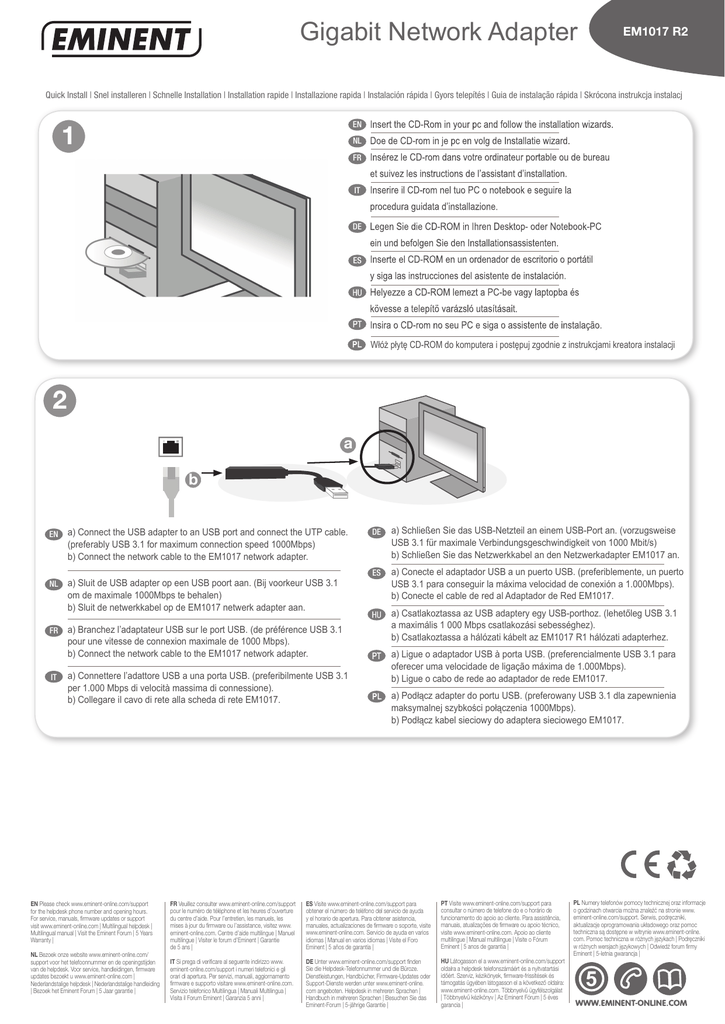 Gigabit Network Adapter EM1017 R2 Quick Install | Snel installeren | Schnelle Installation | Installation rapide | Installazione rapida | Instalación rápida | Gyors telepítés | Guia de instalação rápida | Skrócona instrukcja instalacj 1 EN NL FR IT DE ES Włóż płytę CD-ROM do komputera i postępuj zgodnie z instrukcjami kreatora instalacji 2 a b EN a) Connect the USB adapter to an USB port and connect the UTP cable. (preferably USB 3.1 for maximum connection speed 1000Mbps) b) Connect the network cable to the EM1017 network adapter. NL a) Sluit de USB adapter op een USB poort aan. (Bij voorkeur USB 3.1 om de maximale 1000Mbps te behalen) b) Sluit de netwerkkabel op de EM1017 netwerk adapter aan. FR IT a) Branchez l’adaptateur USB sur le port USB. (de préférence USB 3.1 pour une vitesse de connexion maximale de 1000 Mbps). b) Connect the network cable to the EM1017 network adapter. a) Connettere l’adattore USB a una porta USB. (preferibilmente USB 3.1 per 1.000 Mbps di velocità massima di connessione). b) Collegare il cavo di rete alla scheda di rete EM1017. EN Please check www.eminent-online.com/support for the helpdesk phone number and opening hours. For service, manuals, firmware updates or support visit www.eminent-online.com | Multilingual helpdesk | Multilingual manual | Visit the Eminent Forum | 5 Years Warranty | NL Bezoek onze website www.eminent-online.com/ support voor het telefoonnummer en de openingstijden van de helpdesk. Voor service, handleidingen, firmware updates bezoekt u www.eminent-online.com | Nederlandstalige helpdesk | Nederlandstalige handleiding | Bezoek het Eminent Forum | 5 Jaar garantie | DE a) Schließen Sie das USB-Netzteil an einem USB-Port an. (vorzugsweise USB 3.1 für maximale Verbindungsgeschwindigkeit von 1000 Mbit/s) b) Schließen Sie das Netzwerkkabel an den Netzwerkadapter EM1017 an. ES a) Conecte el adaptador USB a un puerto USB. (preferiblemente, un puerto USB 3.1 para conseguir la máxima velocidad de conexión a 1.000Mbps). b) Conecte el cable de red al Adaptador de Red EM1017. a) Csatlakoztassa az USB adaptery egy USB-porthoz. (lehetőleg USB 3.1 a maximális 1 000 Mbps csatlakozási sebességhez). b) Csatlakoztassa a hálózati kábelt az EM1017 R1 hálózati adapterhez. a) Ligue o adaptador USB à porta USB. (preferencialmente USB 3.1 para oferecer uma velocidade de ligação máxima de 1.000Mbps). b) Ligue o cabo de rede ao adaptador de rede EM1017. a) Podłącz adapter do portu USB. (preferowany USB 3.1 dla zapewnienia maksymalnej szybkości połączenia 1000Mbps). b) Podłącz kabel sieciowy do adaptera sieciowego EM1017. FR Veuillez consulter www.eminent-online.com/support pour le numéro de téléphone et les heures d’ouverture du centre d’aide. Pour l’entretien, les manuels, les mises à jour du firmware ou l’assistance, visitez www. eminent-online.com. Centre d’aide multilingue | Manuel multilingue | Visiter le forum d’Eminent | Garantie de 5 ans | ES Visite www.eminent-online.com/support para obtener el número de teléfono del servicio de ayuda y el horario de apertura. Para obtener asistencia, manuales, actualizaciones de firmware o soporte, visite www.eminent-online.com. Servicio de ayuda en varios idiomas | Manual en varios idiomas | Visite el Foro Eminent | 5 años de garantía | PT Visite www.eminent-online.com/support para consultar o número de telefone do e o horário de funcionamento do apoio ao cliente. Para assistência, manuais, atualizações de firmware ou apoio técnico, visite www.eminent-online.com. Apoio ao cliente multilingue | Manual multilingue | Visite o Fórum Eminent | 5 anos de garantia | IT Si prega di verificare al seguente indirizzo www. eminent-online.com/support i numeri telefonici e gli orari di apertura. Per servizi, manuali, aggiornamento firmware e supporto visitare www.eminent-online.com. Servizio telefonico Multilingua | Manuali Multilingua | Visita il Forum Eminent | Garanzia 5 anni | DE Unter www.eminent-online.com/support finden Sie die Helpdesk-Telefonnummer und die Büroze. Dienstleistungen, Handbücher, Firmware-Updates oder Support-Dienste werden unter www.eminent-online. com angeboten. Helpdesk in mehreren Sprachen | Handbuch in mehreren Sprachen | Besuchen Sie das Eminent-Forum | 5-jährige Garantie | HU Látogasson el a www.eminent-online.com/support oldalra a helpdesk telefonszámáért és a nyitvatartási időért. Szerviz, kézikönyek, firmware-frissítések és támogatás ügyében látogasson el a következő oldalra: www.eminent-online.com. Többnyelvű ügyfélszolgálat | Többnyelvű kézikönyv | Az Eminent Fórum | 5 éves garancia | PL Numery telefonów pomocy technicznej oraz informacje o godzinach otwarcia można znaleźć na stronie www. eminent-online.com/support. Serwis, podręczniki, aktualizacje oprogramowania układowego oraz pomoc techniczna są dostępne w witrynie www.eminent-online. com. Pomoc techniczna w różnych językach | Podręczniki w różnych wersjach językowych | Odwiedź forum firmy Eminent | 5-letnia gwarancja | 5