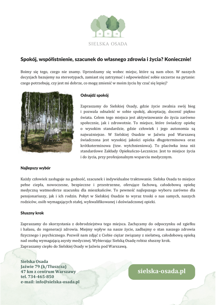Spokój, współistnienie, szacunek do własnego zdrowia i życia? Koniecznie! Boimy się tego, czego nie znamy. Uprzedzamy się wobec miejsc, które są nam obce. W naszych decyzjachbazujemyna stereotypach,zamiastsięzatrzymaćiodpowiedziećsobieszczerzenapytanie: czegopotrzebuję,czyjestmidobrze,comogęzmienićwmoimżyciubyczućsięlepiej? Odnajdź spokój Zapraszamy do Sielskiej Osady, gdzie życie zwalnia swój bieg i pozwala odnaleźć w sobie spokój, akceptację, docenić piękno świata. Celem tego miejsca jestaktywizowanie do życia zarówno społecznie, jak i zdrowotnie. To miejsce, które świadczy opiekę o wysokim standardzie, gdzie człowiek i jego autonomia są najważniejsze. W Sielskiej Osadzie w Jaźwiu pod Warszawą świadczona jest wysokiej jakości opieka długoterminowa oraz krótkoterminowa (tzw. wytchnieniowa). To placówka inna niż standardowe ZakładyOpiekuńczo-Lecznicze. Jestto miejsce życia idożycia,przyprofesjonalnymwsparciumedycznym. Najlepszy wybór Każdyczłowiekzasługujena godność,szacunekiindywidualnetraktowanie.Sielska Osada tomiejsce pełne ciepła, nowoczesne, bezpieczne i przestrzenne, oferujące fachową, całodobową opiekę medyczną watmosferze szacunku dla mieszkańców. To pewność najlepszego wyboru zarówno dla pensjonariuszy, jak i ich rodzin. Pobyt w Sielskiej Osadzie to wyraz troski o nas samych, naszych rodziców,osóbwymagającychstałej,wykwaliUikowanejidoświadczonejopieki. Słuszny krok Zapraszamy do skorzystania z dobrodziejstwa tego miejsca. Zachęcamy do odpoczynku od zgiełku i hałasu, do regeneracji zdrowia. Miejmy wpływna nasze życie, zadbajmyo stan naszego zdrowia Uizycznegoipsychicznego.PozwólnamzdjąćzCiebie ciężarzwiązanyzniełatwą, całodobowąopieką nadosobąwymagającąasystymedycznej.WybierającSielskąOsadęrobiszsłusznykrok. ZapraszamyciepłodoSielskiejOsadywJaźwiupodWarszawą. SielskaOsada Jaźwie79(k/Tłuszcza) 47kmzcentrumWarszawy tel.734-465-850 e-mail:[email protected] SielskaOsada ZakładOpiekuńczo-Leczniczy sielska-osada.pl T:734-465-850 E:[email protected] Jaźwie79 05-240Tłuszcz