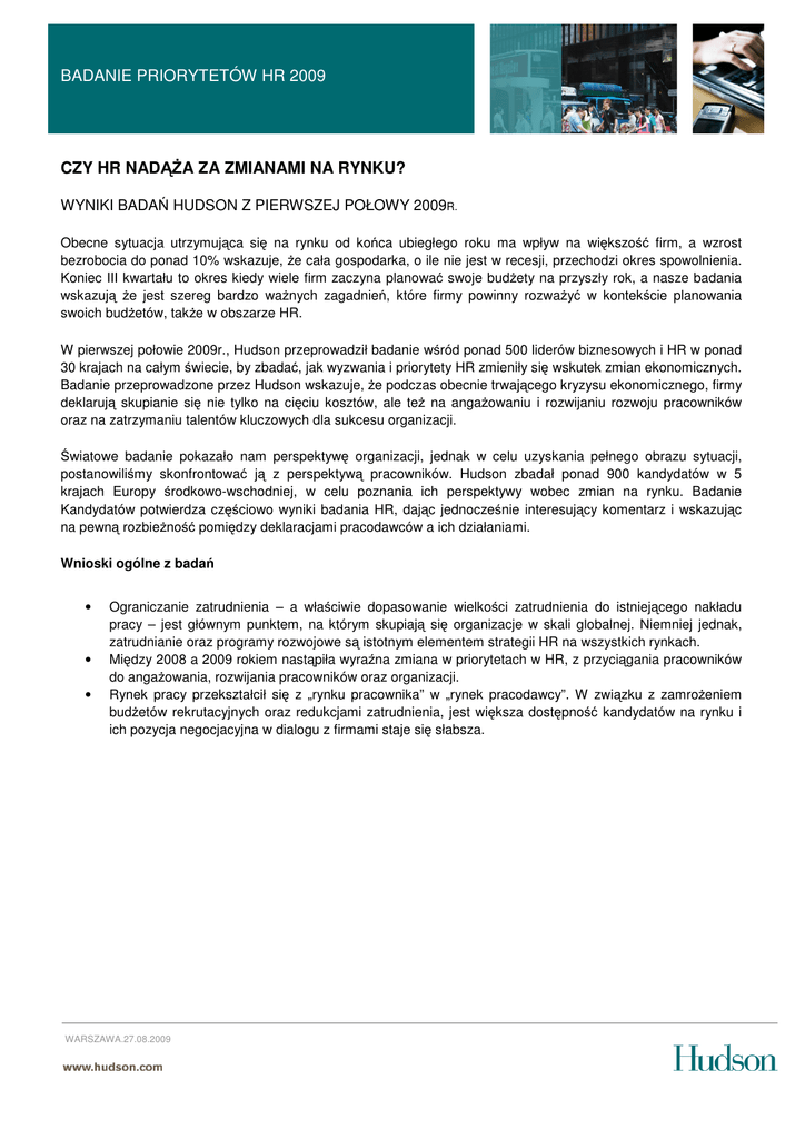 BADANIE PRIORYTETÓW HR 2009 CZY HR NADĄŻA ZA ZMIANAMI NA RYNKU? WYNIKI BADAŃ HUDSON Z PIERWSZEJ POŁOWY 2009R. Obecne sytuacja utrzymująca się na rynku od końca ubiegłego roku ma wpływ na większość firm, a wzrost bezrobocia do ponad 10% wskazuje, że cała gospodarka, o ile nie jest w recesji, przechodzi okres spowolnienia. Koniec III kwartału to okres kiedy wiele firm zaczyna planować swoje budżety na przyszły rok, a nasze badania wskazują że jest szereg bardzo ważnych zagadnień, które firmy powinny rozważyć w kontekście planowania swoich budżetów, także w obszarze HR. W pierwszej połowie 2009r., Hudson przeprowadził badanie wśród ponad 500 liderów biznesowych i HR w ponad 30 krajach na całym świecie, by zbadać, jak wyzwania i priorytety HR zmieniły się wskutek zmian ekonomicznych. Badanie przeprowadzone przez Hudson wskazuje, że podczas obecnie trwającego kryzysu ekonomicznego, firmy deklarują skupianie się nie tylko na cięciu kosztów, ale też na angażowaniu i rozwijaniu rozwoju pracowników oraz na zatrzymaniu talentów kluczowych dla sukcesu organizacji. Światowe badanie pokazało nam perspektywę organizacji, jednak w celu uzyskania pełnego obrazu sytuacji, postanowiliśmy skonfrontować ją z perspektywą pracowników. Hudson zbadał ponad 900 kandydatów w 5 krajach Europy środkowo-wschodniej, w celu poznania ich perspektywy wobec zmian na rynku. Badanie Kandydatów potwierdza częściowo wyniki badania HR, dając jednocześnie interesujący komentarz i wskazując na pewną rozbieżność pomiędzy deklaracjami pracodawców a ich działaniami. Wnioski ogólne z badań • • • Ograniczanie zatrudnienia – a właściwie dopasowanie wielkości zatrudnienia do istniejącego nakładu pracy – jest głównym punktem, na którym skupiają się organizacje w skali globalnej. Niemniej jednak, zatrudnianie oraz programy rozwojowe są istotnym elementem strategii HR na wszystkich rynkach. Między 2008 a 2009 rokiem nastąpiła wyraźna zmiana w priorytetach w HR, z przyciągania pracowników do angażowania, rozwijania pracowników oraz organizacji. Rynek pracy przekształcił się z „rynku pracownika” w „rynek pracodawcy”. W związku z zamrożeniem budżetów rekrutacyjnych oraz redukcjami zatrudnienia, jest większa dostępność kandydatów na rynku i ich pozycja negocjacyjna w dialogu z firmami staje się słabsza. WARSZAWA.27.08.2009 BADANIE PRIORYTETÓW HR 2009 1. PRIORYTET HR: OGRANICZANIE ZATRUDNIENIA PRZY UTRZYMANIU ZAANGAŻOWANIA PRACOWNIKÓW Badanie światowe HR pokazuje, że 36% całej próby firm deklaruje, że będzie ograniczać zatrudnienie w ciągu następnego roku. Organizacje we wszystkich regionach obniżają poziomy zatrudnienia w celu redukcji kosztów. W wyniku zmian na rynku średnio 79% firm globalnie zamroziło operacyjne decyzje personalne 2009 r., w porównaniu z 22% w roku 2008. Podobnie, w zależności od regionu, od 60% do 81% organizacji donosiło, że ich obecna strategia HR uwzględnia redukcję pracowników. Początkowo, natychmiastową reakcją wielu firm na warunki rynkowe było zrezygnowanie z usług kontraktorów jako sposób na obniżenie kosztów. Stopniowo, działania operacyjne, takie jak nagłe kończenie kontraktów i zamrażanie rekrutacji, były zastępowane przez bardziej kompleksowe strategie cięcia kosztów, prowadzące w rezultacie do redukcji stałego zatrudnienia. Nasz komentarz: • Firmy nie powinny myśleć liniowo odnośnie redukcji personelu raczej potrzebują przyjrzeć się bliżej kwestii, którzy pracownicy powinni pozostać. Wyniki naszego badania pokazują wysoką wagę angażowania i motywowania pracowników (2. priorytet, wspominany przez 23% firm w Europie), co może oznaczać, że organizacje rozumieją, że czysto liniowe podejmowanie decyzji nie jest najlepszym sposobem działania. • Następna faza kryzysu może zaskoczyć firmy, które kładą mniejszy nacisk na rozwój organizacji (III priorytet, wspomniany przez 18% firm w Europie) i rozwój pracowników (IV priorytet, 17% firm w Europie). Organizacje powinny być świadome faktu, że poprzez zwolnienia tracą istotne zdolności, oraz nadają pozostałym pracownikom nowe role, do których nie są jeszcze oni przygotowani. • W konsekwencji firmy powinny raczej wcześniej niż później skupić uwagę na pracownikach osiągających najwyższe wyniki (top performers), o wysokich potencjałach oraz na pracownikach „niezastąpionych”. • Niektóre organizacje pozostają przy niezmienionej liczbie personelu, ale wyzwaniem staje się zapewnienie pracownikom wystarczającej ilości pracy. Widzimy, że część firm inwestuje w programy rozwoju kompetencji, by produktywnie wykorzystać nadmiar wolnego czasu pracowników. Z perspektywy pracownika • W lipcu 2009 ponad połowa badanych regionalnie pracowników (57%) spodziewała się zmiany zawodowej w ciągu kwartału z czego na zwolnienie oczekiwało 41 %. BADANIE PRIORYTETÓW HR 2009 2 PRIORYTET HR: IDENTYFIKACJA WEWNĘTRZNA TALENTÓW I STRATEGICZNE ZATRUDNIANIE Badanie wskazuje, że 61% firm europejskich w 2009 roku kładzie nacisk na wewnętrzną ocenę pracowników, rozwój, oraz strategiczne zatrudnianie. Jednocześnie interesujący jest fakt, że pewien procent respondentów we wszystkich regionach (18% w Europie, 15% w Azji, 9% USA, 17% w Australii) ciągle planuje zwiększanie zatrudnienia. To oznacza, że organizacje przy uwzględnieniu konieczności ograniczenia kosztów, koncentrują się na bardziej trafnych metodach oceny, pozwalających wcześniej identyfikować produktywnych i nieproduktywnych pracowników i w efekcie właściwie planować zatrudnienie nowych, tak aby nie dopuszczać do przerostu zatrudnienia – problemu leżącego u podstaw wielu dramatycznych grupowych zwolnień. Odsetek firm planujących zatrudnienie można tłumaczyć z jednej strony ciągłym, choć już nie tak szybkim, rozwojem niektórych sektorów. Można również 