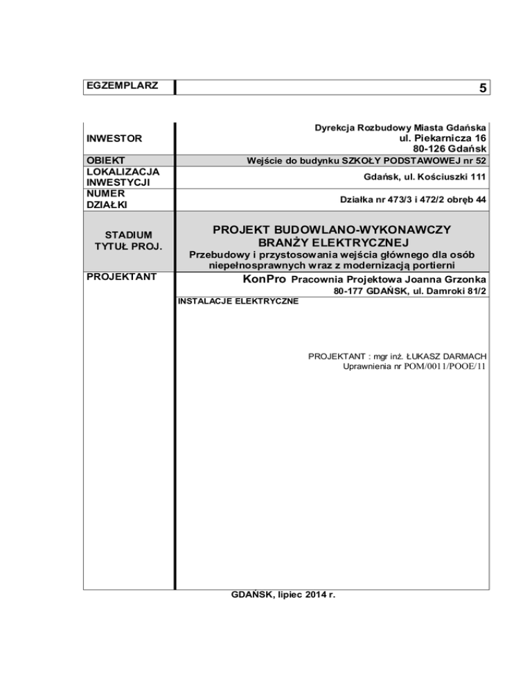 EGZEMPLARZ 5 Dyrekcja Rozbudowy Miasta Gdańska ul. Piekarnicza 16 80-126 Gdańsk INWESTOR OBIEKT LOKALIZACJA INWESTYCJI NUMER DZIAŁKI STADIUM TYTUŁ PROJ. PROJEKTANT Wejście do budynku SZKOŁY PODSTAWOWEJ nr 52 Gdańsk, ul. Kościuszki 111 Działka nr 473/3 i 472/2 obręb 44 PROJEKT BUDOWLANO-WYKONAWCZY BRANŻY ELEKTRYCZNEJ Przebudowy i przystosowania wejścia głównego dla osób niepełnosprawnych wraz z modernizacją portierni KonPro Pracownia Projektowa Joanna Grzonka 80-177 GDAŃSK, ul. Damroki 81/2 INSTALACJE ELEKTRYCZNE PROJEKTANT : mgr inż. ŁUKASZ DARMACH Uprawnienia nr POM/0011/POOE/11 GDAŃSK, lipiec 2014 r. SPIS TREŚCI: 1. CEL OPRACOWANIA............................................................................................................................................ 3 2. PODSTAWA OPRACOWANIA ............................................................................................................................ 3 3. TEMAT OPRACOWANIA ..................................................................................................................................... 3 4. OPIS TECHNICZNY ............................................................................................................................................... 3 4.1 4.2 4.3 4.4 4.5 4.6 4.7 4.8 4.9 ZAKRES OPRACOWANIA.......................................................................................................................................... 3 STAN ISTNIEJĄCY .................................................................................................................................................... 3 INSTALACJA GNIAZD WTYCZKOWYCH ................................................................................................................... 3 INSTALACJA OŚWIETLENIOWA................................................................................................................................ 4 INSTALACJA OŚWIETLENIA EWAKUACYJNEGO ...................................................................................................... 4 OCHRONA PRZECIWPORAŻENIOWA ........................................................................................................................ 4 OCHRONA PRZECIWPOŻAROWA.............................................................................................................................. 5 WARUNKI TECHNICZNE WYKONANIA I ODBIORU ROBÓT ...................................................................................... 5 NORMY I PRZEPISY .................................................................................................................................................. 5 5. ZESTAWIENIE MATERIAŁÓW PODSTAWOWYCH .................................................................................. 6 6. ZESTAWIENIE DEMONTAŻOWE..................................................................................................................... 6 6.1 OBLICZENIA NATĘŻENIA OŚWIETLENIA ................................................................................................................. 7 7. ZAŁĄCZNIKI ........................................................................................................................................................... 8 8. RYSUNKI................................................................................................................................................................. 15 9. INFORMACJA DOTYCZĄCA BEZPIECZEŃSTWA I OCHRONY ZDROWIA .................................... 17 10. OŚWIADCZENIE PROJEKTANTA ZGODNIE Z ART. 20.4 PRAWA BUDOWLANEGO ............. 20 2 1. CEL OPRACOWANIA Celem opracowania jest wykonanie nowej instalacji elektrycznej wiatrołapu w szkole podstawowej nr 52 przy ul. Kościuszki 111 w Gdańsku 2. PODSTAWA OPRACOWANIA Projekt został opracowany na podstawie: 3. • Zlecenia Inwestora • Wizji lokalnej w terenie • Danych technicznych sprzętu i urządzeń • Obowiązujących przepisów i norm TEMAT OPRACOWANIA Tematem opracowania projekt budowlano-wykonawczy nowej instalacji elektrycznej wiatrołapu w szkole podstawowej nr 52 przy ul. Kościuszki 111 w Gdańsku. 4. OPIS TECHNICZNY 4.1 Zakres opracowania • Instalacja oświetleniowa wiatrołapu • Oświetlenie zewnętrzne wiatrołapu • Oświetlenie awaryjne 4.2 Stan istniejący W chwili obecnej szkoła nr 52 nie posiada wiatrołapu, istnieje jedynie zadaszenie. Pod zadaszeniem istnieją trzy oprawy oświetleniowe świetlówkowe, które należy zdemontować. 4.3 Instalacja gniazd wtyczkowych W pomieszczeniu wiatrołapu w części przeznaczonej na portiernie projektuje się gniazda wtyczkowe podtynkowe 230V, 50Hz. Przewody należy prowadzić w bruzdach pod tynkiem na korytarzu. Projektowane gniazda należy zasilić przewodem YDYp 3x2,5 z istniejącego obwodu gniazd wtyczkowych na korytarzu szkoły. Należy zwrócić uwagę na istniejące obwody gniazd wtyczkowych oraz obwody oświetleniowe. Rozmieszczenie projektowanych gniazd wtyczkowych pokazane zostało na planie instalacji oświetleniowej i gniazd wtyczkowych na rys. E-1. 3 4.4 Instalacja oświetleniowa W pomieszczeniu wiatrołapu projektuje się oprawy oświetleniowe z kloszem opalowym ze świetlówkami T8 o mocy 2x36W ze statecznikiem elektronicznym, obudowa wykonana ze stali malowanej proszkowo. Oprawy oświetleniowe należy montować nastropowo. Oprawy oświetleniowe należy zasilić z obwodu oświetlenia korytarza. Przewody należy prowadzić w bruzdach pod tynkiem. Oprawy należy zasilić przewodem YDYp 3x1,5. Na elewacji wiatrołapu projektuje się oprawy oświetleniowe świetlówkowe z 2x24W z kloszem mlecznym ze statecznikiem elektronicznym, obudowa wykonana z poliwęglanu o stopniu ochrony IP55. Oświetlenie zewnętrzne należy podłączyć do obwodu oświetlenia zewnętrznego uruchamianego poprzez wyłącznik zmierzchowy znajdujący się w rozdzielnicy głównej budynku w istniejącej portierni. 4.5 Instalacja oświetl
