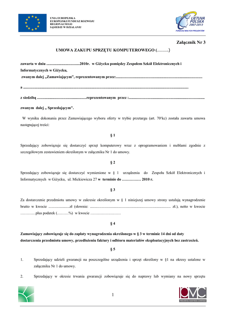 UNIA EUROPEJSKA EUROPEJSKI FUNDUSZ ROZWOJU REGIONALNEGO SĄSIEDZI W DZIAŁANIU Załącznik Nr 3 UMOWA ZAKUPU SPRZĘTU KOMPUTEROWEGO (……….) zawarta w dniu ...................................2010r. w Giżycku pomiędzy Zespołem Szkół Elektronicznych i Informatycznych w Giżycku, zwanym dalej „Zamawiającym”, reprezentowanym przez:........................................................................................... a .............................................................................................................................................................................. z siedzibą ....................................................reprezentowanym przez :................................................................................ zwanym dalej „ Sprzedającym". W wyniku dokonania przez Zamawiającego wyboru oferty w trybie przetargu (art. 70¹kc) została zawarta umowa następującej treści: §1 Sprzedający zobowiązuje się dostarczyć sprzęt komputerowy wraz z oprogramowaniem i meblami zgodnie z szczegółowym zestawieniem określonym w załączniku Nr 1 do umowy. §2 Sprzedający zobowiązuje się dostarczyć wymienione w § 1 urządzenia do Zespołu Szkół Elektronicznych i Informatycznych w Giżycku, ul. Mickiewicza 27 w terminie do …………… 2010 r. §3 Za dostarczenie przedmiotu umowy w zakresie określonym w § 1 niniejszej umowy strony ustalają wynagrodzenie brutto w kwocie ......................zł (słownie: ..................................................................................... zł.), netto w kwocie …………plus podatek (………%) w kwocie …………………… §4 Zamawiający zobowiązuje się do zapłaty wynagrodzenia określonego w § 3 w terminie 14 dni od daty dostarczenia przedmiotu umowy, przedłożeniu faktury i odbioru materiałów eksploatacyjnych bez zastrzeżeń. §5 1. Sprzedający udzieli gwarancji na poszczególne urządzenia i sprzęt określony w §1 na okresy ustalone w załączniku Nr 1 do umowy. 2. Sprzedający w okresie trwania gwarancji zobowiązuje się do naprawy lub wymiany na nowy sprzętu 1 UNIA EUROPEJSKA EUROPEJSKI FUNDUSZ ROZWOJU REGIONALNEGO SĄSIEDZI W DZIAŁANIU wymienionego w §1 w czasie nie przekraczającym 18 godzin od chwili powiadomienia o awarii. §6 1. Strony postanawiają, że wiążącą je formą odszkodowania będą kary umowne z zastrzeżeniem ust. 3 2. Ustala się kary umowne w następujących wypadkach i wysokościach: 1) Zamawiający jest zobowiązany do zapłaty Sprzedającemu kar umownych za odstąpienie od umowy z przyczyn, za które Sprzedający nie ponosi odpowiedzialności w wysokości 5 % wynagrodzenia określonego w § 3. 2) Sprzedający zobowiązany jest do zapłaty Zamawiającemu kar umownych: a) za zwłokę w wykonaniu przedmiotu zamówienia 1 % wynagrodzenia określonego w § 3 za każdy dzień zwłoki, licząc od umownego terminu dostarczenia. b) za zwłokę w usunięciu wad w wysokości 1 % wynagrodzenia dziennie za każdy dzień zwłoki licząc od ustalonego przez strony terminu na usunięcie wad . 3) Za odstąpienie od umowy Sprzedawcy albo Zamawiającego z przyczyn, za które ponosi odpowiedzialność Sprzedawca albo Zamawiający w wysokości 5 % wynagrodzenia umownego. 3. Strony zastrzegają sobie prawo dochodzenia odszkodowania uzupełniającego do wysokości rzeczywiście poniesionej szkody. §7 Integralną częścią składową umowy jest dokumentacja z postępowania o zamówieniu w trybie art. 70¹kc. §8 Zmiany niniejszej umowy wymagają dla swej ważności formy pisemnej w formie aneksu. §9 W sprawach nieuregulowanych niniejszą umową stosuje się przepisy kodeksu cywilnego. § 10 Ewentualne spory mogące wyniknąć z realizacji niniejszej umowy będą rozstrzygane przez sąd właściwy dla siedziby Zamawiającego. § 11 Umowę sporządzono w trzech jednobrzmiących egzemplarzach, jeden dla Sprzedającego, dwa dla Zamawiającego. SPRZEDAJĄCY ZAMAWIAJĄCY 2 UNIA EUROPEJSKA EUROPEJSKI FUNDUSZ ROZWOJU REGIONALNEGO SĄSIEDZI W DZIAŁANIU Załącznik nr 1 WYMAGANIA TECHNICZNE I STANDARDY JAKOŚCIOWE Jednostka centralna – sztuk 10, wymagania minimalne: Procesor: dwurdzeniowy, taktowanie min. 2.8 GHz, technologia 45nm, zużycie energii max. 65W, min. 2 MB cache L2, funkcje oszczędzania energii, ciche chłodzenie Płyta główna: 2 gniazda RAM, 2xPCI, 1x PCI-Ex1, PCI-Ex16, 1x ATA/133+4x Serial ATA II, 4x USB 2.0, zintegr. karta sieciowa, zintegr. karta muzyczna, złącza zewn: Audio, 4x USB, 2x PS/2, 1x RJ45, 1xCOM, 1x LPT (mogą być na dołączonej taśmie) Pamięć RAM: 2 x 2 GB 800 MHz lub szybsza Karta graficzna: PCI-Ex16, 256 MB RAM, wyjścia D-Sub i DVI, pasywne chłodzenie HDD: min. 250 GB SATA II, 7200 RPM, NCQ, cache 16 MB, cichy DVD: obsługa płyt dwuwarstwowych; obsługiwane formaty zapisu: DVD-RAM, DVD+/-R, DVD+/- RW, CD-R, CD-RW; dołączone oprogramowanie w wersji OEM Obudowa: Mini- lub Midi-ATX, wyprowadzone na przód złącza USB i audio – w górze obudowy; bez zbędnych wyświetlaczy i podświetleń; Zasilacz: ATX 2.0; min. 400 W; złącza SATA; wentylator 12 cm o regulowanej prędkości; komplet zabezpieczeń przeciw zwarciom, przepięciom i przeciążeniom; komplet certyfikatów FDD: standardowy 3,5” lub czytnik kart pamięci Klawiatura: PS/2, tradycyjny układ klawiszy (wolne miejsce nad klawiszami kursora); trwały nadruk na klawiszach; niskoprofilowa; port USB Mysz: PS/2, optyczna; scroll System operacyjny: OEM Windows XP Home PL SP3 lub Windows 7 Professional PL 32-bit Oprogramowanie: Microsoft Office 2007 SB PL OEM Szkoła na rzecz, której realizowane jest zamówienie prowadzi kształcenie w zawodach informatyczno- elektronicznych , które wymagają stosowania systemu Windows i pakietu Microsoft Office(jest to standard wyposażenia stanowiska szkolno-egzaminacyjnego), nie można zastąpić ich równoważnymi programami innych firm. Ponieważ głównymi użytkownikami Centrum Multimedialnego będą ucz