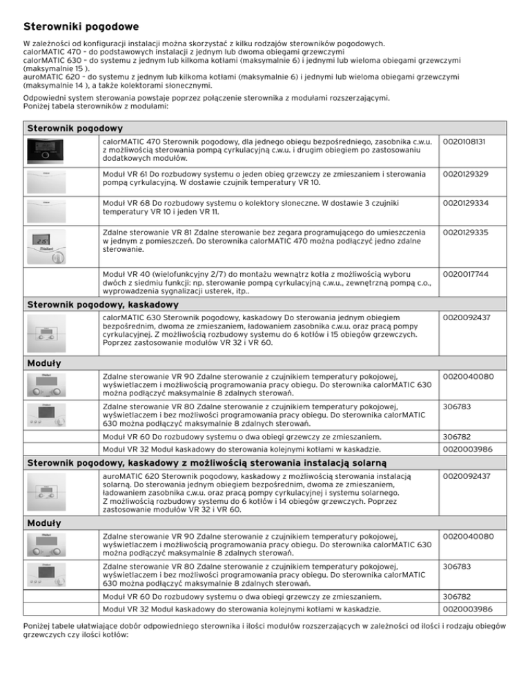 Sterowniki pogodowe W zależności od konfiguracji instalacji można skorzystać z kilku rodzajów sterowników pogodowych. calorMATIC 470 – do podstawowych instalacji z jednym lub dwoma obiegami grzewczymi calorMATIC 630 – do systemu z jednym lub kilkoma kotłami (maksymalnie 6) i jednymi lub wieloma obiegami grzewczymi (maksymalnie 15 ). auroMATIC 620 – do systemu z jednym lub kilkoma kotłami (maksymalnie 6) i jednymi lub wieloma obiegami grzewczymi (maksymalnie 14 ), a także kolektorami słonecznymi. Odpowiedni system sterowania powstaje poprzez połączenie sterownika z modułami rozszerzającymi. Poniżej tabela sterowników z modułami: Sterownik pogodowy calorMATIC 470 Sterownik pogodowy, dla jednego obiegu bezpośredniego, zasobnika c.w.u. z możliwością sterowania pompą cyrkulacyjną c.w.u. i drugim obiegiem po zastosowaniu dodatkowych modułów. 0020108131 Moduł VR 61 Do rozbudowy systemu o jeden obieg grzewczy ze zmieszaniem i sterowania pompą cyrkulacyjną. W dostawie czujnik temperatury VR 10. 0020129329 Moduł VR 68 Do rozbudowy systemu o kolektory słoneczne. W dostawie 3 czujniki temperatury VR 10 i jeden VR 11. 0020129334 Zdalne sterowanie VR 81 Zdalne sterowanie bez zegara programującego do umieszczenia w jednym z pomieszczeń. Do sterownika calorMATIC 470 można podłączyć jedno zdalne sterowanie. 0020129335 Moduł VR 40 (wielofunkcyjny 2/7) do montażu wewnątrz kotła z możliwością wyboru dwóch z siedmiu funkcji: np. sterowanie pompą cyrkulacyjną c.w.u., zewnętrzną pompą c.o., wyprowadzenia sygnalizacji usterek, itp.. 0020017744 Sterownik pogodowy, kaskadowy calorMATIC 630 Sterownik pogodowy, kaskadowy Do sterowania jednym obiegiem bezpośrednim, dwoma ze zmieszaniem, ładowaniem zasobnika c.w.u. oraz pracą pompy cyrkulacyjnej. Z możliwością rozbudowy systemu do 6 kotłów i 15 obiegów grzewczych. Poprzez zastosowanie modułów VR 32 i VR 60. 0020092437 Zdalne sterowanie VR 90 Zdalne sterowanie z czujnikiem temperatury pokojowej, wyświetlaczem i możliwością programowania pracy obiegu. Do sterownika calorMATIC 630 można podłączyć maksymalnie 8 zdalnych sterowań. 0020040080 Zdalne sterowanie VR 80 Zdalne sterowanie z czujnikiem temperatury pokojowej, wyświetlaczem i bez możliwości programowania pracy obiegu. Do sterownika calorMATIC 630 można podłączyć maksymalnie 8 zdalnych sterowań. 306783 Moduł VR 60 Do rozbudowy systemu o dwa obiegi grzewczy ze zmieszaniem. 306782 Moduł VR 32 Moduł kaskadowy do sterowania kolejnymi kotłami w kaskadzie. 0020003986 Moduły Sterownik pogodowy, kaskadowy z możliwością sterowania instalacją solarną auroMATIC 620 Sterownik pogodowy, kaskadowy z możliwością sterowania instalacją solarną. Do sterowania jednym obiegiem bezpośrednim, dwoma ze zmieszaniem, ładowaniem zasobnika c.w.u. oraz pracą pompy cyrkulacyjnej i systemu solarnego. Z możliwością rozbudowy systemu do 6 kotłów i 14 obiegów grzewczych. Poprzez zastosowanie modułów VR 32 i VR 60. 0020092437 Zdalne sterowanie VR 90 Zdalne sterowanie z czujnikiem temperatury pokojowej, wyświetlaczem i możliwością programowania pracy obiegu. Do sterownika calorMATIC 630 można podłączyć maksymalnie 8 zdalnych sterowań. 0020040080 Zdalne sterowanie VR 80 Zdalne sterowanie z czujnikiem temperatury pokojowej, wyświetlaczem i bez możliwości programowania pracy obiegu. Do sterownika calorMATIC 630 można podłączyć maksymalnie 8 zdalnych sterowań. 306783 Moduł VR 60 Do rozbudowy systemu o dwa obiegi grzewczy ze zmieszaniem. 306782 Moduł VR 32 Moduł kaskadowy do sterowania kolejnymi kotłami w kaskadzie. 0020003986 Moduły Poniżej tabele ułatwiające dobór odpowiedniego sterownika i ilości modułów rozszerzających w zależności od ilości i rodzaju obiegów grzewczych czy ilości kotłów: