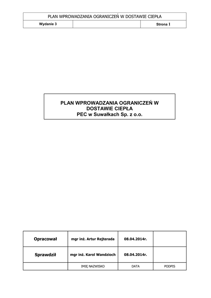 PLAN WPROWADZANIA OGRANICZEŃ W DOSTAWIE CIEPŁA Strona 1 Wydanie 3 PLAN WPROWADZANIA OGRANICZEŃ W DOSTAWIE CIEPŁA PEC w Suwałkach Sp. z o.o. Sezon 2007/2008 Opracował mgr inż. Artur Rejterada 08.04.2014r. Sprawdził mgr inż. Karol Wandzioch 08.04.2014r. IMIĘ NAZWISKO DATA PODPIS PLAN WPROWADZANIA OGRANICZEŃ W DOSTAWIE CIEPŁA Strona 2 Wydanie 3 1. PODSTAWA OPRACOWANIA Plan wprowadzania ograniczeń w dostarczaniu ciepła w Przedsiębiorstwie Energetyki Cieplnej w Suwałkach Sp. z o.o. został sporządzony na podstawie §8 ust. 1 rozporządzenia Rady Ministrów z dnia 23 lipca 2007 r. w sprawie szczegółowych zasad i trybu wprowadzania ograniczeń w sprzedaży paliw stałych oraz w dostarczaniu i poborze energii elektrycznej lub ciepła / Dz.U.07.133.924/. 2. CHARAKTERYSTYKA TECHNICZNA ŹRÓDEŁ CIEPŁA Przedsiębiorstwo Energetyki Cieplnej w Suwałkach Sp. z o.o. dostarcza do odbiorców energię cieplną z własnego źródła tj. Ciepłowni Głównej o mocy nominalnej 109,21 MW wyposażonej jest w trzy kotły wodne WR 25 i kocioł parowy OR 35N firmy RAFAKO. Kotły wodne WR 25-014S wykonane w technologii ścian membranowych z zabudowanym dodatkowym podgrzewaczem wody w poziomym kanale spalin za kotłem. Kotły WR 25-014S - K2, K3 i K4 - o mocy nominalnej 29,07 [MW] i przepływie nominalnym 341 Mg/h każdy. Kocioł parowy OR-35N o nominalnej wydajności pary 35 Mg/h , ciśnieniu pary 4,0 MPa i temperaturze pary 450 0C wykonany jest w technologii ścian szczelnych. Para wytworzona w kotle parowym służy do napędu turbozespołu, który wytwarza energię elektryczną z generatora o mocy nominalnej 7,2 MW e i energię cieplną z wymiennika ciepłowniczego o mocy nominalnej 22,0 MWt. Dzięki zastosowaniu stacji redukcyjno-zrzutowej możliwa jest również produkcja energii cieplnej z wymiennika ciepłowniczego bez produkcji energii elektrycznej. Obieg wody w układzie technologicznym Ciepłowni Głównej zapewniają pompy: Nr pompy PO3 PO4 PO5 PO6 PO7 PP8 PP9 Typ, wydajność, wysokość podnoszenia pompy Moc silnika 20W39x2 G-400 [m3/h] H-100 [m sł.H2O] Ns-160 [kW] 20W39x2 G-400m3/h H-100 [m sł.H2O] Ns-160 [kW] 20W39x2 G-400m3/h H-100 [m sł.H2O] Ns-160 [kW] 20W39x2 G-400m3/h H-100 [m sł.H2O] Ns-160 [kW] W16Px3 G-200 [m3/h] H-96 [m sł.H2O] Ns-90 [kW] 3 125PJM250 G-250 [m /h] H-65 [m sł.H2O] Ns-55 [kW] 125PJM250 G-250 [m3/h] H-65 [m sł.H2O] Ns-55 [kW] Przetwornice częstotliwości VLT 6225160kW VLT 6225160kW VLT 3575-55kW VLT 3575-55kW PLAN WPROWADZANIA OGRANICZEŃ W DOSTAWIE CIEPŁA Strona 3 Wydanie 3 PP10 PM1 PM2 PM3 PS1 PS2 PU1 PU2 125PJM250 G-250 [m3/h] H-65 [m sł.H2O] Ns-55 [kW] VLT 6072-55kW 8C21 G-105 [m3/h] H-52 [m sł.H2O] Ns-22 [kW] VLT 3532-22kW 3 12C40 G-160 [m /h] H-50 [m sł.H2O] Ns-37 [kW] VLT 3552-37kW 3 12C40 G-160 [m /h] H-50 [m sł.H2O] Ns-37 [kW] VLT 3552-37kW 3 32YSm-4 G-8,5 [m /h] H-88 [m sł.H2O] Ns-7,5 [kW] 3 40YSm-4 G-15 [m /h] H-108 [m sł.H2O] Ns-15 [kW] 65PJM200 G-24 [m3/h] H-52 [m sł.H2O] Ns-7,5 [kW] VLT 3511-7,5kW 65PJM200 G-24 [m3/h] H-52 [m sł.H2O] Ns-7,5 [kW] VLT 6011-7,5kW Odżużlanie następuje za pomocą urządzeń: - ośmiu odżużlaczy zgrzebłowych, w których za pomocą taśm zgrzebłowych żużel transportowany jest na taśmę przenośnika, pracujących na potrzeby wszystkich kotłów; - przenośnika taśmowego typu Bt 650 transportującego żużel na plac odpadów paleniskowych; Urządzenia odpylania zainstalowane przy kotłach nr 2,3 i 4: - dwustopniowy układ odpylaczy cyklonowych spalin: I stopień – 2 multicyklony przelotowe typ MP-24, zawierające po 24 cyklony każdy, II stopień – 2 baterie cyklonów typ C12x710 zawierające po 12 cyklonów o średnicy 0,71 [m] każdy; - elektromagnetyczny obijak pyłu typ OP-1; - przenośnik spiralny „Spirotex” typ PSD5. Przy kotle nr 1 OR-35N instalację odpylania spalin stanowi elektrofiltr produkcji ELWO S.A. typu HKE 11-250/2x4,0x6,6/400. W celu odprowadzenia pyłów z elektrofiltru zastosowane są: - elektromagnetyczny obijak pyłu typ OP-1; - przenośnik spiralny „Spirotex” typ PSD5. Nawęglanie przykotłowych zasobników węgla o pojemności 135 [m3] każdy następuje przy pomocy estakady nawęglania składającej się z dwóch niezależnych poziomo-skośnych przenośników taśmowych i jednego poziomego przenośnika taśmowego, na którym zamontowane są 2 wózki zsypowe. Dostawy paliwa odbywają się wagonami lub samochodami samowyładowczymi. Magazynowanie paliwa stałego odbywa się na placu o wymiarach rzeczywistych 90 [m] x 300 [m] tj. 27000 [m2] ogrodzonym murem PLAN WPROWADZANIA OGRANICZEŃ W DOSTAWIE CIEPŁA Strona 4 Wydanie 3 oporowym z płyt L-ek o wysokości 3,5 [m]. Wymiary użyteczne placu wynoszą 64 [m] x 290 [m] tj. 18560 [m2]. Rozładunek wagonów, bocznicy kolejowej przez lokomotywę spalinową, podstawionych z zakładowej jest realizowany przy pomocy specjalistycznego sprzętu. Hałdowanie odbywa się ładowarkami i spycharką gąsienicową. Składowanie odpadów paleniskowych odbywa się na wydzielonym, ogrodzonym murem oporowym, utwardzonym placu. Jest to składowanie okresowe – do czasu odbioru odpadu przez inne jednostki gospodarcze lub do czasu wywozu na składowisko. 3. RODZAJE I PARAMETRY TECHNOLOGICZNEGO NOŚNIKA CIEPŁA ORAZ SPOSOBY JEGO REGULACJI Nośnikiem ciepła jest woda gorąca o parametrach Tmax = 1250C i Pmax = 16 bar. Praca ciepłowni realizowana jest według tabeli temperatur jakościowo-ilościowej sporządzonej na obliczeniowych podstawie 140/70oC tabeli regulacji skorygowaną ze jakościowej względu na dla parametrów występowanie rur preizolowanych do Tmax=125oC, powyżej której stosuje się regulację ilościową. Nastawy automatyki w węzłach cieplnych realizowane są zgodnie z „Regulaminem świadczenia usług przez Przedsiębiorstwo Energetyki Cieplnej w Suwałkach Spółka z o.o.” oraz „Umową sprzedaży energii cieplnej”. Ruch sieci ciepłowniczej prowadzony jest na podstawie „Programu pracy sieci ciepłownic