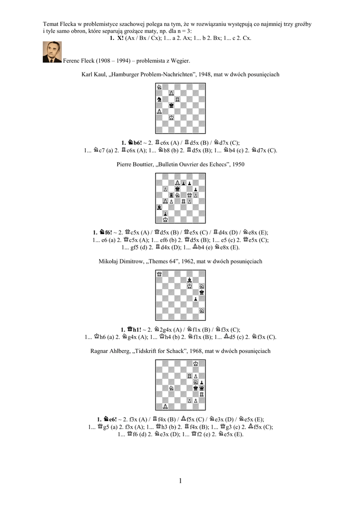 Temat Flecka w problemistyce szachowej polega na tym, że w rozwiązaniu występują co najmniej trzy groźby i tyle samo obron, które separują grożące maty, np. dla n = 3: 1. X! (Ax / Bx / Cx); 1... a 2. Ax; 1... b 2. Bx; 1... c 2. Cx. Ferenc Fleck (1908 – 1994) – problemista z Węgier. Karl Kaul, „Hamburger Problem-Nachrichten”, 1948, mat w dwóch posunięciach )........*! 0i,|,|,|,]! 0,|C|,|,|]! 0k,|S|,|,]! 0,|M|,|,|]! 0c,|,|,|,]! 0,|L|,|,|]! 0|,|,|,|,]! 0,|,|,|,|]! \````````^! 1. ib6! ~ 2. sc6x (A) / sd5x (B) / id7x (C); 1... ic7 (a) 2. sc6x (A); 1... ib8 (b) 2. sd5x (B); 1... ib4 (c) 2. id7x (C). Pierre Bouttier, „Bulletin Ouvrier des Echecs”, 1950 )........*! 0|,|,|,|,]! 0,|,cPp,|]! 0|Q|M|,p,]! 0,|Ui,rQ|]! 0|Cq,sQ|,]! 0O|,|,|,|]! 0|P|,|,|,]! 0,l,|,|,|]! \````````^! 1. if6! ~ 2. rc5x (A) / rd5x (B) / re5x (C) / sd4x (D) / ie8x (E); 1... e6 (a) 2. rc5x (A); 1... ef6 (b) 2. rd5x (B); 1... e5 (c) 2. re5x (C); 1... gf5 (d) 2. sd4x (D); 1... cb4 (e) ie8x (E). Mikołaj Dimitrow, „Themes 64”, 1962, mat w dwóch posunięciach )........*! 0r,|,|,|,]! 0,|,|,o,|]! 0|,|,|L|I]! 0,|,|,|,m]! 0|,|,|,p,]! 0,|,|,|,|]! 0|,|,|,|I]! 0,|,|,|,|]! \````````^! 1. rh1! ~ 2. i2g4x (A) / if1x (B) / if3x (C); 1... lh6 (a) 2. ig4x (A); 1... lh4 (b) 2. if1x (B); 1... cd5 (c) 2. if3x (C). Ragnar Ahlberg, „Tidskrift for Schack”, 1968, mat w dwóch posunięciach )........*! 0|,|,|,l,]! 0,|,|,|,|]! 0|,|,|Sq,]! 0,|,|,|Ip]! 0|,i,|,mX]! 0,|,|,|,s]! 0|,|,|Qq,]! 0,c,|,|,|]! \````````^! 1. ie6! ~ 2. f3x (A) / sf4x (B) / cf5x (C) / ie3x (D) / ie5x (E); 1... rg5 (a) 2. f3x (A); 1... rh3 (b) 2. sf4x (B); 1... rg3 (c) 2. cf5x (C); 1... rf6 (d) 2. ie3x (D); 1... rf2 (e) 2. ie5x (E). 1 David Brown, „The Problemist”, 1977, mat w dwóch posunięciach )........*! 0|,|,|,|,]! 0,|,|,|,|]! 0p,|,c,|,]! 0Up,|I|Sl]! 0p,|,m,|,]! 0Qi,pPpQ|]! 0|,|,|,|,]! 0,|,|,|,|]! \````````^! 1. id7! ~ 2. se5x (A) / sg4x (B) / cd5x (C) / idc5x (D) / if6x (E); 1... e2 (a) 2. se5x (A); 1... ab3 (b) 2. sg4x (B); 1... f2 (c) 2. cd5x (C); 1... d2 (d) 2. idc5x (D); 1... b4 (e) 2. if6x (E); Stefan Dittrich, „Mat”, 1979, mat w dwóch posunięciach )........*! 0|,|,|,|,]! 0,|,|,|,|]! 0|,|,|S|,]! 0M|,|I|,o]! 0q,|,s,|,]! 0,|,|P|,|]! 0|,|,q,r,]! 0,|,|,|,l]! \````````^! 1. rg5! ~ 2. id3x (A) / id7x (B) / if3x (C) / if7x (D) / ig4x (E) / ig6x (F); 1... ce2 (a) 2. id3x (A); 1... ce8 (b) 2. id7x (B); 1... cf3+ (c) 2. if3x (C); 1... cf7 (d) 2. if7x (D); 1... cg4 (e) 2. ig4x (E); 1... cg6 (f) 2. ig6x (F). Zvonimir Hernitz, „Die Schwalbe”, 1975, mat w dwóch posunięciach )........*! 0k,|,|,|,]! 0,|,|,|,|]! 0|P|,|,|,]! 0M|,|,|,|]! 0|,|,|,|,]! 0Il,|R|,|]! 0|,|,|,|,]! 0,|,|,|,|]! \````````^! 1. re8! ~ 2. ra4x (A) / ra8x (B) / rb5x (C); 1... ic7 (a) 2. ra4x (A); 1... la6 (b) 2. ra8x (B); 1... b5 (c) 2. rb5x (C). Henryk Kruk, „The Problemist Supplement”, 1997, mat w dwóch posunięciach )........*! 0|,|,|,|,]! 0,|,|,|,|]! 0|,|,|,|,]! 0,|,|,|,|]! 0|,|,|,|,]! 0,l,iP|,|]! 0|,|,|,|,]! 0,|Cm,|Is]! \````````^! 1. if4! ~ 2. if3x (A) / ige2x (B) / igh3x (C); 1... lc1 (a) 2. if3x (A); 1... e2 (b) 2. ige2x (B); 1... le1 (c) 2. igh3x (C). 2