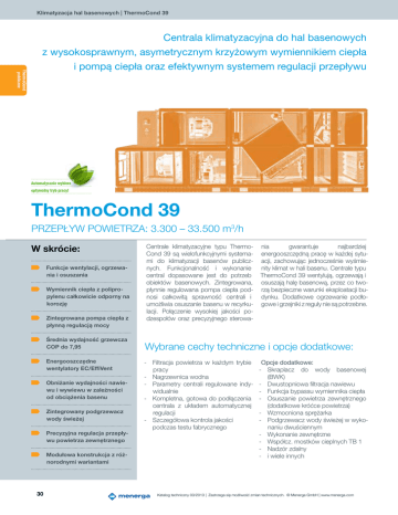 Klimatyzacja hal basenowych | ThermoCond 39 ThermoCond publiczne Centrala klimatyzacyjna do hal basenowych z wysokosprawnym, asymetrycznym krzyżowym wymiennikiem ciepła i pompą ciepła oraz efektywnym systemem regulacji przepływu Automatycznie wybiera optymalny tryb pracy! ThermoCond 39 Przepływ powietrza: 3.300 – 33.500 m3/h W skrócie: Funkcje wentylacji, ogrzewania i osuszania Wymiennik ciepła z polipropylenu całkowicie odporny na korozję Zintegrowana pompa ciepła z płynną regulacją mocy Średnia wydajność grzewcza COP do 7,95 Energooszczędne wentylatory EC/EffiVent Obniżanie wydajności nawiewu i wywiewu w zależności od obciążenia basenu Zintegrowany podgrzewacz wody świeżej Precyzyjna regulacja przepływu powietrza zewnętrznego Modułowa konstrukcja z różnorodnymi wariantami 30 Centrale klimatyzacyjne typu ThermoCond 39 są wielofunkcyjnymi systemami do klimatyzacji basenów publicznych. Funkcjonalność i wykonanie central dopasowane jest do potrzeb obiektów basenowych. Zintegrowana, płynnie regulowana pompa ciepła podnosi całkowitą sprawność centrali i umożliwia osuszanie basenu w recyrkulacji. Połączenie wysokiej jakości podzespołów oraz precyzyjnego sterowa- nia gwarantuje najbardziej energooszczędną pracę w każdej sytuacji, zachowując jednocześnie wyśmienity klimat w hali basenu. Centrale typu ThermoCond 39 wentylują, ogrzewają i osuszają halę basenową, przez co tworzą bezpieczne warunki eksploatacji budynku. Dodatkowe ogrzewanie podłogowe i grzejniki z reguły nie są potrzebne. Wybrane cechy techniczne i opcje dodatkowe: - Filtracja powietrza w każdym trybie pracy - Nagrzewnica wodna - Parametry centrali regulowane indywidualnie - Kompletna, gotowa do podłączenia centrala z układem automatycznej regulacji - Szczegółowa kontrola jakości podczas testu fabrycznego Opcje dodatkowe: -Skraplacz do wody basenowej (BWK) - Dwustopniowa filtracja nawiewu - Funkcja bypassu wymiennika ciepła -Osuszanie powietrza zewnętrznego (dodatkowe króćce powietrza) -Wzmocniona sprężarka - Podgrzewacz wody świeżej w wykonaniu dwuściennym -Wykonanie zewnętrzne -Współcz. mostków cieplnych TB 1 - Nadzór zdalny - i wiele innych Katalog techniczny 03/2013 | Zastrzega się możliwość zmian technicznych. © Menerga GmbH | www.menerga.com Klimatyzacja hal basenowych | ThermoCond 39 Tryb spoczynkowy Jeśli w trybie spoczynkowym temperatura i wilgotność na hali basenowej są utrzymane, centrala przechodzi w tryb pełnej recyrkulacji. Dzięki temu zachowany jest niezbędny obieg powietrza w hali basenowej. W miarę możliwości wentylatory pracują na obniżonej wydajności powietrza. Ogrzewanie w recyrkulacji Jeśli hala basenowa wymaga dogrzewania, ciepło jest dostarczane za pośrednictwem nagrzewnicy wodnej. Przepustnica bypass wymiennika ciepła otwiera się, dzięki czemu maleją wewnętrzne opory przepływu. Przepustnice powietrza zewnętrznego i usuwanego są zamknięte. Osuszanie w trybie basenowym i spoczynkowym Powietrze recyrkulacyjne osuszane jest za pośrednictwem parownika pompy ciepła. Proces osuszania jest wzmocniony dzięki współdziałaniu pompy ciepła z asymetrycznym krzyżowym wymiennikiem ciepła. Powietrze osuszone w parowniku przepływa przez wymiennik ciepła, gdzie ogrzewa się ciepłem odzyskanym od powietrza wywiewanego. Proces ten pozwala z kolei na lepsze osuszenie powietrza wywiewanego. Wstępnie podgrzane powietrze jest mieszane z powietrzem recyrkulowanym, podgrzewane na skra- placzu i nagrzewnicy wodnej, a następnie nawiewane do hali basenowej. Zastosowanie płynnie regulowanych sprężarek umożliwia równoczesne płynne regulowanie przepływu powietrza. Dzięki temu stały poziom wilgotności w hali basenowej utrzymywany jest przy minimalnylnym zużyciu energii elektrycznej i ciepła. W trybie basenowym dodawana jest niezbędna ze względów higienicznych ilość powietrza zewnętrznego. Udział powietrza zewnętrznego jest ciągle dopasowywany do aktualnych potrzeb. Praca z 100% udziałem powietrza zewnętrznego Wraz ze wzrostem zawartości wilgoci w powietrzu zewnętrznym, przepustnica recyrkulacji jest coraz bardziej przymykana. W warunkach wilgotnego lata centrala pracuje ze 100-pro- centowym udziałem powietrza zewnętrznego. Dzięki dopasowywaniu strumienia przepływu powietrza w zależności od aktualnych potrzeb koszty eksploatacji są zredukowane do minimum. Opcje dodatkowe W niektórych wypadkach osiągnięcie parametrów powietrza w hali basenowej zgodnie z VDI 2089 może wymagać zastosowania dodatkowego systemu przepustnic powietrza. Powietrze zewnętrzne jest pobierane przez dodatkowy króciec powietrza. Część powietrza zewnętrznego jest schładzana na wymienniku ciepła, a następnie osu- szana na parowniku pompy ciepła. Tak schłodzone i osuszone powietrze przepływa przez wymiennik ciepła, jest mieszane z pozostałą częścią powietrza zewnętrznego i wprowadzane do hali basenowej. Jeśli hala basenowa nie wymaga dogrzewania, ciepło zostanie oddane do powietrza usuwanego. POW. ZEWN. WYWIEW POW. USUW. NAWIEW K V * POW. ZEWN. WYWIEW POW. USUW. NAWIEW K V * POW. ZEWN. WYWIEW POW. USUW. NAWIEW K V * POW. ZEWN. WYWIEW POW. USUW. NAWIEW K V * POW. ZEWN. WYWIEW POW. USUW. NAWIEW K V POW. USUW. * POW. ZEWN. POW. ZEWN. WYWIEW POW. USUW. NAWIEW K V * * skraplacz BWK: tylko przy centralach typu 39 xx 11 Katalog techniczny 03/2013 | Zastrzega się możliwość zmian technicznych. © Menerga GmbH | www.menerga.com 31 ThermoCond publiczne Opis funkcji