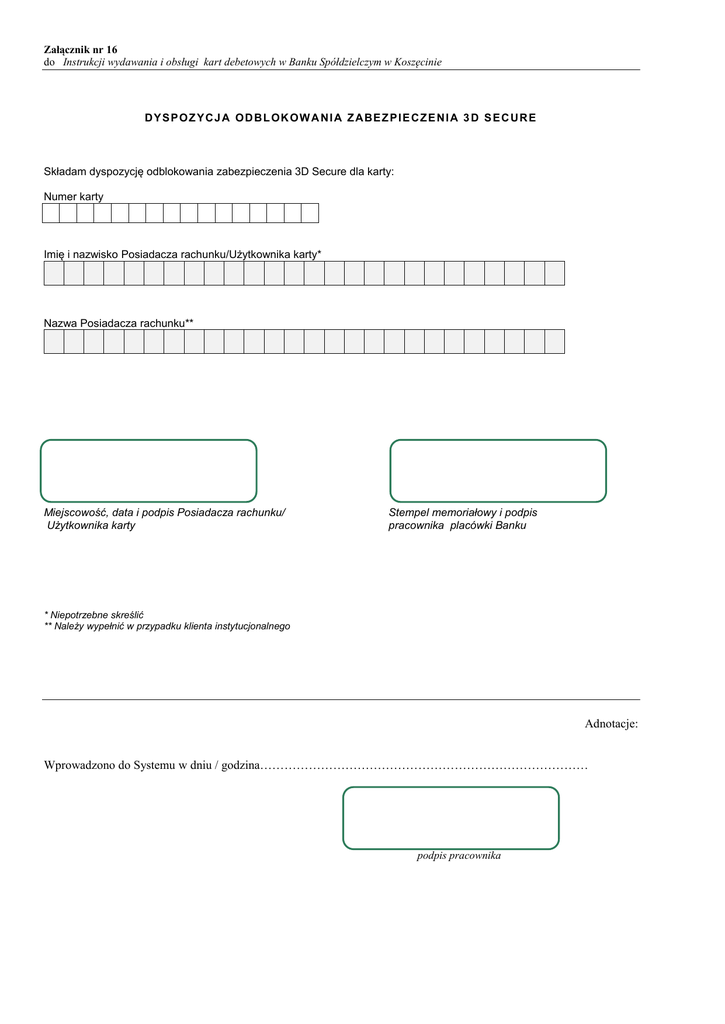 Załącznik nr 16 do Instrukcji wydawania i obsługi kart debetowych w Banku Spółdzielczym w Koszęcinie DYSPOZYCJA ODBLOKOWANIA ZABEZPIECZENIA 3 D SECURE Składam dyspozycję odblokowania zabezpieczenia 3D Secure dla karty: Numer karty Imię i nazwisko Posiadacza rachunku/Użytkownika karty* Nazwa Posiadacza rachunku** Miejscowość, data i podpis Posiadacza rachunku/ Użytkownika karty Stempel memoriałowy i podpis pracownika placówki Banku * Niepotrzebne skreślić ** Należy wypełnić w przypadku klienta instytucjonalnego Adnotacje: Wprowadzono do Systemu w dniu / godzina……………………………………………………………………… podpis pracownika