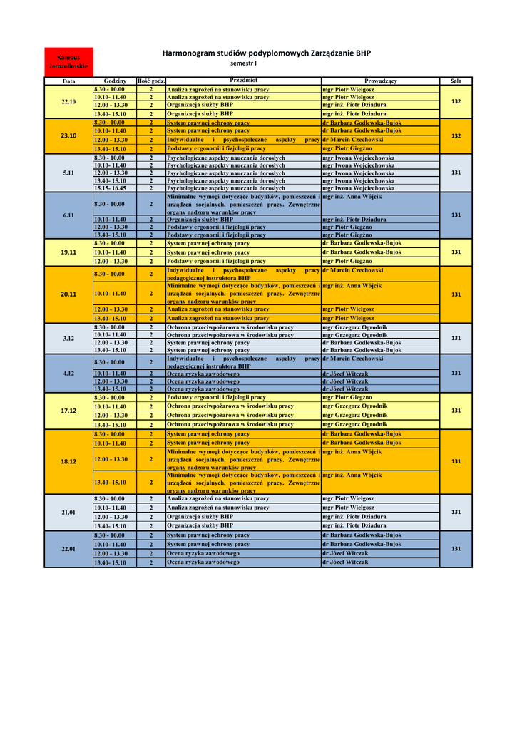 Harmonogram studiów podyplomowych Zarządzanie BHP Kampus Jerozolimskie Data 22.10 23.10 5.11 6.11 19.11 20.11 3.12 4.12 17.12 18.12 21.01 22.01 semestr I Godziny 8.30 - 10.00 10.10- 11.40 12.00 - 13.30 13.40- 15.10 8.30 - 10.00 10.10- 11.40 12.00 - 13.30 13.40- 15.10 8.30 - 10.00 10.10- 11.40 12.00 - 13.30 13.40- 15.10 15.15- 16.45 Przedmiot Ilość godz. 2 Analiza zagrożeń na stanowisku pracy 2 Analiza zagrożeń na stanowisku pracy Organizacja służby BHP 2 Organizacja służby BHP 2 2 System prawnej ochrony pracy System prawnej ochrony pracy 2 Indywidualne i psychospołeczne 2 pedagogicznej instruktora BHPpracy Podstawy ergonomii i fizjologii 2 2 2 2 2 2 8.30 - 10.00 2 10.10- 11.40 12.00 - 13.30 13.40- 15.10 8.30 - 10.00 10.10- 11.40 12.00 - 13.30 2 2 2 2 2 2 8.30 - 10.00 2 10.10- 11.40 2 12.00 - 13.30 13.40- 15.10 8.30 - 10.00 10.10- 11.40 12.00 - 13.30 13.40- 15.10 2 2 2 2 2 2 8.30 - 10.00 2 10.10- 11.40 12.00 - 13.30 13.40- 15.10 8.30 - 10.00 10.10- 11.40 12.00 - 13.30 13.40- 15.10 8.30 - 10.00 10.10- 11.40 2 2 2 2 2 2 2 2 2 12.00 - 13.30 2 13.40- 15.10 2 8.30 - 10.00 10.10- 11.40 12.00 - 13.30 13.40- 15.10 8.30 - 10.00 10.10- 11.40 12.00 - 13.30 13.40- 15.10 2 2 2 2 2 2 2 2 aspekty Prowadzący mgr Piotr Wielgosz mgr Piotr Wielgosz mgr inż. Piotr Dziadura mgr inż. Piotr Dziadura dr Barbara Godlewska-Bujok dr Barbara Godlewska-Bujok pracy dr Marcin Czechowski mgr Piotr Giegżno Psychologiczne aspekty nauczania dorosłych Psychologiczne aspekty nauczania dorosłych Psychologiczne aspekty nauczania dorosłych Psychologiczne aspekty nauczania dorosłych Psychologiczne aspekty nauczania dorosłych Minimalne wymogi dotyczące budynków, pomieszczeń i urządzeń socjalnych, pomieszczeń pracy. Zewnętrzne organy nadzoru warunków pracy Organizacja służby BHP Podstawy ergonomii i fizjologii pracy Podstawy ergonomii i fizjologii pracy System prawnej ochrony pracy System prawnej ochrony pracy Podstawy ergonomii i fizjologii pracy mgr Iwona Wojciechowska mgr Iwona Wojciechowska mgr Iwona Wojciechowska mgr Iwona Wojciechowska mgr Iwona Wojciechowska mgr inż. Anna Wójcik Indywidualne i psychospołeczne aspekty pracy pedagogicznej instruktora BHP Minimalne wymogi dotyczące budynków, pomieszczeń i urządzeń socjalnych, pomieszczeń pracy. Zewnętrzne organy nadzoru warunków pracy Analiza zagrożeń na stanowisku pracy Analiza zagrożeń na stanowisku pracy dr Marcin Czechowski Ochrona przeciwpożarowa w środowisku pracy Ochrona przeciwpożarowa w środowisku pracy System prawnej ochrony pracy System prawnej ochrony pracy Indywidualne i psychospołeczne aspekty pedagogicznej instruktora BHP Ocena ryzyka zawodowego Ocena ryzyka zawodowego Ocena ryzyka zawodowego Podstawy ergonomii i fizjologii pracy Ochrona przeciwpożarowa w środowisku pracy Ochrona przeciwpożarowa w środowisku pracy Ochrona przeciwpożarowa w środowisku pracy mgr inż. Piotr Dziadura mgr Piotr Giegżno mgr Piotr Giegżno dr Barbara Godlewska-Bujok dr Barbara Godlewska-Bujok mgr Piotr Giegżno Sala 132 132 131 131 131 mgr inż. Anna Wójcik 131 mgr Piotr Wielgosz mgr Piotr Wielgosz mgr Grzegorz Ogrodnik mgr Grzegorz Ogrodnik dr Barbara Godlewska-Bujok dr Barbara Godlewska-Bujok pracy dr Marcin Czechowski dr Józef Witczak dr Józef Witczak dr Józef Witczak mgr Piotr Giegżno mgr Grzegorz Ogrodnik mgr Grzegorz Ogrodnik mgr Grzegorz Ogrodnik 131 131 131 System prawnej ochrony pracy System prawnej ochrony pracy Minimalne wymogi dotyczące budynków, pomieszczeń i urządzeń socjalnych, pomieszczeń pracy. Zewnętrzne organy nadzoru warunków pracy Minimalne wymogi dotyczące budynków, pomieszczeń i urządzeń socjalnych, pomieszczeń pracy. Zewnętrzne organy nadzoru warunków pracy Analiza zagrożeń na stanowisku pracy Analiza zagrożeń na stanowisku pracy Organizacja służby BHP Organizacja służby BHP dr Barbara Godlewska-Bujok dr Barbara Godlewska-Bujok mgr inż. Anna Wójcik mgr Piotr Wielgosz mgr Piotr Wielgosz mgr inż. Piotr Dziadura mgr inż. Piotr Dziadura 131 System prawnej ochrony pracy System prawnej ochrony pracy Ocena ryzyka zawodowego Ocena ryzyka zawodowego dr Barbara Godlewska-Bujok dr Barbara Godlewska-Bujok dr Józef Witczak dr Józef Witczak 131 131 mgr inż. Anna Wójcik