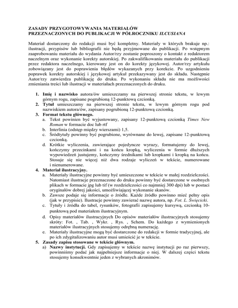 ZASADY PRZYGOTOWYWANIA MATERIAŁÓW PRZEZNACZONYCH DO PUBLIKACJI W PÓŁROCZNIKU ILCUSIANA Materiał dostarczony do redakcji musi być kompletny. Materiały w których brakuje np.: ilustracji, przypisów lub bibliografii nie będą przyjmowane do publikacji. Po wstępnym zaaprobowaniu materiału do wydania Autor/rzy zostanie poproszony o kontakt z redaktorem naczelnym oraz wykonanie korekty autorskiej. Po zakwalifikowaniu materiału do publikacji przez redaktora naczelnego, kierowany jest on do korekty językowej. Autor/rzy artykułu zobowiązany jest do poprawienia błędów wykazanych przy korekcie. Po uzgodnieniu poprawek korekty autorskiej i językowej artykuł przekazywany jest do składu. Następnie Autor/rzy zatwierdza publikację do druku. Po wykonaniu składu nie ma możliwości zmieniania treści lub ilustracji w materiałach przeznaczonych do druku. 1. Imię i nazwisko autora/ów umieszczamy na pierwszej stronie tekstu, w lewym górnym rogu, zapisane pogrubioną 12-punktową czcionką. 2. Tytuł umieszczamy na pierwszej stronie tekstu, w lewym górnym rogu pod nazwiskiem autora/ów, zapisany pogrubioną 12-punktową czcionką. 3. Format tekstu głównego. a. Tekst powinien być wyjustowany, zapisany 12-punktową czcionką Times New Roman w formacie doc lub rtf b. Interlinia (odstęp między wierszami) 1,5. c. Śródtytuły powinny być pogrubione, wyrównane do lewej, zapisane 12-punktową czcionką. d. Krótkie wyliczenia, zawierające pojedyncze wyrazy, formatujemy do lewej, kończymy przecinkami i na końcu kropką, wyliczenia w formie dłuższych wypowiedzeń justujemy, kończymy średnikami lub kropkami i kropką na końcu. Stosuje się nie więcej niż dwa rodzaje wyliczeń w tekście, numerowane i nienumerowane. 4. Materiał ilustracyjny. a. Materiały ilustracyjne powinny być umieszczone w tekście w małej rozdzielczości. Natomiast ilustracje przeznaczone do druku powinny być dostarczone w osobnych plikach w formacie jpg lub tif (w rozdzielczości co najmniej 300 dpi) lub w postaci oryginałów dobrej jakości, umożliwiającej wykonanie skanów. b. Zawsze podaje się informacje o źródle. Każde źródło powinno mieć pełny opis (jak w przypisie). Ilustracje powinny zawierać nazwę autora, np. Fot. L. Święcicki. c. Tytuły i źródła do tabel, rysunków, fotografii zapisujemy kursywą, czcionką 10punktową pod materiałem ilustracyjnym. d. Opisy materiałów ilustracyjnych Do opisów materiałów ilustracyjnych stosujemy skróty: Fot. , Tab. , Wykr. , Rys. , Schem. Do każdego z wymienionych materiałów ilustracyjnych stosujemy odrębną numerację. e. Materiały ilustracyjne mogą być dostarczone do redakcji w formie tradycyjnej, ale po ich zdygitalizowaniu autor musi umieścić je w tekście. 5. Zasady zapisu stosowane w tekście głównym. a) Nazwy instytucji. Gdy zapisujemy w tekście nazwę instytucji po raz pierwszy, powinniśmy podać jak najpełniejsze informacje o niej. W dalszej części tekstu stosujemy konsekwentnie jeden z wybranych akronimów. Przykład: W zeszłym tygodniu Powiatowa i Miejska Biblioteka Publiczna (PiMBP) zorganizowała spotkanie (…)wydawca czasopisma PiMBP…… b) Imiona i nazwiska. Przytoczone po raz pierwszy nazwisko poprzedza się pełnym imieniem (Bolesław Bolesławski). W dalszej części tekstu należy stosować już tylko pierwszą literę imienia (B. Bolesławski). Wyjątek: pełne imię podaje się, jeżeli rozpoczyna ono zdanie oraz jeśli wymienia się po raz kolejny, ale w zestawieniu z nazwiskami cytowanymi po raz pierwszy. Bez imienia i inicjału można podawać nazwiska powszechnie znane. Imiona i nazwiska obcojęzyczne podajemy w postaci oryginalnej (chyba że wersja spolszczona już się upowszechniła). c) Daty roczne konsekwentnie pisze się ze skrótem wyrazu „r.”, np. 1998 r. W zdaniu: W roku 1998… skrótu nie stosuje się. d) Wyróżnienia. Kursywę stosujemy do: cytatów, wszystkich kategorii tytułów: książek, sprawozdań, aktów prawnych, regulaminów, artykułów, prac doktorskich, referatów, norm, serii wydawniczych, postów na blogach, elementów stron WWW (np. zakładka Szkolenia) itp., nazw projektów, programów, jeśli są oficjalnymi i pełnymi tytułami dokumentów, terminów definiowanych pierwszy raz, obcojęzycznych terminów, pojęć, motta (poza autorem). tytułów czasopism, Pogrubienie. Autor może stosować wytłuszczenia w celu podkreślenia ważności wyrazów/pojęć/zdań, które wprowadził — ale koniecznie z umiarem. Nie stosujemy podwójnych wyróżnień, np. pogrubienia i kursywy jednocześnie. e) Pauza, półpauza i dywiz. W poprawnie redagowanym tekście stosuje się trzy rodzaje znaków graficznych, drukarskich (kresek), które różnią się długością. Pauza (myślnik) jest najdłuższa i wymaga spacji z obu stron: ( — ). Półpauza (kreska łącząca) jest krótsza i nie ma spacji: 1998–2000. Łącznik (dywiz) jest najkrótszy i nie może być w nim spacji: biało-czerwony, Bednarek-Michalska, niby-artysta, stosuje się go także przy przenoszeniu wyrazów. 7. Aparat naukowy: a) Przypisy. Każdy cytat powinien być opatrzony poprawnym przypisem z podaniem stron. Zarówno przypisy, jak i spis bibliograficzny powinny być zgodne z normą PN-ISO 690 Dokumentacja. Przypisy bibliograficzne. Zawartość, forma i struktura. Przykłady: 1. Wydawnictwa zwarte – autor lub kilku autorów: J. Liszka, Pamięć powstania styczniowego 1863 na ziemi olkuskiej, Bukowno 1996, s. 39, – artykuły lub rozdziały w pracy zbiorowej: Z. Matuszczyk, W czasach niewoli narodowej [w:] Dzieje Sławkowa pod red. F. Kiryka , Kraków 2001, s. 186. 2. Wydawnictwa ciągłe (artykuły w czasopismach lub gazetach): P. Stachnik, Kraków pełen konspiracji, „Dziennik Polski” 2009, 11 lipca, s.4 3. Materiały internetowe i elektroniczne: J.Łukaszewski, Analiza historycznych, architektonicznych i turystycznych walorów kościoła parafialnego pw. św. Andrzeja Apostoła w Brod