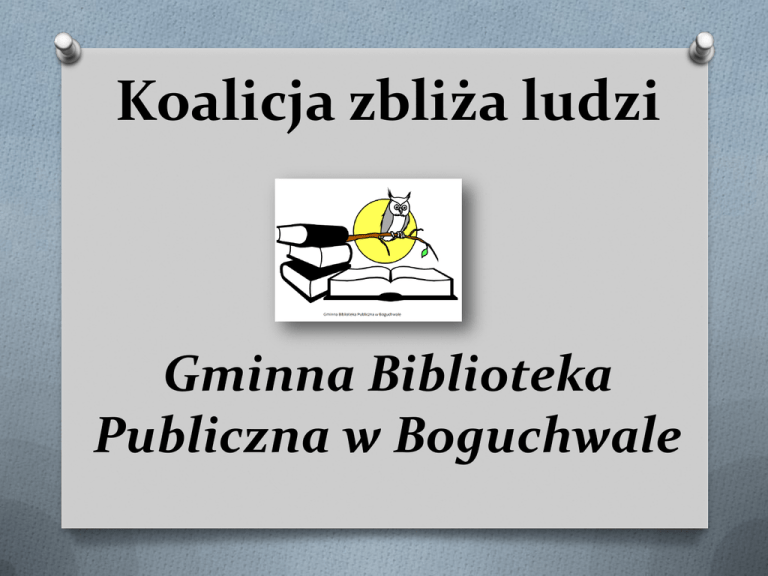 Koalicja zbliża ludzi Gminna Biblioteka Publiczna w Boguchwale Biblioteka nie jest po to by była w paki pozamykana albo do ozdoby służąca, jest po to by była powszechnie użytkowana J. Lelewel J. Lelewel Skład Koalicji: Gminna Biblioteka Publiczna w Boguchwale Gmina Boguchwała Młodzieżowa Rada Gminy Boguchwała Stowarzyszenie Lokalna Grupa Działania „Trygon – Rozwój i Innowacja” Miejskie Centrum Kultury w Boguchwale Szkoły podstawowe i gimnazjalne z Gminy Boguchwała Liceum Ogólnokształcące w Boguchwale Towarzystwo Kobiet Krzewienia Kultury Regionalnej w Boguchwale Osoby prywatne Podkarpacki Ośrodek Doradztwa Rolniczego w Boguchwale Bank Spółdzielczy w Niechobrzu Stawiamy na wydarzenia, które łączą pokolenia Działania w ramach koalicji "Polacy dla Europy - o polskiej prezydencji w Unii Europejskiej" Koalicjanci: Stowarzyszenie LGD „Trygon – Rozwój i Innowacja” Podkarpacki Ośrodek Doradztwa Rolniczego w Boguchwale Miejskie Centrum Kultury w Boguchwale Szkoła Podstawowa w Boguchwale Osiągnięte rezultaty: uczestnicy poszerzyli wiedzę na temat Unii Europejskiej GBP w Boguchwale zdobyła nowych Użytkowników poprzez aktywny udział w życiu kulturalnym mieszkańców gminy koalicjant Lokalna Grupa Działania „Trygon - Rozwój i Innowacja” wypromował swoje działania na rzecz gminy wśród mieszkańców Dlaczego Ukraina? A dlaczego NIE!? wydarzenie promujące kulturę i tradycję Ukrainy Koalicjanci: Towarzystwo Kobiet Krzewienia Kultury Regionalnej w Boguchwale Podkarpacki Ośrodek Doradztwa Rolniczego w Boguchwale Liceum Ogólnokształcące w Boguchwale Lokalny Ośrodek Kultury „Razem” w Niechobrzu Poświęć czas swojemu dziecku, to inwestycja, o której Twoje dziecko nie zapomni. Biblioteczna Akademia Wielkich Umiejętności GBP w Boguchwale w partnerstwie z osobami prywatnymi zorganizowała 9 spotkań warsztatowych pn. „Biblioteczna Akademia Wielkich Umiejętności” Rodzic + Dziecko = Współpraca – Zrozumienie – Wspólna Pasja Wspólna praca rodzica z dzieckiem daje satysfakcję. Nasza biblioteka umożliwia edukację plastyczną. Podczas spotkań a było ich w sumie 8, powstały kukiełki, kwiaty, gwiazdy, stroje, jajka wielkanocne. Spotkania prowadzili mieszkańcy gminy Boguchwała, którzy są pasjonatami rękodzieła artystycznego. Warsztaty plastyczne stały się idealnym miejscem spotkań dużych i małych użytkowników biblioteki. Osiągnięte rezultaty: uczestnicy nauczyli się robić coś z niczego, np. anioły z papieru, bukiety z bibuły itp. GBP w Boguchwale zdobyła nowych Użytkowników poprzez umożliwienie najmłodszym mieszkańcom gminy rozwój zdolności manualnych Komputer dla Seniora Celem przedsięwzięcia była edukacja komputerowa Seniorów z Gminy Boguchwała, aktywizacja dorosłych mieszkańców oraz promocja oferty biblioteki w środowisku lokalnym Koalicjanci: Szkoła Podstawowa w Boguchwale, w Racławówce i w Mogielnicy Wolontariusze prowadzący zajęcia z Seniorami Kurs komputerowy dla seniorów w ramach cyklicznych działań e-Seniora Mój wnuczek wraca zaraz ze szkoły, muszę się spieszyć, chciałem jeszcze pogadać ze znajomą na skype fot. Jupiter Images …nie dość, że książki pożyczają to jeszcze zrobili kurs komputerowy… Tak trzymać Z nami nauczysz się więcej, biblioteka wspiera edukację Sportowiec, urzędnik, senior… nie ważne co robisz, ważne, że chcesz się uczyć Warsztaty dziennikarskie, nauka języka angielskiego, kursy komputerowe to tylko niektóre propozycje biblioteki w Boguchwale Recepta na sukces Jak to robimy: Trzymamy się wersji wydarzeń, wedle której działamy: MĄDRZE – TWÓRCZO – Z HUMOREM Nasze działania nie są RACJONALNE, one prześcigają RACJONALIZM. Przykładem są zorganizowane w 2011 r. warsztaty dziennikarskie, które objęły zasięgiem dzieci, młodzież i dorosłych. Po tych warsztatach działamy według zasady 3P: PYTAM – PISZE – PUBLIKUJE Robimy, bo lubimy… Działamy, bo mamy… Inspirujemy, bo… GMINNA BIBLIOTEKA PUBLICZNA W BOGUCHWALE LUDZI PASJĘ TO MA SENS EFEKTY działalności: Wzrost liczby wykształciuchów Liczba odwiedzin w bibliotece uległa zmianie na PLUS Biblioteka = Edukacja Wzrost świadomości mieszkańców gminy Boguchwała o bibliotece i jej ofercie Było o NAS głośno w telewizji – afera? – NIE – nasz projekt warsztatów dziennikarskich był na tyle oryginalny Dziękuję za uwagę Opracowała: Aneta Pyza