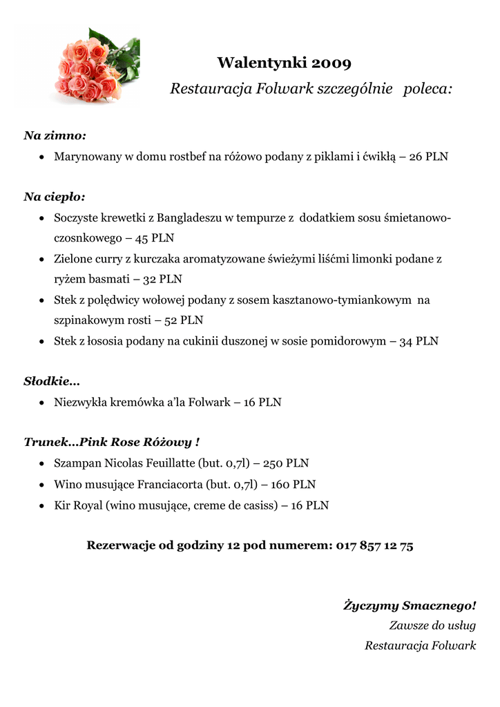 Walentynki 2009 Restauracja Folwark szczególnie poleca: Na zimno: Marynowany w domu rostbef na różowo podany z piklami i ćwikłą – 26 PLN Na ciepło: Soczyste krewetki z Bangladeszu w tempurze z dodatkiem sosu śmietanowoczosnkowego – 45 PLN Zielone curry z kurczaka aromatyzowane świeżymi liśćmi limonki podane z ryżem basmati – 32 PLN Stek z polędwicy wołowej podany z sosem kasztanowo-tymiankowym na szpinakowym rosti – 52 PLN Stek z łososia podany na cukinii duszonej w sosie pomidorowym – 34 PLN Słodkie… Niezwykła kremówka a’la Folwark – 16 PLN Trunek…Pink Rose Różowy ! Szampan Nicolas Feuillatte (but. 0,7l) – 250 PLN Wino musujące Franciacorta (but. 0,7l) – 160 PLN Kir Royal (wino musujące, creme de casiss) – 16 PLN Rezerwacje od godziny 12 pod numerem: 017 857 12 75 Życzymy Smacznego! Zawsze do usług Restauracja Folwark