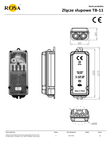 Karta produktu Złącze słupowe TB-11 Dane producenta Zakład Produkcji Sprzętu Oświetleniowego ROSA Stanisław Rosa 43-109 Tychy, ul. Strefowa 1, tel. +48 32 73 88 901, www.rosa.pl Edycja Data aktualizacji 4 28.07.2015 Podpis Strona 1/2 Karta produktu Złącze słupowe TB-11 Dane techniczne Typ złącza TB-11 Kod 324011 Ilość gniazd bezpiecznikowych 1 Klasa ochronności II Stopień ochrony IP54 Napięcie znamionowe izolacji [V] 500 Napięcie znamionowe udarowe wytrzymywane [kV] 6 Prąd znamionowy [A] 80 złącze czterotorowe, max. 2 kable o przekroju od 4x10 mm2 do 4x35 mm2, przekrój przewodu oprawy max. 4 mm2 Zakres przekroju kabli i przewodów przyłączeniowych zintegrowana listwa zaciskowa—PBT (politereftalan butylenu—tworzywo o wysokich parametrach izolacyjnych i dużej wytrzymałości mechanicznej); pokrywa złącza oraz osłona zacisków i przewodów—przezroczysty poliwęglan; podstawa złącza—poliwęglan wzmocniony włóknem szklanym; otwory wyjść kablowych zabezpieczone uszczelkami Materiał Waga [kg] 0,67 Objętość jednostkowa [kg] 1,7 Dyrektywa niskonapięciowa LVD 2006/95/WE Norma PN-EN 61439-1:2011, PN-EN 61439-2:2011 Wkładka topikowa D01 Typ wkładki topikowej Kod Waga [kg] D01/E14 6A 322006 0,01 D01/E14 10A 322010 0,01 D01/E14 16A 322016 0,01 Dane producenta Zakład Produkcji Sprzętu Oświetleniowego ROSA Stanisław Rosa 43-109 Tychy, ul. Strefowa 1, tel. +48 32 73 88 901, www.rosa.pl Edycja Data aktualizacji 4 28.07.2015 Podpis Strona 2/2