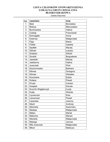LISTA CZŁONKÓW STOWARZYSZENIA LOKALNA GRUPA DZIAŁANIA BLISKO KRAKOWA (osoby fizyczne) Lp. 1. 2. 3. 4. 5. 6. 7. 8. 9. 10. 11. 12. 13. 14. 15. 16. 17. 18. 19. 20. 21. 22. 23. 24. 25. 26. 27. 28. 29. 30. 31. 32. 33. 34. 35. 36. nazwisko Bieś Biskup Buchowska Czekaj Domagała Dzierwa Figa Fiołek Gędłek Gliński Grabiec Godzik Jasielski Jaskierna Juszczak Kaczorowska Klimas Klimas Koczwara Kolasa Krupa Książek Kucmin-Węglarczyk Kułaj Lipowczan Lipowczan Łazarska Mach Macheta Madeja Malec Małucha Mardyła Matoga Miś-Juszczyk Mlost imię Bronisław Mieczysław Halina Franciszek Anna Małgorzata Maria Izabela Maciej Łukasz Witold Bogusława Maciej Halina Piotr Barbara Grzegorz Wiesław Edyta Paweł Łukasz Dorota Łucja Wanda Ewa Paweł Joanna Andrzej Kazimierz Małgorzata Marek Marian Małgorzata Janusz Małgorzata Mateusz LISTA CZŁONKÓW STOWARZYSZENIA LOKALNA GRUPA DZIAŁANIA BLISKO KRAKOWA (osoby fizyczne) 37. 38. 39. 40. 41. 42. 43. 44. 45. 46. 47. 48. 49. 50. 51. 52. 53. 54. 55. 56. 57. Myjak Nędza Niechaj Pietras-Goc Pyla Skalska Słomka Suchanik Śmiech Śnieżek Targosz Tomczyk Trojan Tylek Urbańczyk-Kowalik Waś Wolarek Wrzoszczyk Wrzoszczyk Wrzoszczyk Żukowski Stanisław Aneta Józef Bożena Zofia Beata Stanisław Józef Janusz Artur Helena Małgorzata Janusz Dariusz Edyta Aneta Andrzej Anna Daniel Arkadiusz Mateusz