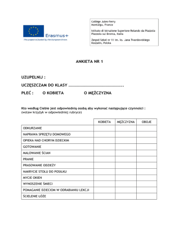 ANKIETA NR 1 UZUPEŁNIJ : UCZĘSZCZAM DO KLASY …………………………………………….. PŁEĆ : O KOBIETA O MĘŻCZYZNA Kto według Ciebie jest odpowiednią osobą aby wykonać następujące czynności : (wstaw krzyżyk w odpowiedniej rubryce) KOBIETA ODKURZANIE NAPRAWA SPRZĘTU DOMOWEGO OPIEKA NAD CHORYM DZIECKIM GOTOWANIE MALOWANIE ŚCIAN PRANIE PRASOWANIE ODZIEŻY NAKRYCIE STOŁU DO POSIŁKU MYCIE OKIEN WYNOSZENIE ŚMIECI POMAGANIE DZIECIOM W ODRABIANIU LEKCJI ŚCIELENIE ŁÓŻE MĘŻCZYZNA OBOJE ANKIETA NR 2 UZUPEŁNIJ : UCZĘSZCZAM DO KLASY …………………………………………….. PŁEĆ : O KOBIETA O MĘŻCZYZNA Kto najlepiej wykona następujące czynności : (wstaw krzyżyk w odpowiedniej rubryce) KOBIETA PILOTOWANIE SAMOLOTU OPIEKA NAD DZIEĆMI BUDOWA DOMU NAPRAWA SAMOCHODU USZYCIE UBRANIA PRZYJĘCIE KLIJENTA W HOTELU PRZESŁUCHANIE PRZESTĘPCY UCZESANIE WŁOSÓW SPRZEDAŻ KOSMETYKÓW PROJEKTOWANIE ZIELENI ZARZĄDZANIE AGENCJĄ BANKOWĄ TWORZENIE OPROGRAMOWANIA KOMPUTEROWEGO MĘŻCZYZNA OBOJE