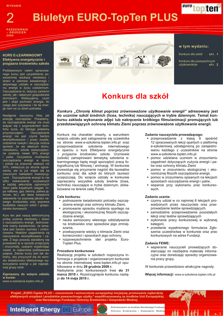 WYDANIE 2 Biuletyn EURO-TopTen PLUS P AŹDZIERNIK – GRUDZIEŃ 2009 w tym wydaniu: Konkurs dla szkół KURS E-LEARNINGOWY Efektywna energetycznie i przyjazna środowisku szkoła Podstawowym celem opracowanego kursu jest uzupełnienie powszechnej edukacji młodzieży i dzieci w zakresie świadomego i aktywnego udziału w oszczędzaniu energii w życiu codziennym. Oszczędzanie to, dotyczy zarówno szkoły, jak i własnych gospodarstw domowych. Wskazujemy, czym jest i skąd pochodzi energia, do czego jest zużywana i ile tej energii nam na co dzień potrzeba. Następnie nauczymy Was jak energię oszczędzać. Pokażemy, że oszczędzanie energii nie musi wiązać się z pogorszeniem komfortu życia, do którego jesteśmy przyzwyczajeni. Oszczędzanie energii nie jest czymś bardzo skomplikowanym i przez zwykłe, codzienne nawyki i decyzje można sprawić, że we własnym domu, mieszkaniu, szkole zaoszczędzone zostanie nawet 30% energii i paliw. Oczywiście możliwości oszczędzania energii w domu i szkole są znacznie większe niż 30%, zwłaszcza po stronie ogrzewania, ale to już wiąże się ze znacznymi nakładami inwestycyjnymi. Oszczędzanie energii to nie tylko redukowanie zużywanych w każdej sekundzie ogromnych ilości paliw kopalnych (węgiel, ropa naftowa, gaz ziemny, paliwa jądrowe, itd.), ale także świadome wpływanie na poprawę jakości naszego środowiska oraz poprawa budżetów naszych szkół i gospodarstw domowych. Kurs ten jest naszą elektroniczną próbą uczenia młodzieży i dzieci o oszczędzaniu energii. Jednocześnie mamy świadomość, że tematyka jest bardzo szeroka i zróżnicowana. Niektóre zagadnienia są rzeczywiście skomplikowane i zawiłe. Z tego powodu staraliśmy się przestawić je w sposób przejrzysty i zrozumiały, czasami wyjaśniając nawet, te najbardziej podstawowe pojęcia. Zakres kursu jest tak dobrany, aby przyczynił się do wzrostu świadomości efektywnego wykorzystania energii u jak największej grupy osób. Zapraszany do wzięcia udziału w kursie: www.e-szkolenia.topten.info.pl str. 1 Konkurs dla powszechnych użytkowników str. 2 Konkurs dla szkół Konkurs „Chronię klimat poprzez zrównoważone użytkowanie energii” adresowany jest do uczniów szkół średnich (licea, technika) nauczających w trybie dziennym. Temat konkursu zakłada wykonanie zdjęć lub nakręcenie krótkiego filmu/animacji promujących lub przedstawiających ochronę klimatu Ziemi poprzez zrównoważone użytkowanie energii. Konkurs ma charakter otwarty, a warunkiem wzięcia udziału jest zalogowanie się uczestnika na stronie www.e-szkolenia.topten.info.pl oraz przeprowadzenie szkolenia internetowego w oparciu o kurs Efektywna energetycznie i przyjazna środowisku szkoła. Uczniowie (szkoła) zainspirowani tematyką szkolenia elearningowego będą mogli sporządzić pracę fotograficzną lub filmową / animację. W konkursie przewiduje się przyznanie nagród dla laureatów konkursu oraz dla szkół do których laureaci uczęszczają. Do wzięcia udziały w konkursie zapraszamy wszystkie szkoły średnie (licea, technika) nauczające w trybie dziennym, zlokalizowane na terenie całej Polski. Zadania nauczyciela prowadzącego: przeprowadzenie z klasą 6 spośród 12 opracowanych lekcji opartych o platformę e-szkoleniową udostępnioną po zarejestrowaniu każdego z uczestników na stronie www.e-szkolenia.topten.info.pl. pomoc udzielana uczniom w zrozumieniu zagadnień dotyczących zużycia energii i paliw oraz ochrony klimatu Ziemi pomoc w zrozumieniu ekologicznej i ekonomicznej filozofii oszczędzania energii, pomoc w zrozumieniu opisanych na lekcjach sposobach oszczędzania energii i paliw, wsparcie przy wykonaniu prac konkursowych. Cele konkursu podnoszenie świadomości potrzeby oszczędzania energii oraz ochrony klimatu Ziemi, promowanie sposobu myślenia opartego na ekologicznej i ekonomicznej filozofii oszczędzania energii, nauka samooceny własnego oddziaływania na środowisko oraz sposobów jego zmniejszania, przekazywanie wiedzy o klimacie Ziemi oraz konieczności i sposobach jego ochrony, rozpowszechnienie idei projektu EuroTopten Plus. Zadania ucznia: czynny udział w co najmniej 6 lekcjach prowadzonych przez nauczyciela oraz przeprowadzenie testów sprawdzających, samodzielne przeprowadzenie pozostałych lekcji oraz testów sprawdzających wykonanie pracy konkursowej w wybranej kategorii, przesłanie wypełnionego formularza Zgłoszenia uczestnictwa w konkursie oraz prac konkursowych na adres Fundacji. Procedura konkursowa Realizację projektu w szkołach rozpoczyna informacja o projekcie i organizowanym konkursie na stronie internetowej www.topten.info.pl opublikowana w dniu 29 grudnia 2009 r. Nadsyłanie prac konkursowych trwa do 31 marca 2010 r. Rozstrzygnięcie konkursu nastąpi do 14 maja 2010 r. Zadania FEWE: wspieranie nauczycieli prowadzących dostarczając im niezbędne materiały informacyjne oraz doradzając sposoby organizowania pracy grupy. W konkursie przewidziano atrakcyjne nagrody. Więcej informacji: www.e-szkolenia.topten.info.pl Projekt „EURO-Topten PLUS – rozszerzenie i wzmocnienie europejskiej inicjatywy promowania najbardziej efektywnych urządzeń i produktów powszechnego użytku” współfinansowany ze środków Unii Europejskiej oraz Narodowego Funduszu Ochrony Środowiska i Gospodarki Wodnej. s. 1 Konkurs dla powszechnych użytkowników KURS E-LEARNINGOWY Jestem świadomym obywatelem. Podstawowym celem niniejszego kursu jest realizacja powszechnej edukacji społeczeństwa w zakresie świadomego i aktywnego udziału w oszczędzaniu energii w codziennym życiu. Kurs ten zawiera szeroki zakres materiału. nie zawsze łatwy, ale opanowanie tego materiału umożliwi uczącemu się poznanie i zrozumienie podstawowych czynników opisujących zużycie energii oraz konsekwencji z tego wynikających, zarówno we własnym gospodarstwie, kraju, jak również na świecie. Będąc uczestnikami światowego rynku ene