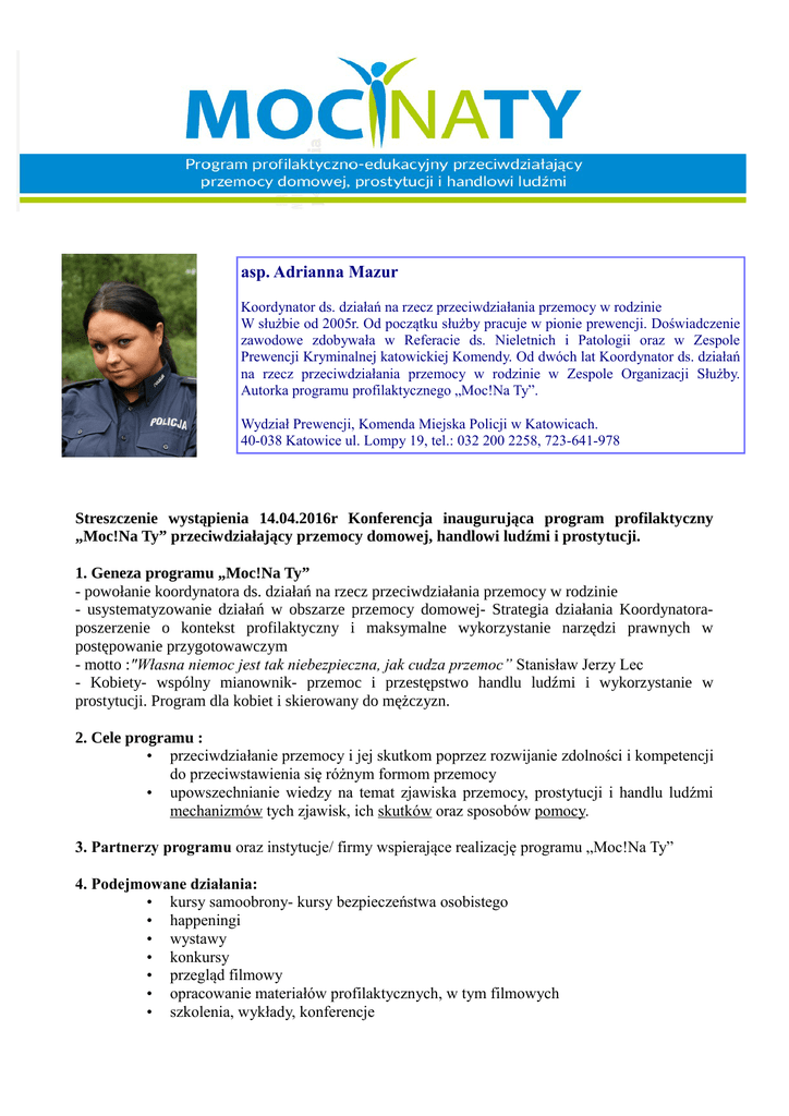 asp. Adrianna Mazur Koordynator ds. działań na rzecz przeciwdziałania przemocy w rodzinie W służbie od 2005r. Od początku służby pracuje w pionie prewencji. Doświadczenie zawodowe zdobywała w Referacie ds. Nieletnich i Patologii oraz w Zespole Prewencji Kryminalnej katowickiej Komendy. Od dwóch lat Koordynator ds. działań na rzecz przeciwdziałania przemocy w rodzinie w Zespole Organizacji Służby. Autorka programu profilaktycznego „Moc!Na Ty”. Wydział Prewencji, Komenda Miejska Policji w Katowicach. 40-038 Katowice ul. Lompy 19, tel.: 032 200 2258, 723-641-978 Streszczenie wystąpienia 14.04.2016r Konferencja inaugurująca program profilaktyczny „Moc!Na Ty” przeciwdziałający przemocy domowej, handlowi ludźmi i prostytucji. 1. Geneza programu „Moc!Na Ty” - powołanie koordynatora ds. działań na rzecz przeciwdziałania przemocy w rodzinie - usystematyzowanie działań w obszarze przemocy domowej- Strategia działania Koordynatoraposzerzenie o kontekst profilaktyczny i maksymalne wykorzystanie narzędzi prawnych w postępowanie przygotowawczym - motto :"Własna niemoc jest tak niebezpieczna, jak cudza przemoc” Stanisław Jerzy Lec - Kobiety- wspólny mianownik- przemoc i przestępstwo handlu ludźmi i wykorzystanie w prostytucji. Program dla kobiet i skierowany do mężczyzn. 2. Cele programu : • przeciwdziałanie przemocy i jej skutkom poprzez rozwijanie zdolności i kompetencji do przeciwstawienia się różnym formom przemocy • upowszechnianie wiedzy na temat zjawiska przemocy, prostytucji i handlu ludźmi mechanizmów tych zjawisk, ich skutków oraz sposobów pomocy. 3. Partnerzy programu oraz instytucje/ firmy wspierające realizację programu „Moc!Na Ty” 4. Podejmowane działania: • kursy samoobrony- kursy bezpieczeństwa osobistego • happeningi • wystawy • konkursy • przegląd filmowy • opracowanie materiałów profilaktycznych, w tym filmowych • szkolenia, wykłady, konferencje 5. Działanie podjęte pilotażowo: -Kursy samoobrony dla kobiet narażonych na przemoc. Innowacyjne podejście do zajęć z zakresu bezpieczeństwa osobistego- równoczesne animacje dla dzieci uczestniczekwykorzystanie czasu na naukę i zabawę- foto- i wideorelacja z zajęć pilotażowych w ramach programu „Moc!Na Ty”. - Happening profilaktyczny „Mamo, tato nie zgub mnie” - pierwsza w Polsce akcja w centrum handlowym mająca zapobiegać zagubieniu dziecka i jego konsekwencjom- handlowi ludźmi, pedofilii, pracy przymusowej, przemocy …... - policjantki rozdawały silikonowe bransoletki „Zgubiłem się, pomóż mi” dla najmłodszych, ze specjalnym miejscem wewnątrz, służącym do zapisania numeru telefony do rodzica/ opiekuna.
