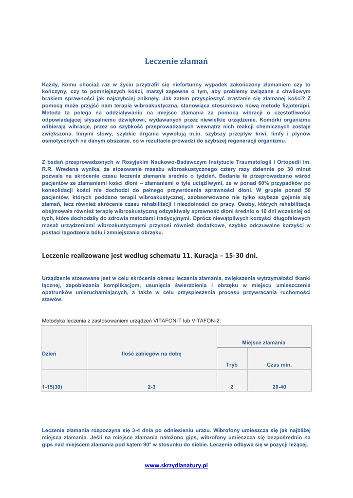 Leczenie złamań Każdy, komu chociaż raz w życiu przytrafił się niefortunny wypadek zakończony złamaniem czy to kończyny, czy to pomniejszych kości, marzył zapewne o tym, aby problemy związane z chwilowym brakiem sprawności jak najszybciej zniknęły. Jak zatem przyspieszyć zrastanie się złamanej kości? Z pomocą może przyjść nam terapia wibroakustyczna, stanowiąca stosunkowo nową metodę fizjoterapii. Metoda ta polega na oddziaływaniu na miejsce złamania za pomocą wibracji o częstotliwości odpowiadającej słyszalnemu dźwiękowi, wydawanych przez niewielkie urządzenie. Komórki organizmu odbierają wibracje, przez co szybkość przeprowadzanych wewnątrz nich reakcji chemicznych zostaje zwiększona. Innymi słowy, szybkie drgania wywołują m.in. szybszy przepływ krwi, limfy i płynów osmotycznych na danym obszarze, co w rezultacie prowadzi do szybszej regeneracji organizmu. Z badań przeprowadzonych w Rosyjskim Naukowo-Badawczym Instytucie Traumatologii i Ortopedii im. R.R. Wredena wynika, że stosowanie masażu wibroakustycznego cztery razy dziennie po 30 minut pozwala na skrócenie czasu leczenia złamania średnio o tydzień. Badania te przeprowadzano wśród pacjentów ze złamaniami kości dłoni – złamaniami o tyle uciążliwymi, że w ponad 60% przypadków po konsolidacji kości nie dochodzi do pełnego przywrócenia sprawności dłoni. W grupie ponad 50 pacjentów, których poddano terapii wibroakustycznej, zaobserwowano nie tylko szybsze gojenie się złamań, lecz również skrócenie czasu rehabilitacji i niezdolności do pracy. Osoby, których rehabilitacja obejmowała również terapię wibroakustyczną odzyskiwały sprawność dłoni średnio o 10 dni wcześniej od tych, które dochodziły do zdrowia metodami tradycyjnymi. Oprócz niewątpliwych korzyści długofalowych masaż urządzeniami wibroakustycznymi przynosi również dodatkowe, szybko odczuwalne korzyści w postaci łagodzenia bólu i zmniejszania obrzęku. Leczenie realizowane jest według schematu 11. Kuracja – 15-30 dni. Urządzenie stosowane jest w celu skrócenia okresu leczenia złamania, zwiększenia wytrzymałości tkanki łącznej, zapobieżenia komplikacjom, usunięcia świerzbienia i obrzęku w miejscu umieszczenia opatrunków unieruchamiających, a także w celu przyspieszenia procesu przywracania ruchomości stawów. Metodyka leczenia z zastosowaniem urządzeń VITAFON-T lub VITAFON-2: Miejsce złamania Dzień 1-15(30) Ilość zabiegów na dobę 2-3 Tryb Czas min. 2 20-40 Leczenie złamania rozpoczyna się 3-4 dnia po odniesieniu urazu. Wibrofony umieszcza się jak najbliżej miejsca złamania. Jeśli na miejsce złamania nałożono gips, wibrofony umieszcza się bezpośrednio na gips nad miejscem złamania pod kątem 90° w stosunku do siebie. Leczenie odbywa się w pozycji leżącej. www.skrzydlanatury.pl Po zabiegu zaleca się leżeć przez 1-2 godziny. W przypadku pojawienia się obrzęku, poniżej opaski uciskowej należy dodatkowo umieścić wibrofony w obszarze obrzęku w trybie 2 na 15-20 minut. Przy leczeniu złamań kończyn w trakcie zabiegu można umieścić pod nogami poduszkę w celu poprawienia odpływu krwi. Urządzenie może być stosowane w połączeniu z innymi sposobami leczenia, w tym z aparatem Ilizarowa, a także przy leczeniu z zastosowaniem przedmiotów z metalu, stosowanych w celu wewnętrznego unieruchomienia kości. W celu przywrócenia i zwiększenia ruchomości stawów stosuje się tryb 4, czas trwania zabiegu – 20-40 minut. Wibrofony umieszcza się na stawie jeden obok drugiego. Jeśli jest taka możliwość w czasie zabiegu zaleca się wykonywanie ćwiczeń, mających na celu zwiększenie ruchomości – przy niewielkim wysiłku powoli zgina się staw w ciągu 20-30 sekund, a następnie tak samo wolno prostuje się go. Ćwiczenie wykonuje się w ciągu połowy czasu trwania zabiegu. www.skrzydlanatury.pl