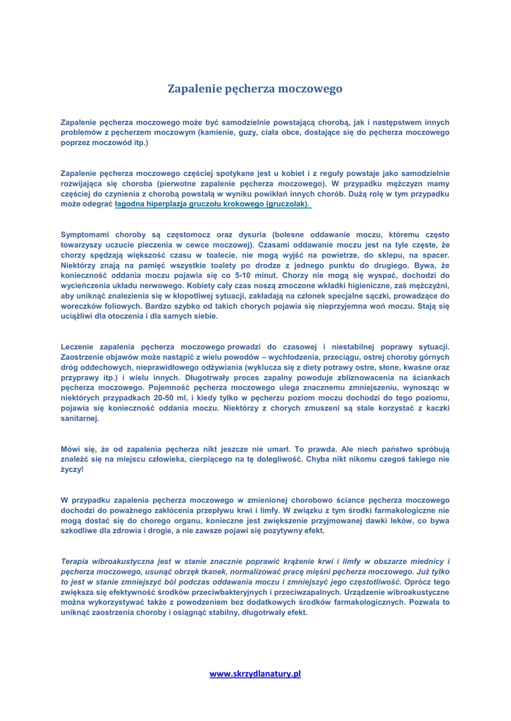 Zapalenie pęcherza moczowego Zapalenie pęcherza moczowego może być samodzielnie powstającą chorobą, jak i następstwem innych problemów z pęcherzem moczowym (kamienie, guzy, ciała obce, dostające się do pęcherza moczowego poprzez moczowód itp.) Zapalenie pęcherza moczowego częściej spotykane jest u kobiet i z reguły powstaje jako samodzielnie rozwijająca się choroba (pierwotne zapalenie pęcherza moczowego). W przypadku mężczyzn mamy częściej do czynienia z chorobą powstałą w wyniku powikłań innych chorób. Dużą rolę w tym przypadku może odegrać łagodna hiperplazja gruczołu krokowego (gruczolak). Symptomami choroby są częstomocz oraz dysuria (bolesne oddawanie moczu, któremu często towarzyszy uczucie pieczenia w cewce moczowej). Czasami oddawanie moczu jest na tyle częste, że chorzy spędzają większość czasu w toalecie, nie mogą wyjść na powietrze, do sklepu, na spacer. Niektórzy znają na pamięć wszystkie toalety po drodze z jednego punktu do drugiego. Bywa, że konieczność oddania moczu pojawia się co 5-10 minut. Chorzy nie mogą się wyspać, dochodzi do wycieńczenia układu nerwowego. Kobiety cały czas noszą zmoczone wkładki higieniczne, zaś mężczyźni, aby uniknąć znalezienia się w kłopotliwej sytuacji, zakładają na członek specjalne sączki, prowadzące do woreczków foliowych. Bardzo szybko od takich chorych pojawia się nieprzyjemna woń moczu. Stają się uciążliwi dla otoczenia i dla samych siebie. Leczenie zapalenia pęcherza moczowego prowadzi do czasowej i niestabilnej poprawy sytuacji. Zaostrzenie objawów może nastąpić z wielu powodów – wychłodzenia, przeciągu, ostrej choroby górnych dróg oddechowych, nieprawidłowego odżywiania (wyklucza się z diety potrawy ostre, słone, kwaśne oraz przyprawy itp.) i wielu innych. Długotrwały proces zapalny powoduje zbliznowacenia na ściankach pęcherza moczowego. Pojemność pęcherza moczowego ulega znacznemu zmniejszeniu, wynosząc w niektórych przypadkach 20-50 ml, i kiedy tylko w pęcherzu poziom moczu dochodzi do tego poziomu, pojawia się konieczność oddania moczu. Niektórzy z chorych zmuszeni są stale korzystać z kaczki sanitarnej. Mówi się, że od zapalenia pęcherza nikt jeszcze nie umarł. To prawda. Ale niech państwo spróbują znaleźć się na miejscu człowieka, cierpiącego na tę dolegliwość. Chyba nikt nikomu czegoś takiego nie życzy! W przypadku zapalenia pęcherza moczowego w zmienionej chorobowo ściance pęcherza moczowego dochodzi do poważnego zakłócenia przepływu krwi i limfy. W związku z tym środki farmakologiczne nie mogą dostać się do chorego organu, konieczne jest zwiększenie przyjmowanej dawki leków, co bywa szkodliwe dla zdrowia i drogie, a nie zawsze pojawi się pozytywny efekt. Terapia wibroakustyczna jest w stanie znacznie poprawić krążenie krwi i limfy w obszarze miednicy i pęcherza moczowego, usunąć obrzęk tkanek, normalizować pracę mięśni pęcherza moczowego. Już tylko to jest w stanie zmniejszyć ból podczas oddawania moczu i zmniejszyć jego częstotliwość. Oprócz tego zwiększa się efektywność środków przeciwbakteryjnych i przeciwzapalnych. Urządzenie wibroakustyczne można wykorzystywać także z powodzeniem bez dodatkowych środków farmakologicznych. Pozwala to uniknąć zaostrzenia choroby i osiągnąć stabilny, długotrwały efekt. www.skrzydlanatury.pl Należy zaznaczyć, że stosowanie terapii wibroakustycznej bez trafnie postawionej diagnozy bywa mało efektywne, a czasami nawet nieprawidłowe. Nie ma sensu korzystanie z urządzenia, jeśli w pęcherzu moczowym jest kamień, guz, ciało obce. Należy zadbać o usunięcie przyczyny zapalenia pęcherza moczowego, aby się go pozbyć. Wynika z tego jasno, że aby podjąć leczenie, konieczne jest przeprowadzenie dokładnych badań i otrzymanie zaleceń od lekarza prowadzącego. Z doświadczenia lekarzy z kliniki urologii Sankt-Petersburskiej Wojskowej Akademii Medycznej wynika że, zastosowanie urządzenia wibroakustycznego VITAFON w leczeniu zapalenia pęcherza moczowego jest bardzo efektywne, nie szkodzi pacjentowi i ma ogromne perspektywy rozwoju. W stadium zaostrzenia się stanu zapalnego urządzenie stosuje się równolegle z terapią farmakologiczną. W przypadku remisji urządzenie można stosować bez leków. Leczenie zapalenia pęcherza moczowego Kuracja składa się z 2 etapów. Pierwszy etap leczenia (przygotowawczy) – według schematu 4, czas trwania – 10 dni. Drugi etap leczenia (zasadniczy) – według schematu 8, czas trwania – 14 dni. Jeśli zachodzi konieczność kurację należy powtórzyć po upływie 1-3 tygodni. W stadium ostrej choroby urządzenie stosuje się w połączeniu z terapią farmaceutykami. W stadium remisji urządzenie może być użytkowane bez środków przeciwzapalnych, wystarczająco w ciągu 10 dni, na noc, dolną część brzucha smarować środkiem przeciwzapalnym. Pozycja – leżąc na plecach. Jeden z wibrofonów należy umieścić w kroczu, drugi – w dolnej części brzucha, w pobliżu pęcherza moczowego. Czas działania – 15 minut. Na noc zaleca się działanie na obszar Е4 przez 5 minut. www.skrzydlanatury.pl