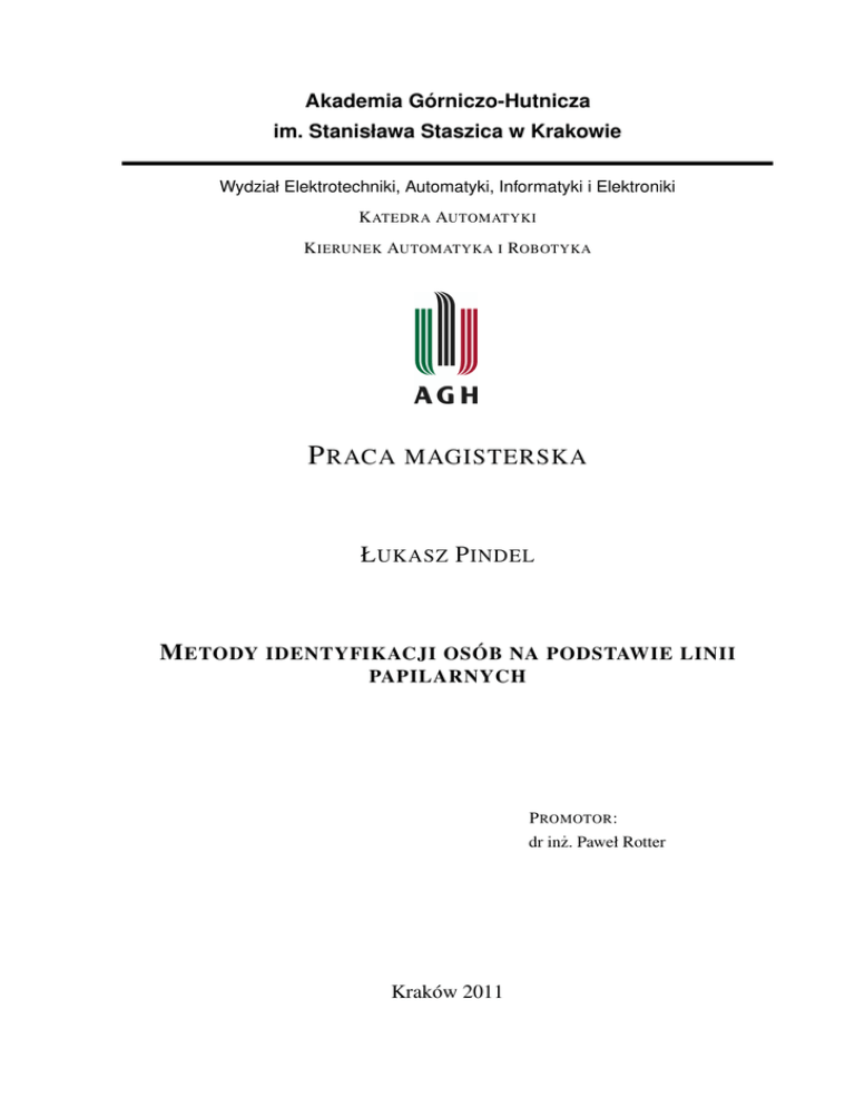 Akademia Górniczo-Hutnicza im. Stanisława Staszica w Krakowie Wydział Elektrotechniki, Automatyki, Informatyki i Elektroniki K ATEDRA AUTOMATYKI K IERUNEK AUTOMATYKA I ROBOTYKA P RACA MAGISTERSKA Ł UKASZ P INDEL M ETODY IDENTYFIKACJI OSÓB NA PODSTAWIE LINII PAPILARNYCH P ROMOTOR : dr inż. Paweł Rotter Kraków 2011 O ŚWIADCZENIE AUTORA PRACY O ŚWIADCZAM , ŚWIADOMY ODPOWIEDZIALNO ŚCI KARNEJ ZA PO ŚWIAD CZENIE NIEPRAWDY, ŻE NINIEJSZ A˛ PRAC E˛ DYPLOMOWA˛ WYKONAŁEM OSOBI ŚCIE I SAMODZIELNIE , I NIE KORZYSTAŁEM ZE ŹRÓDEŁ INNYCH NI Ż WYMIENIONE W PRACY. ................................... PODPIS AGH University of Science and Technology in Krakow Faculty of Electrical Engineering, Automatics, Computer Science and Electronics D EPARTMENT OF AUTOMATICS D ISCIPLINE AUTOMATICS AND ROBOTICS M ASTER OF S CIENCE T HESIS Ł UKASZ P INDEL M ETHODS FOR FINGERPRINT- BASED IDENTIFICATION OF PEOPLE S UPERVISOR : Paweł Rotter Ph.D Krakow 2011 Serdecznie dzi˛ekuj˛e promotorowi za poświ˛econy czas i wskazówki pomocne przy realizacji pracy. Spis treści 1. Wst˛ep .............................................................................................................................................. 7 1.1. Cel pracy ................................................................................................................................. 7 1.2. Linie papilarne ........................................................................................................................ 7 1.3. Zastosowanie linii papilarnych w biometrii............................................................................ 8 1.4. Pobranie odcisków palców ..................................................................................................... 11 1.4.1. Skaner optyczny ......................................................................................................... 13 1.4.2. Skaner pojemnościowy .............................................................................................. 13 1.4.3. Skaner termiczny........................................................................................................ 14 1.4.4. Skaner ultradźwi˛ekowy .............................................................................................. 14 1.4.5. Skaner wybrany do celów aplikacji ........................................................................... 15 2. Filtracja obrazu linii papilarnych ............................................................................................... 16 2.1. Tworzenie mapy orientacji...................................................................................................... 16 2.2. Filtracja Gabora ...................................................................................................................... 17 2.3. Finalizowanie filtracji ............................................................................................................. 18 3. Wykrywanie minucji ..................................................................................................................... 19 4. Porównanie układów minucji ...................................................................................................... 22 5. Implementacja ............................................................................................................................... 25 5.1. Wst˛ep ...................................................................................................................................... 25 5.2. Aplikacja upek.exe.................................................................................................................. 25 5.2.1. Opis ............................................................................................................................ 25 5.2.2. Możliwości zmian ...................................................................................................... 28 5.3. Aplikacja porownanie.exe....................................................................................................... 28 5.3.1. Opis ............................................................................................................................ 28 5.3.2. Możliwości zmian ...................................................................................................... 33 5.4. Aplikacja finger.fig ................................................................................................................. 33 5.4.1. Wst˛ep ......................................................................................................................... 33 5.4.2. Utworzenie modelu wzorcowego............................................................................... 34 5.4.3. Pozyskanie odcisku bieżacego ˛ ................................................................................... 34 5 SPIS TREŚCI 6 5.4.4. Filtrowanie obrazu bieżacego..................................................................................... ˛ 35 5.4.5. Wykrywanie minucji .................................................................................................. 35 5.4.6. Porównanie grafów .................................................................................................... 37 5.4.7. Przyciski poza sekcjami ............................................................................................. 38 5.4.8. Możliwości zmian ...................................................................................................... 38 6. Testy ................................................................................................................................................ 39 6.1. Zakres i sposób przeprowadzenia testów................................................................................ 39 6.2. Przykłady .......................................................................................................................