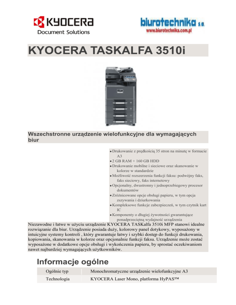 KYOCERA TASKALFA 3510i Wszechstronne urządzenie wielofunkcyjne dla wymagających biur Drukowanie z prędkością 35 stron na minutę w formacie A3 2 GB RAM + 160 GB HDD Drukowanie mobilne i sieciowe oraz skanowanie w kolorze w standardzie Możliwość rozszerzenia funkcji faksu: podwójny faks, faks sieciowy, faks internetowy Opcjonalny, dwustronny i jednoprzebiegowy procesor dokumentów Zróżnicowane opcje obsługi papieru, w tym opcja zszywania i dziurkowania Kompleksowe funkcje zabezpieczeń, w tym czytnik kart IC Komponenty o długiej żywotności gwarantujące ponadprzeciętną wydajność urządzenia Niezawodne i łatwe w użyciu urządzenie KYOCERA TASKalfa 3510i MFP stanowi idealne rozwiązanie dla biur. Urządzenie posiada duży, kolorowy panel dotykowy, wyposażony w intuicyjne systemy kontroli , który gwarantuje łatwy i szybki dostęp do funkcji drukowania, kopiowania, skanowania w kolorze oraz opcjonalnie funkcji faksu. Urządzenie może zostać wyposażone w dodatkowe opcje obsługi i wykończenia papieru, by sprostać oczekiwaniom nawet najbardziej wymagających użytkowników. Informacje ogólne Ogólnie typ Monochromatyczne urządzenie wielofunkcyjne A3 Technologia KYOCERA Laser Mono, platforma HyPAS™ Szerokość do 35/17 str. A4/A3 na minutę Rozdzielczość 600 x 600 dpi, technologia multi-bit do drukowania z jakością równoważną 9600 dpi x 600 dpi Czas nagrzewania 23 seconds lub mniej Czas do pierwszej kopii ok. 3.6 sekundy Wymiary (Szer. x Głęb. x Wys.) 594 x 738 x 683 mm Waga ok. 67 kg Pobór mocy Drukowanie: 660 W, tryb gotowości: 120 W, tryb uśpienia: 9.4 W, tryb oszczędzania energii 1.6 W Napięcie zasilania AC 220 V ~ 240 V, 50/60 Hz Hałas zgodność (ISO 7779) Drukowanie: 48,8 dB(A) LpA Tryb gotowości: 33,2 dB(A) LpA Certyfikaty GS, TÜV, CE - To urządzenie jest produkowane zgodnie z normami jakości ISO 9001, ochrony środowiska ISO 14001 oraz dyrektywą RoHs Ogólnie o pamięci 2048 MB RAM + 160 GB HDD Obsługa papieru Pojemność wejsciowa taca uniwersalna na 100 arkuszy, 45–256 g/m², A5R–A3, podajnik kasetowy 2 x 500 ark., 60–163 g/m², A5R–A3 Max. Pojemność z opcjami 4,100 arkuszy A4 Moduł dwustronny w standardzie, obsługa papieru A5R–A3, 60–163 g/m² Pojemność wyjściowa standardowo 250 arkuszy drukiem do dołu, maks. 3.200 arkuszy (z opcjami) Dodatkowe informacje Wszystkie podane tu pojemności dotyczą papieru o gubości 0,11 mm. Zaleca się stosowanie papieru polecanego przez KYOCERA Drukowanie Procesor Freescale QorIQ P1022 (Dual Core) 800 MHz Język kontrolera PRESCRIBE IIe Emulacje PCL6 (PCL5c/PCL-XL), KPDL3 (zgodna z PostScript 3), bezpośrednie drukowanie PDF i XPS Czcionki 93 czcionki konturowe (PCL), 136 czcionek (KPDL3), 8 czcionek (Windows Vista), 1 czcionka bitmapowa, 45 typów 1-wymiarowych oraz jeden 2-wymiarowy kod kreskowy (PDF-417) Dodatkowe możliwości drukowanie szyfrowany druk bezpośredni PDF, drukowanie IPP, e-mail printing, WSD, wydruk bezpieczny przez SSL, IPsec, SNMv3, wydruk próbny, wydruk prywatny, przechowywanie i zarządzanie pracami Obsługiwane Systemy Operacyjne (Wydruk) wszystkie bieżące wersje Microsoft Windows, Mac OS X wersja 10.4 lub wyższa, UNIX, LINUX oraz inne według potrzeb Kopiowanie Max. Rozmiar oryginału A3 Dodatkowe możliwości kopiowanie Skanuj-raz-drukuj-wielokrotnie, sorter elektroniczny, funkcja 2w1 / 4w1, powtarzanie obrazu, numerownie stron, tryb okładek, broszura, tryb pilnej kopii, łączenie obrazów, funkcja stempla, pomijanie pustych stron Typy ekspozycji Automat, ręczna: 7 lub 13 stopni Wbudowane zakresy powiększenia i pomniejszenia 5 zmniejszeń/5 powiększeń Zakres zoom-u 25 - 400% co 1% Wznowienie kopiowania 1 - 999 Ustawienia obrazu Tekst, foto, tekst + foto, mapa Skanowanie Typ pliku PDF (kompresowany PDF), przeszukiwalny PDF (opcjonalnie), TIFF, JPEG, XPS Rozpoznawanie oryginału Tekst, foto, tekst + foto, optymalizacja dla OCR Max. Rozmiar skanu A3 Funkcjonalności skanera Skan-do-email, skan-do-FTP, skan-do-SMB, skan-do-USB Host, skan-do-skrzynki, sieciowy TWAIN, skanowanie WSD Rozdzielczość skanera 600, 400, 300, 200, 200x100, 200x400, (256 odcieni) Szybkość skanera 160 obrazów mono lub 80 obrazów kolorowych na minutę (A4, 300 dpi, podajnik DP-772) Fax Kompatybilność ITU-T Super G3 Szybkość modemu 33.6 kbps Szybkość transmisji Maks. 3 sekundy (JBIG) Czułość skanera tryb Normal: 200 x 100 dpi tryb Fine: 200 x 200 dpi tryb Superfine: 200 x 400 dpi tryb Ultrafine: 400 x 400 dpi Max. Rozmiar oryginału A3 Metody kompresji MH, MMR, MR, JBIG Pamięć Standard 12 MB, maks. 128 MB Dodatkowo o Faxie faks sieciowy, wysyłanie i odbiór z obrotem obrazu, odbiór faksów 2-stronnych, odbiór do pamięci, skrzynka faksów, zdalna diagnostyka, opcjonalnie druga linia faksowa, opcjonalnie Internet-faks Interfejsy Standardowy interfejs USB 2.0 (Hi-Speed), USB Host 2.0, Fast Ethernet 10BaseT/100BaseTX/1000BaseT, slot na opcjonalny print server, slot na opcjonalną kartę SD, slot na opcjonalną kartę faksu Specjalista d/s sprzedaży pośredniej Kyocera : J. Kardasz tel : 22-631-41-40 , 22-837-44-72 kom : 694-080-753 mail : [email protected] www.: www.biurotechnika.com.pl , www.kyocera.oferteo.pl GG : 493409 01-244 Warszawa, ul. Prymasa Tysiąclecia 46 NIP: 527-010-40-02, Organ rejestrowy: Sąd Rejonowy dla m. st. Warszawy, XII Wydział Gospodarczy KRS Nr KRS 0000061218 Kapitał Zakładowy: 108 000 PLN