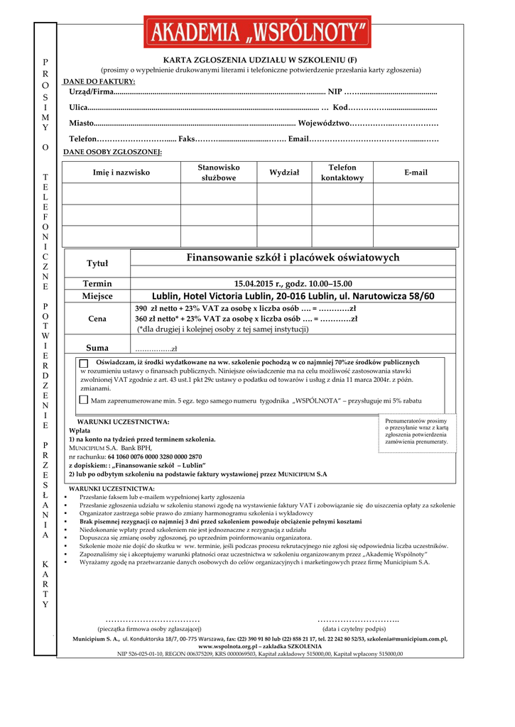P R O S I M Y KARTA ZGŁOSZENIA UDZIAŁU W SZKOLENIU (F) (prosimy o wypełnienie drukowanymi literami i telefoniczne potwierdzenie przesłania karty zgłoszenia) DANE DO FAKTURY: Urząd/Firma............................................................................................................. NIP ……........................................ Ulica................................................................................................ ....................... … Kod…………….......................... Miasto........................................................................................................ Województwo……………..……………… Telefon………………………..... Faks………..........................……. Email………………………………….......…… O DANE OSOBY ZGŁOSZONEJ: Termin Miejsce K A R T Y Cena Suma Wydział Telefon kontaktowy E-mail Finansowanie szkół i placówek oświatowych Tytuł P O T W I E R D Z E N I E P R Z E S Ł A N I A Stanowisko służbowe Imię i nazwisko T E L E 1. F O 2. N I C Z N E 15.04.2015 r., godz. 10.00–15.00 Lublin, Hotel Victoria Lublin, 20-016 Lublin, ul. Narutowicza 58/60 390 zł netto + 23% VAT za osobę x liczba osób …. = …………zł 360 zł netto* + 23% VAT za osobę x liczba osób …. = …………zł (*dla drugiej i kolejnej osoby z tej samej instytucji) …………….zł Oświadczam, iż środki wydatkowane na ww. szkolenie pochodzą w co najmniej 70%ze środków publicznych w rozumieniu ustawy o finansach publicznych. Niniejsze oświadczenie ma na celu możliwość zastosowania stawki zwolnionej VAT zgodnie z art. 43 ust.1 pkt 29c ustawy o podatku od towarów i usług z dnia 11 marca 2004r. z późn. zmianami. Mam zaprenumerowane min. 5 egz. tego samego numeru tygodnika „WSPÓLNOTA” – przysługuje mi 5% rabatu WARUNKI UCZESTNICTWA: Wpłata 1) na konto na tydzień przed terminem szkolenia. MUNICIPIUM S.A. Bank BPH, nr rachunku: 64 1060 0076 0000 3280 0000 2870 z dopiskiem: : „Finansowanie szkół – Lublin” 2) lub po odbytym szkoleniu na podstawie faktury wystawionej przez MUNICIPIUM S.A Prenumeratorów prosimy o przesyłanie wraz z kartą zgłoszenia potwierdzenia zamówienia prenumeraty. WARUNKI UCZESTNICTWA: Przesłanie faksem lub e-mailem wypełnionej karty zgłoszenia Przesłanie zgłoszenia udziału w szkoleniu stanowi zgodę na wystawienie faktury VAT i zobowiązanie się do uiszczenia opłaty za szkolenie Organizator zastrzega sobie prawo do zmiany harmonogramu szkolenia i wykładowcy Brak pisemnej rezygnacji co najmniej 3 dni przed szkoleniem powoduje obciążenie pełnymi kosztami Niedokonanie wpłaty przed szkoleniem nie jest jednoznaczne z rezygnacją z udziału Dopuszcza się zmianę osoby zgłoszonej, po uprzednim poinformowaniu organizatora. Szkolenie może nie dojść do skutku w ww. terminie, jeśli podczas procesu rekrutacyjnego nie zgłosi się odpowiednia liczba uczestników. Zapoznaliśmy się i akceptujemy warunki płatności oraz uczestnictwa w szkoleniu organizowanym przez „Akademię Wspólnoty” Wyrażamy zgodę na przetwarzanie danych osobowych do celów organizacyjnych i marketingowych przez firmę Municipium S.A. …………………………… (pieczątka firmowa osoby zgłaszającej) ……………………….. (data i czytelny podpis) Municipium S. A., ul. Konduktorska 18/7, 00-775 Warszawa, fax: (22) 390 91 80 lub (22) 858 21 17, tel. 22 242 80 52/53, [email protected], www.wspolnota.org.pl – zakładka SZKOLENIA NIP 526-025-01-10, REGON 006375209, KRS 0000069503, Kapitał zakładowy 515000,00, Kapitał wpłacony 515000,00