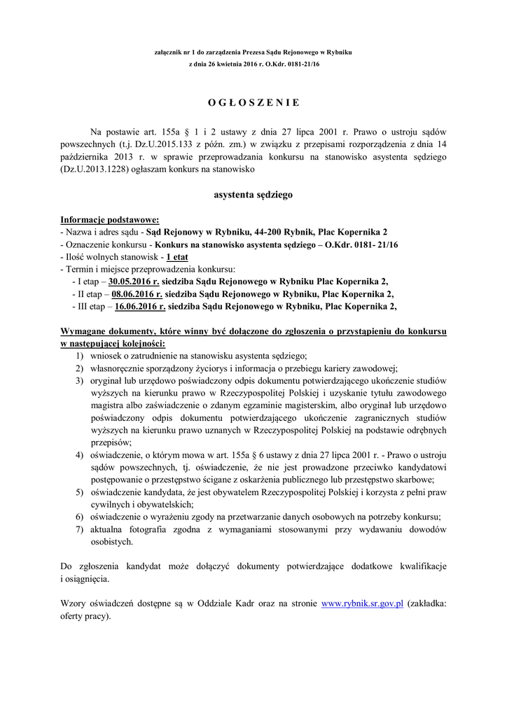 załącznik nr 1 do zarządzenia Prezesa Sądu Rejonowego w Rybniku z dnia 26 kwietnia 2016 r. O.Kdr. 0181-21/16 OGŁOSZENIE Na postawie art. 155a § 1 i 2 ustawy z dnia 27 lipca 2001 r. Prawo o ustroju sądów powszechnych (t.j. Dz.U.2015.133 z późn. zm.) w związku z przepisami rozporządzenia z dnia 14 października 2013 r. w sprawie przeprowadzania konkursu na stanowisko asystenta sędziego (Dz.U.2013.1228) ogłaszam konkurs na stanowisko asystenta sędziego Informacje podstawowe: - Nazwa i adres sądu - Sąd Rejonowy w Rybniku, 44-200 Rybnik, Plac Kopernika 2 - Oznaczenie konkursu - Konkurs na stanowisko asystenta sędziego – O.Kdr. 0181- 21/16 - Ilość wolnych stanowisk - 1 etat - Termin i miejsce przeprowadzenia konkursu: - I etap – 30.05.2016 r. siedziba Sądu Rejonowego w Rybniku Plac Kopernika 2, - II etap – 08.06.2016 r. siedziba Sądu Rejonowego w Rybniku, Plac Kopernika 2, - III etap – 16.06.2016 r. siedziba Sądu Rejonowego w Rybniku, Plac Kopernika 2, Wymagane dokumenty, które winny być dołączone do zgłoszenia o przystąpieniu do konkursu w następującej kolejności: 1) wniosek o zatrudnienie na stanowisku asystenta sędziego; 2) własnoręcznie sporządzony życiorys i informacja o przebiegu kariery zawodowej; 3) oryginał lub urzędowo poświadczony odpis dokumentu potwierdzającego ukończenie studiów wyższych na kierunku prawo w Rzeczypospolitej Polskiej i uzyskanie tytułu zawodowego magistra albo zaświadczenie o zdanym egzaminie magisterskim, albo oryginał lub urzędowo poświadczony odpis dokumentu potwierdzającego ukończenie zagranicznych studiów wyższych na kierunku prawo uznanych w Rzeczypospolitej Polskiej na podstawie odrębnych przepisów; 4) oświadczenie, o którym mowa w art. 155a § 6 ustawy z dnia 27 lipca 2001 r. - Prawo o ustroju sądów powszechnych, tj. oświadczenie, że nie jest prowadzone przeciwko kandydatowi postępowanie o przestępstwo ścigane z oskarżenia publicznego lub przestępstwo skarbowe; 5) oświadczenie kandydata, że jest obywatelem Rzeczypospolitej Polskiej i korzysta z pełni praw cywilnych i obywatelskich; 6) oświadczenie o wyrażeniu zgody na przetwarzanie danych osobowych na potrzeby konkursu; 7) aktualna fotografia zgodna z wymaganiami stosowanymi przy wydawaniu dowodów osobistych. Do zgłoszenia kandydat może dołączyć dokumenty potwierdzające dodatkowe kwalifikacje i osiągnięcia. Wzory oświadczeń dostępne są w Oddziale Kadr oraz na stronie www.rybnik.sr.gov.pl (zakładka: oferty pracy). Wymagane dokumenty i oświadczenia należy składać osobiście lub przesłać za pośrednictwem operatora świadczącego usługi pocztowe (decyduje data stempla pocztowego) w zamkniętych kopertach wraz z oznaczeniem konkursu do dnia 16 maja 2016 r. do Oddziału Kadr Sądu Rejonowego w Rybniku, Plac Kopernika 2, 44-200 Rybnik, I piętro pok. 113. Ponadto informuję, iż pracownicy Oddziału Kadr przyjmujący dokumenty aplikacyjne kandydatów nie weryfikują ich kompletności i poprawności. Zgłoszenia przesłane drogą teleinformatyczną nie będą honorowane. Dodatkowe informacje dotyczące ogłoszonego konkursu na stanowisko asystenta sędziego można uzyskać telefonicznie – (32) 43 93 104. Organizator konkursu zastrzega sobie prawo do odwołania konkursu bez podania przyczyny. Lista kandydatów dopuszczonych do drugiego etapu konkursu umieszczona zostanie w miejscu powszechnie dostępnym w siedzibie sądu oraz na stronie internetowej www.rybnik.sr.gov.pl Biuletynie Informacji Publicznej, w dniu 31 maja 2016r. Lista kandydatów dopuszczonych do trzeciego etapu konkursu oraz informacja o miejscu jego przeprowadzenia umieszczona zostanie w miejscu powszechnie dostępnym w siedzibie sądu oraz na stronie internetowej www.rybnik.sr.gov.pl - Biuletynie Informacji Publicznej, w dniu 8 czerwca 2016r. Informacje dodatkowe: Na podstawie art. 24 ustawy z dnia 29 sierpnia 1997 r. o ochronie danych osobowych (t.j. Dz. U.2015. 2135 ze zm.) informuję, iż: 1. Administratorem danych osobowych jest Prezes Sądu Rejonowego w Rybniku z siedzibą w przy ul. Pl. Kopernika 2. 2. Dane osobowe przetwarzane będą w celu przeprowadzenia i udokumentowania rekrutacji i będą podane do wiadomości publicznej na podstawie rozporządzenia Ministra Sprawiedliwości z dnia 14 października 2013 r. w sprawie przeprowadzania konkursu na stanowisko asystenta sędziego (Dz.U.2013.1228). 3. Kandydatom nadsyłającym zgłoszenie przysługuje prawo dostępu do treści swoich danych oraz ich poprawianie. 4. Podanie danych osobowych jest obowiązkowe i wynika z przepisów ustawy z dnia 26 czerwca 1974r. Kodeks pracy (t.j. Dz.U.2014.1502 z późn. zm.) oraz wydanych na jej podstawie aktów wykonawczych, a także rozporządzenia Ministra Sprawiedliwości z dnia 14 października 2013 r. w sprawie przeprowadzania konkursu na stanowisko asystenta sędziego (Dz.U.2013.1228). 5. Zgłoszenia kandydatów niezakwalifikowanych do udziału w konkursie lub jego dalszych etapów mogą zostać odebrane w Oddziale Kadr Sądu Rejonowego w Rybniku w terminie do 15 września 2016 r. Po upływie wskazanego terminu dokumenty zostaną zniszczone komisyjnie. Prezes Sądu Rejonowego w Rybniku Katarzyna Krawczyk - Mandrak