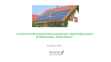 UCZESTNICTWO JEDNOSTEK SAMORZĄDU TERYTORIALNEGO W PROGRAMIE „PROSUMENT” Grudzień 2014 r. PORADNIK UCZESTNICTWA W PROGRAMIE PROSUMENT DLA GMIN o Niniejszy poradnik przeznaczony jest dla urzędników zatrudnionych w gminach, zainteresowanych programem „Prosument” Narodowego Funduszu Ochrony Środowiska i Gospodarki Wodnej (dalej Program), którzy odpowiedzialni będą za przygotowanie i wdrożenie Programu. o W niniejszym Poradniku zawarte zostały zagadnienia dzięki którym gminy powinny uzyskać informacje niezbędne do przeprowadzenia Programu. Poradnik został oparty na przykładzie wykorzystania ogniw fotowoltaicznych jako dynamicznie rozwijającego się obecnie rodzaju instalacji odnawialnych źródeł energii dla budownictwa mieszkaniowego. o Program może być realizowany przez jednostki samorządu terytorialnego lub ich związki. Jednakże, mając na uwadze możliwości organizacyjne, naszą analizę koncentrujemy wyłącznie na gminach. o Poradnik został uzupełniony o znajdującą się w załącznikach dokumentację przetargową, informację dotyczącą pomocy publicznej oraz analizę warunków programu i dostępnych informacji na temat programu Prosument, które należy analizować wspólnie z Poradnikiem. o Poradnik został przygotowany przez Instytut Agroenergetyki. I. Podstawowe informacje o projekcie Prosument II. Postępowanie krok po kroku przy organizacji projektu Prosument w gminie III. Wymagania techniczne dla instalacji IV. Wybrane pytania i odpowiedzi V. Przydatne linki/strony VI. Załączniki I. PODSTAWOWE INFORMACJE O PROJEKCIE PROSUMENT Prosument to projekt organizowany przez Narodowy Fundusz Ochrony Środowiska i Gospodarki Wodnej (NFOŚiGW) mający na celu m.in. dofinansowanie mikroinstalacji odnawialnych źródeł energii na prywatnych budynkach mieszkalnych znajdujących się w gminach biorących udział w Programie. o Na jeden budynek może zostać udzielone tylko jedno dofinansowanie. o Pożyczka wraz z dotacją łącznie do 100% kosztów kwalifikowanych instalacji. o Dotacja w wysokości 40% w przypadku instalacji wytwarzających energię elektryczną, a w przypadku instalacji składającej się z kilku źródeł 40% na część instalacji produkującą energię elektryczną (fotowoltaika, elektrownie wiatrowe, mikokogeneracja) i 20 % na część produkującą energię cieplną (kotły na biomasę, pompy ciepła, kolektory słoneczne). Wysokość dotacji zmienia się po 2015 r. (odpowiednio 30% i 15%). Program nie przewiduje dofinansowania dla przedsięwzięć polegających wyłącznie na zakupie i montażu instalacji źródeł ciepła. o Maksymalna wysokość kosztów kwalifikowanych jednostkowego przedsięwzięcia to: o dla osób fizycznych 100 tys. zł na jedno źródło OZE lub 150 tys. zł na kilka źródeł OZE; o dla spółdzielni/wspólnot mieszkaniowych (i w przypadku mikrobiogazowni) 300 tys. zł na jedno źródło OZE lub 450 tys. zł na kilka źródeł OZE o Oprocentowanie pożyczki: 1%, maksymalny okres finansowania pożyczką: 15 lat. o Wykluczenie możliwości uzyskania dofinansowania kosztów przedsięwzięcia z innych środków publicznych. o Kwota pożyczki wraz z dotacją wynosi nie mniej niż 1 mln PLN. o Nabór wniosków dla JST prowadzony jest w trybie ciągłym, rozpoczął się 26 maja 2014 r. I. Podstawowe (wybrane) informacje o projekcie Prosument II. Postępowanie krok po kroku przy organizacji projektu Prosument w gminie III. Wymagania techniczne dla instalacji IV. Wybrane pytania i odpowiedzi V. Przydatne linki/strony VI. Załączniki Etap A Etap B Etap C Przed ogłoszeniem postępowania Ogłoszenie i postępowanie przed udzieleniem zamówienia o Analiza uczestnictwa w programie o Ogłoszenie naboru dla chętnych mieszkańców o Wybór Beneficjentów Końcowych o Ogłoszenie o przetargu dla oferentów o Umowa przedwstępna z Beneficjentami Końcowymi o Określenie adresatów i zdobycie uwagi adresatów programu o Spotkanie informacyjne o Określenie kosztów o Decyzja o przystąpieniu gminy do Programu o Ustalenie kryteriów wyboru oferenta Po udzieleniu zamówienia o Wybór ofert dostawców, publikacja rozstrzygnięcia o Umowa o dostawę i montaż o Projekt Instalacji Etap D Finansowanie, dostawa i montaż o Wniosek do NFOŚiGW Etap E Okres trwałości projektu o Weryfikacja montaży o Rozliczenie Programu o Podpisanie umowy i wypłata środków o Realizacja umowy Etap A Etap B Krok 1 Analiza uczestnictwa w programie o o o o o o o o Etap C Etap D Etap E (Przed ogłoszeniem postępowania) Dla rozpoczęcia prac wskazane jest powołanie przez Wójta lub Burmistrza osoby lub zespołu odpowiedzialnej/-ego za przeprowadzenie analizy korzyści i kosztów wynikających z uczestnictwa w programie oraz realizację Programu. Dokonanie tej analizy jest niezbędne w celu podjęcia decyzji o tym czy gmina powinna/może wziąć udział w Programie. Program przewiduje wsparcie różnych rodzajów instalacji OZE, jednak ze względów praktycznych, wskazany jest wybór i skoncentrowanie się na jednej (maksymalnie dwóch) rodzajach instalacji, które gmina będzie wspierać. Przykładowo, decydując się na instalacje fotowoltaiczne, rynek oferuje nam szeroką paletę urządzeń przy relatywnie niskich kosztach inwestycyjnych związanych z uzyskaniem dofinansowania oraz możliwością sprzedaży nadwyżek wyprodukowanego prądu. W części III przedstawiamyopis techniczny instalacji, który może być wykorzystany na etapie sporządzania analizy, jak i przygotowywania dokumentacji przetargowej. Kolejną rzeczą powinna być analiza wpływu warunków lokalnych na wybór określonych instalacji, w tym np. weryfikacja informacji o nasłonecznieniu na terenie gminy. Bardzo pomocne może być doświadczenie gminy, jeżeli brała ona już udział np. w programach dofinansowania kolektorów słonecznych do ogrzewania wody użytkowej. Do przygotowania analizy przydatne będzie stworzenie listy osób i podmiotów, które brały w nich udział