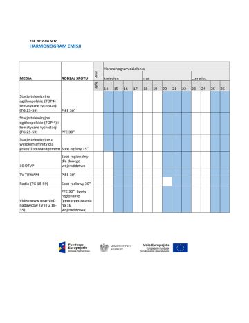 Zał. nr 2 do SOZ HARMONOGRAM EMISJI Harmonogram działania RODZAJ SPOTU msc MEDIA tydz. Stacje telewizyjne ogólnopolskie (TOP4) i tematyczne tych stacji (TG 25-59) PIFE 30” Stacje telewizyjne ogólnopolskie (TOP 4) i tematyczne tych stacji (TG 25-59) PFE 30” Stacje telewizyjne z wysokim affinity dla grupy Top Management Spot ogólny 15” 16 OTVP Spot regionalny dla danego województwa TV TRWAM PIFE 30” Radio (TG 18-59) Spot radiowy 30” Video www oraz VoD nadawców TV (TG 1835) PFE 30”, Spoty regionalne (geotargetowania na 16 województwa) kwiecień 14 15 maj 16 17 18 czerwiec 19 20 21 22 23 24 25 26